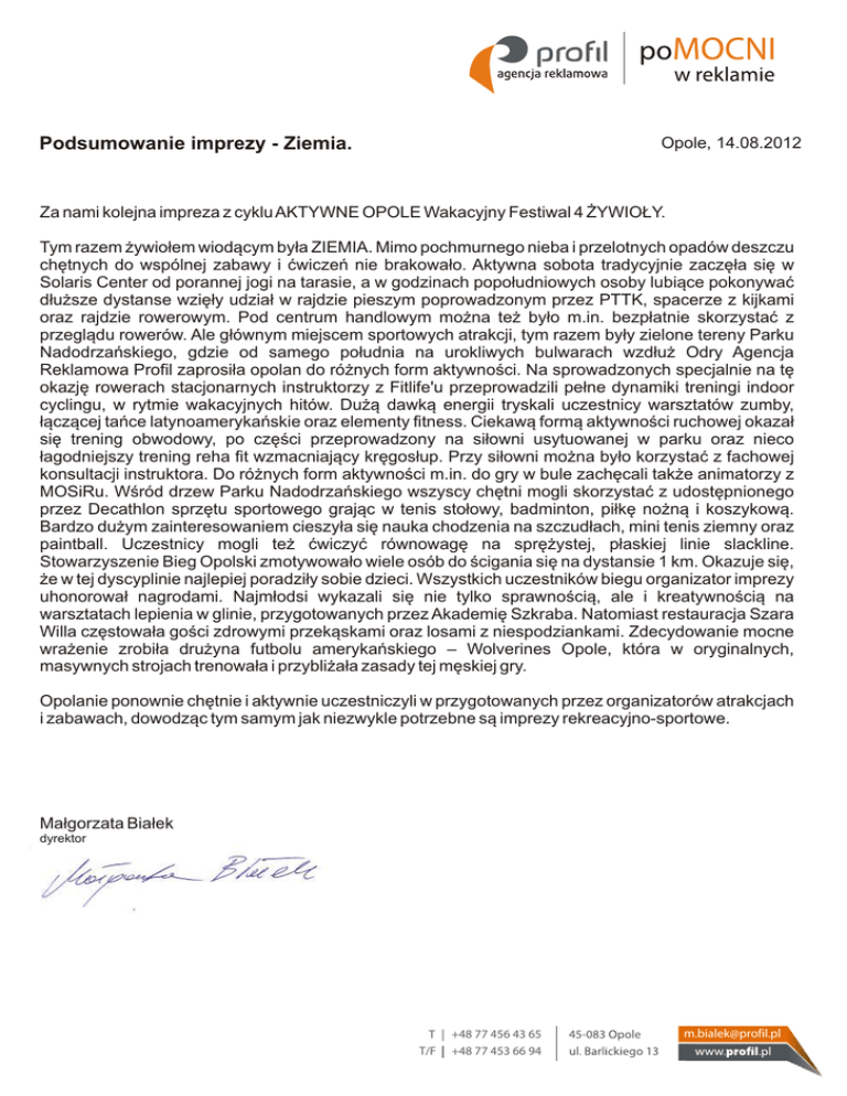 Podsumowanie imprezy - Ziemia. Opole, 14.08.2012 Za nami kolejna impreza z cyklu AKTYWNE OPOLE Wakacyjny Festiwal 4 ¯YWIO£Y. Tym razem ¿ywio³em wiod¹cym by³a ZIEMIA. Mimo pochmurnego nieba i przelotnych opadów deszczu chêtnych do wspólnej zabawy i æwiczeñ nie brakowa³o. Aktywna sobota tradycyjnie zaczê³a siê w Solaris Center od porannej jogi na tarasie, a w godzinach popo³udniowych osoby lubi¹ce pokonywaæ d³u¿sze dystanse wziê³y udzia³ w rajdzie pieszym poprowadzonym przez PTTK, spacerze z kijkami oraz rajdzie rowerowym. Pod centrum handlowym mo¿na te¿ by³o m.in. bezp³atnie skorzystaæ z przegl¹du rowerów. Ale g³ównym miejscem sportowych atrakcji, tym razem by³y zielone tereny Parku Nadodrzañskiego, gdzie od samego po³udnia na urokliwych bulwarach wzd³u¿ Odry Agencja Reklamowa Profil zaprosi³a opolan do ró¿nych form aktywnoœci. Na sprowadzonych specjalnie na tê okazjê rowerach stacjonarnych instruktorzy z Fitlife'u przeprowadzili pe³ne dynamiki treningi indoor cyclingu, w rytmie wakacyjnych hitów. Du¿¹ dawk¹ energii tryskali uczestnicy warsztatów zumby, ³¹cz¹cej tañce latynoamerykañskie oraz elementy fitness. Ciekaw¹ form¹ aktywnoœci ruchowej okaza³ siê trening obwodowy, po czêœci przeprowadzony na si³owni usytuowanej w parku oraz nieco ³agodniejszy trening reha fit wzmacniaj¹cy krêgos³up. Przy si³owni mo¿na by³o korzystaæ z fachowej konsultacji instruktora. Do ró¿nych form aktywnoœci m.in. do gry w bule zachêcali tak¿e animatorzy z MOSiRu. Wœród drzew Parku Nadodrzañskiego wszyscy chêtni mogli skorzystaæ z udostêpnionego przez Decathlon sprzêtu sportowego graj¹c w tenis sto³owy, badminton, pi³kê no¿n¹ i koszykow¹. Bardzo du¿ym zainteresowaniem cieszy³a siê nauka chodzenia na szczud³ach, mini tenis ziemny oraz paintball. Uczestnicy mogli te¿ æwiczyæ równowagê na sprê¿ystej, p³askiej linie slackline. Stowarzyszenie Bieg Opolski zmotywowa³o wiele osób do œcigania siê na dystansie 1 km. Okazuje siê, ¿e w tej dyscyplinie najlepiej poradzi³y sobie dzieci. Wszystkich uczestników biegu organizator imprezy uhonorowa³ nagrodami. Najm³odsi wykazali siê nie tylko sprawnoœci¹, ale i kreatywnoœci¹ na warsztatach lepienia w glinie, przygotowanych przez Akademiê Szkraba. Natomiast restauracja Szara Willa czêstowa³a goœci zdrowymi przek¹skami oraz losami z niespodziankami. Zdecydowanie mocne wra¿enie zrobi³a dru¿yna futbolu amerykañskiego – Wolverines Opole, która w oryginalnych, masywnych strojach trenowa³a i przybli¿a³a zasady tej mêskiej gry. Opolanie ponownie chêtnie i aktywnie uczestniczyli w przygotowanych przez organizatorów atrakcjach i zabawach, dowodz¹c tym samym jak niezwykle potrzebne s¹ imprezy rekreacyjno-sportowe. Ma³gorzata Bia³ek dyrektor T/F +48 77 456 43 65 +48 77 453 66 94 [email protected]