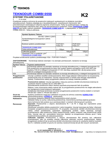 TEKNODUR COMBI 0550 K2 SYSTEMY POLIURETANOWE 9 01.04.2008 Powłokowe systemy ochronne do powierzchni stalowych wystawionych na działanie czynników atmosferycznych. Systemy składają się z dwuskładnikowych, utwardzanych chemicznie, farb poliuretanowych zawierających aktywne pigmenty antykorozyjne. Farby są szybkoschnące i nadają się do bezpośredniego malowania stali, jedno lub dwuwarstwowym systemem. Farba TEKNODUR COMBI 0550-09 jest farbą z pełnym połyskiem, TEKNODUR COMBI 0550-02 - z półpołyskiem, a TEKNODUR COMBI 0550-03 – farbą w półmacie. Symbol Systemu Teknos EN ISO 12944-5 (2007) Symbol/kategoria korozyjności/ zakres trwałości Budowa systemu powłokowego: K2a - PUR100/1FeSa 2½ K2b - PUR120/2FeSa 2½ TEKNODUR COMBI 0550 Farba poliuretanowa 1 × 100µm 2 × 60µm Całkowita grubość 100µm Zawartość VOC w systemie, g/m2 TEKNODUR COMBI 0550 88 Przykład oznakowania systemu powłokowego: K2a – PUR100/1-FeSa2½. 120µm 110 ZASTOSOWANIE: Konstrukcje stalowe wewnątrz i na zewnątrz pomieszczeń, narażone na korozję atmosferyczną. Symbol Teknos Typowe zastosowanie K2a Konstrukcje stalowe na zewnątrz narażone na korozję atmosferyczną, w kategorii korozyjności C2. Dla powierzchni przygotowanej do klasy Sa2 system spełnia wymagania normy SFS 5873 dla systemu F20.03 w kategorii korozyjności C1-C2 i dla klasy czystości St2, dla tej samej normy R25.03 w kategorii korozyjności C1-C2. K2b Konstrukcje stalowe na zewnątrz narażone na korozję atmosferyczną, w kategorii korozyjności C3. Przygotowanie Usunąć z podłoża wszelkie zanieczyszczenia, które mogą wpływać niekorzystnie na oczyszczoną powierzchni powierzchnię oraz na malowanie. Usunąć rozpuszczalne w wodzie sole stosując odpowiednie metody. Powierzchnie należy przygotować zależnie od rodzaju materiału podłoża: Powierzchnie stalowe: Usunąć zgorzelinę i rdzę przy pomocy obróbki strumieniowo-ściernej do uzyskania stopnia czystości Sa 2½ (ISO 8501-1). Zszorstkowanie powierzchni blach cienkich poprawia przyczepność farb do podłoża. Miejsce i czas czyszczenia należy wybrać tak, by przygotowana powierzchnia nie uległa zabrudzeniu lub zawilgoceniu przed kolejnymi operacjami. Dodatkowe informacje techniczne na temat przygotowania powierzchni można znaleźć w normach PN-EN ISO 12944-4 i PN-EN ISO 8501-2. Grunt do Systemy powłokowe mogą być nakładane na grunty do ochrony czasowej: KORRO PVB – czasowej ochrony poliwinylobutyralowy i KORRO E - epoksydowy. Wymieszać dokładnie składniki farby bezpośrednio przed użyciem. Nakładanie Nakładać farbę na suchą i odkurzoną powierzchnię, równomierną warstwą żądanej grubości. Dane techniczne farb podane są w poniższej tabeli i w kartach informacyjnych wyrobów. Zaprawki: Powierzchnie o stopniu skorodowania Ri 1 do Ri 3 mogą być naprawiane przez Renowacja zaprawkowanie. Zeszlifować wszystkie defekty powierzchni i ostre krawędzie. Usunąć łuszczącą się farbę i sfazować krawędzie przygotowywanej powierzchni. W przypadku stosowania obróbki strumieniowo-ściernej należy unikać powstawania uszkodzeń sąsiadującej powłoki. Jeżeli reperacja wymaga przemalowania całej powierzchni farbą nawierzchniową, należy zmatowić całą powierzchnię starej farby. Usunąć cały pył i pozostałości ścierniwa. Nałożyć na przygotowane obszary grunt i farbę nawierzchniową systemu do zalecanej grubości. Całkowita naprawa: Powierzchnie o stopniu skorodowania Ri4 powinny być całkowicie przemalowane, jako że powłoka utraciła całkowicie zdolności ochrony antykorozyjnej. Należy przygotować powierzchnię za pomocą obróbki strumieniowo-ściernej do uzyskania stopnia czystości Sa 2½ i nakładać powłoki od gruntu do warstwy nawierzchniowej tak jak dla nowych wymalowań. 1 TEKNOS Sp. z o.o. 03-797 WARSZAWA ul. Sterdyńska 1 www.teknos.pl TEL +48 22 67-87-004; FAX +48 22 67-87-995; e-mail: [email protected] ciąg dalszy na następnej stronie Dane techniczne Farba Karta Informacyjna Rodzaj farby Kolory Wygląd powłoki Nr Rozcieńczalnik Metody nakładania Dysza do natrysku hydrodynamicznego Warunki nakładania - minimalna temperatura - maks. wilg. względna Oznakowanie bezpieczeństwa Zawartość substancji stałych, objętościowo Całkowita masa substancji stałych °C % % g/l Zawartość lotnych związków organicznych, VOC g/l Zalecana grubość powłoki - na mokro - na sucho Wydajność teoretyczna Czasy schnięcia w temp. 23oC/50% wilg. wzgl. - pyłosuchość (ISO 1517:1973) - brak odlepu (ISO 53150:1995) - następne warstwy, 50% RH TEKNODUR COMBI 0550 936 farba poliuretanowa Na zamówienie, system kolorowania TEKNOMIX TEKNODUR COMBI 0550-03: półmat TEKNODUR COMBI 0550-05: półpołysk TEKNODUR COMBI 0550-09: połysk TEKNOSOLV 1640, TEKNOSOLV 9521 pędzel, natrysk powietrzny (konwencjonalny), natrysk hydrodynamiczny 0,011 - 0,017´´ +5 80 Patrz Karta Charakterystyki Preparatu Niebezpiecznego 50±2 (ISO 3233:1988) TEKNODUR COMBI 0550-03: ok. 670 g/l TEKNODUR COMBI 0550-05: ok. 670 g/l TEKNODUR COMBI 0550-09: ok. 570 g/l TEKNODUR COMBI 0550-03: ok. 440 g/l TEKNODUR COMBI 0550-05: ok. 440 g/l TEKNODUR COMBI 0550-09: ok. 500 g/l µm µm m2/l 120 200 60 100 8,3 5,0 (grubość suchej powłoki 40µm) po 1 godzinie po 3 godzinach ta sama farba : min. po 48 godz. +5°C po 24 godz. +23°C max. - Informacje zawarte w arkuszu danych opierają się o badania laboratoryjne i doświadczenia praktyczne. Są to wyłącznie dane informacyjne i zależą np. od koloru i połysku. Nie mając wpływu na stosowanie i warunki nanoszenia możemy brać odpowiedzialność wyłącznie za jakość wyrobu i gwarantować, że odpowiada on naszym normom. Nie bierzemy również odpowiedzialności za straty lub uszkodzenia powstałe w wyniku nanoszenia wyrobów niezgodnie z zaleceniami lub niewłaściwego ich użycia. 2 28 maja 2009