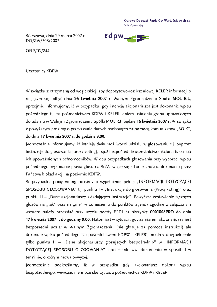 Warszawa, dnia 29 marca 2007 r. DO/ZW/708/2007 ONP/03/244 Uczestnicy KDPW W związku z otrzymaną od węgierskiej izby depozytowo-rozliczeniowej KELER informacji o mającym się odbyć dnia 26 kwietnia 2007 r. Walnym Zgromadzeniu Spółki MOL R.t., uprzejmie informujemy, iż w przypadku, gdy intencją akcjonariusza jest dokonanie wpisu pośredniego t.j. za pośrednictwem KDPW i KELER, dniem ustalenia grona uprawnionych do udziału w Walnym Zgromadzeniu Spółki MOL R.t. będzie 16 kwietnia 2007 r. W związku z powyższym prosimy o przekazanie danych osobowych za pomocą komunikatów „BOIK”, do dnia 17 kwietnia 2007 r. do godziny 9:00. Jednocześnie informujemy, iż istnieją dwie możliwości udziału w głosowaniu t.j. poprzez instrukcje do głosowania (proxy voting), bądź bezpośrednie uczestnictwo akcjonariuszy lub ich upoważnionych pełnomocników. W obu przypadkach głosowania przy wyborze wpisu pośredniego, wykonanie prawa głosu na WZA wiąże się z koniecznością dokonania przez Państwa blokad akcji na poziomie KDPW. W przypadku proxy voting prosimy o wypełnienie pełnej „INFORMACJI DOTYCZĄCEJ SPOSOBU GŁOSOWANIA” t.j. punktu I – „Instrukcje do głosowania (Proxy voting)” oraz punktu II – „Dane akcjonariuszy składających instrukcje”. Powyższe zestawienie łącznych głosów na „tak” oraz na „nie” w odniesieniu do punktów agendy zgodnie z załączonym wzorem należy przesyłać przy użyciu poczty ESDI na skrzynkę 0001008PRD do dnia 17 kwietnia 2007 r. do godziny 9:00. Natomiast w sytuacji, gdy zamiarem akcjonariusza jest bezpośredni udział w Walnym Zgromadzeniu (nie głosuje za pomocą instrukcji) ale dokonuje wpisu pośredniego (za pośrednictwem KDPW i KELER) prosimy o wypełnienie tylko punktu II – „Dane akcjonariuszy głosujących bezpośrednio” w „INFORMACJI DOTYCZĄCEJ SPOSOBU GŁOSOWANIA” i przesłanie ww. dokumentu w sposób i w terminie, o którym mowa powyżej. Jednocześnie podkreślamy, iż w przypadku gdy akcjonariusz dokona bezpośredniego, wówczas nie może skorzystać z pośrednictwa KDPW i KELER. wpisu Warunkiem wykonania proxy voting będzie również dostarczenie do Krajowego Depozytu do dnia 17 kwietnia 2007 r. oryginału upoważnienia dla przedstawicieli KELER do głosowania zgodnie z wypełnionymi instrukcjami („Power of Attorney). Ww. dokument powinien być potwierdzony przez notariusza. W tym samym terminie należy dostarczyć również deklarację własności, stanowiącą dokument potwierdzający posiadanie udziałów w kapitale zakładowym Spółki MOL R.t., co stanowi warunek wzięcia udziału w Walnym Zgromadzeniu ww. Spółki. Deklaracja ta jest dokumentem wystawianym przez akcjonariusza zgodnie z otrzymanym od KELER wzorem. W załączeniu przesyłamy otrzymaną od KELER w języku angielskim Agendę Walnego Zgromadzenia Akcjonariuszy Spółki MOL R.t., wzór upoważnienia dla przedstawicieli KELER do głosowania zgodnie z wypełnionymi instrukcjami, wzór deklaracji własności oraz wymagany przez KDPW wzór informacji dotyczącej sposobu głosowania. Z poważaniem, Dyrektor Działu Operacyjnego Krzysztof Ołdak Budapest, 26 March, 2007 MOL Hungarian Oil and Gas Public Limited Company (Budapest H-1117, Október huszonharmadika u. 18., Capital Court as Court of Registration (Budapest) Tr.: 01-10-041683) Convenes its Ordinary Annual General Meeting at 10.00 a.m. on 26 April, 2007 (Thursday) in the Danubius Thermal & Conference Hotel Helia (Budapest XIII. Kárpát u. 62-64.) The Board of Directors convenes the ordinary annual general meeting with the following agenda: 1. Closing the business year 2006: • Report of the Board of Directors on the 2006 business operation as prescribed by the Act on Accounting, presentation of the proposal for the financial statements (parent company and consolidated in compliance with International Financial Reporting Standards as adopted by the European Union (“IFRS”)) and distribution of profit after taxation. • The auditor’s report on the 2006 report, closing statement • Report of the Supervisory Board on the 2006 reports and the proposal for the distribution of profit after taxation. • Decision on the 2006 financial statements of the company as prescribed by the Act on Accounting (parent company and consolidated in compliance with IFRS), distribution of profit after taxation, amount of dividend. • Decision on the approval of the corporate governance declaration 2. Appointment of the auditor and determination of its remuneration as well as the material elements of its engagement 3. Authorization of the Board of Directors to acquire treasury shares 4. Appointment of the members of the Board of Directors, determination of their remuneration 5. Appointment of the members and employees’ representatives of the Supervisory Board, determination of their remuneration 6. Amendments of the Articles of Association • The amendment of the articles related to the dismissal of the members of the Board of Directors • Cancellations, amendments of certain articles regarding the „B” series shares • Amendments to the article relating the Company Act In case the general meeting does not have a quorum at the announced date and time, the Board of Directors convenes the repeated general meeting with the same agenda, at the same venues, on the same day (26 April, 2007) at 11.00 a.m. Such repeatedly convened general meeting shall have a quorum for issues originally put on the agenda irrespective of the number of the shareholders present or represented. Documents and proposals related to the agenda items shall be available upon verifying the shareholder’s title from 6 April, 2007 at the Share-register Office of KELER Zrt. (address: H-1075 Budapest, Asbóth u. 9-11) on any workday between 09.00 a.m. and 03.00 p.m., or can be personally taken over at the venue of the general meeting on 26 April, 2007. Conditions of participation and exercise of voting rights at th