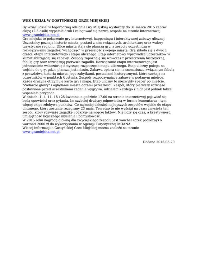 WEŹ UDZIAŁ W GOSTYŃSKIEJ GRZE MIEJSKIEJ By wziąć udział w tegorocznej odsłonie Gry Miejskiej wystarczy do 31 marca 2015 zebrać ekipę (2-5 osób) wypełnić druk i zalogować się nazwą zespołu na stronie internetowej www.gramiejska.net.pl. Gra miejska to połączenie gry internetowej, happeningu i interaktywnej zabawy ulicznej. Uczestnicy poznają historię miasta, postaci z nim związanych, architekturę oraz walory turystyczne regionu. Ulice miasta staja się planszą gry, a zespoły uczestniczą w rozwiązywaniu zagadek "wchodząc" w przeszłość swojego miasta. Gra składa się z dwóch części: etapu internetowego i etapu ulicznego. Etap internetowy wprowadza uczestników w klimat zbliżającej się zabawy. Zespoły zapoznają się wówczas z przestrzenią historyczną, fabułą gry oraz rozwiązują pierwsze zagadki. Rozwiązanie etapu internetowego jest jednocześnie wskazówką dotyczącą rozpoczęcia etapu ulicznego. Etap uliczny polega na wejściu do gry, gdzie planszą jest miasto. Zabawa opiera się na scenariuszu związanym fabułą z prawdziwą historią miasta, jego zabytkami, postaciami historycznymi, które czekają na uczestników w punktach Gostynia. Zespoły rozpoczynające zabawę w podanym miejscu. Każda drużyna otrzymuje kartę gry i mapę. Etap uliczny to niezwykły spacer po mieście. "Zadarcie głowy" i oglądanie miasta oczami przeszłości. Zespół, który pierwszy rozwiąże postawione przed uczestnikami zadania wygrywa, udziałem każdego z nich jest jednak także wspaniała przygoda. W dniach: 1, 4, 11, 18 i 25 kwietnia o godzinie 17.00 na stronie internetowej pojawiać się będą opowieści oraz pytania. Im szybciej drużyny odpowiedzą w formie komentarza - tym więcej ekipa zdobywa punktów. Co najmniej dziesięć najlepszych zespołów wejdzie do etapu ulicznego, który zostanie rozegrany 23 maja. Ten etap to nie wyścigi na czas: zwycięża ten zespół, który rozwiąże zagadkę i odkryje najwięcej faktów. Nie liczy się czas, a kreatywność, umiejętność logicznego myślenia i pomysłowość. W 2015 roku nagrodą główną dla zwycięskiego zespołu jest voucher (czek podróżny) o wartości 2000 zł do wykorzystania w Agencji Turystycznej MOANA. Więcej informacji o Gostyńskiej Grze Miejskiej można znaleźć na stronie www.gramiejska.net.pl. Dodano 2015-03-20