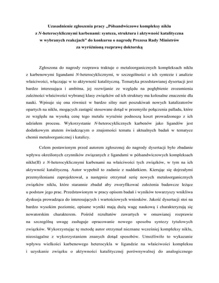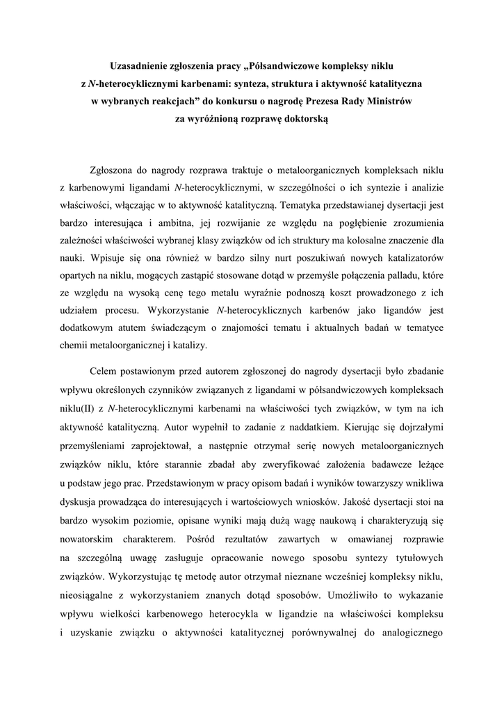 Uzasadnienie zgłoszenia pracy „Półsandwiczowe kompleksy niklu z N-heterocyklicznymi karbenami: synteza, struktura i aktywność katalityczna w wybranych reakcjach” do konkursu o nagrodę Prezesa Rady Ministrów za wyróżnioną rozprawę doktorską Zgłoszona do nagrody rozprawa traktuje o metaloorganicznych kompleksach niklu z karbenowymi ligandami N-heterocyklicznymi, w szczególności o ich syntezie i analizie właściwości, włączając w to aktywność katalityczną. Tematyka przedstawianej dysertacji jest bardzo interesująca i ambitna, jej rozwijanie ze względu na pogłębienie zrozumienia zależności właściwości wybranej klasy związków od ich struktury ma kolosalne znaczenie dla nauki. Wpisuje się ona również w bardzo silny nurt poszukiwań nowych katalizatorów opartych na niklu, mogących zastąpić stosowane dotąd w przemyśle połączenia palladu, które ze względu na wysoką cenę tego metalu wyraźnie podnoszą koszt prowadzonego z ich udziałem procesu. Wykorzystanie N-heterocyklicznych karbenów jako ligandów jest dodatkowym atutem świadczącym o znajomości tematu i aktualnych badań w tematyce chemii metaloorganicznej i katalizy. Celem postawionym przed autorem zgłoszonej do nagrody dysertacji było zbadanie wpływu określonych czynników związanych z ligandami w półsandwiczowych kompleksach niklu(II) z N-heterocyklicznymi karbenami na właściwości tych związków, w tym na ich aktywność katalityczną. Autor wypełnił to zadanie z naddatkiem. Kierując się dojrzałymi przemyśleniami zaprojektował, a następnie otrzymał serię nowych metaloorganicznych związków niklu, które starannie zbadał aby zweryfikować założenia badawcze leżące u podstaw jego prac. Przedstawionym w pracy opisom badań i wyników towarzyszy wnikliwa dyskusja prowadząca do interesujących i wartościowych wniosków. Jakość dysertacji stoi na bardzo wysokim poziomie, opisane wyniki mają dużą wagę naukową i charakteryzują się nowatorskim charakterem. Pośród rezultatów zawartych w omawianej rozprawie na szczególną uwagę zasługuje opracowanie nowego sposobu syntezy tytułowych związków. Wykorzystując tę metodę autor otrzymał nieznane wcześniej kompleksy niklu, nieosiągalne z wykorzystaniem znanych dotąd sposobów. Umożliwiło to wykazanie wpływu wielkości karbenowego heterocykla w ligandzie na właściwości kompleksu i uzyskanie związku o aktywności katalitycznej porównywalnej do analogicznego połączenia palladu. Warte podkreślenia jest również otwarcie przez autora perspektywy modyfikacji liganda karbenowego w cząsteczce kompleksu oraz otrzymanie pierwszego w swej klasie związku wykazującego równowagę spinową. Badania opisane w omawianej rozprawie znalazły uznanie środowiska naukowego o czym świadczy fakt, iż zostały opublikowane w formie trzech artykułów w renomowanych międzynarodowych periodykach naukowych. Wpływ zawartych w rozprawie badań na rozwój dziedziny, której dotyczą potwierdza również to, że wspomniane powyżej artykuły są regularnie cytowane w pracach innych naukowców działających w tematyce metaloorganicznych związków niklu z N-heterocyklicznymi karbenami. Rozprawa doktorska „Półsandwiczowe kompleksy niklu z N-heterocyklicznymi karbenami: synteza, struktura i aktywność katalityczna w wybranych reakcjach” została zgłoszona do konkursu o nagrodę Prezesa Rady Ministrów ze względu na jej bardzo wysoką jakość oraz nowatorstwo i wagę naukową zawartych w niej wyników.