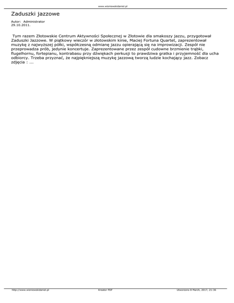 www.wisniewskidaniel.pl Zaduszki jazzowe Autor: Administrator 29.10.2011. Tym razem Złotowskie Centrum Aktywności Społecznej w Złotowie dla smakoszy jazzu, przygotował Zaduszki Jazzowe. W piątkowy wieczór w złotowskim kinie, Maciej Fortuna Quartet, zaprezentował muzykę z najwyższej półki, współczesną odmianę jazzu opierającą się na improwizacji. Zespół nie przeprowadza prób, jedynie koncertuje. Zaprezentowane przez zespół cudowne brzmienie trąbki, flugelhornu, fortepianu, kontrabasu przy dźwiękach perkusji to prawdziwa gratka i przyjemność dla ucha odbiorcy. Trzeba przyznać, że najpiękniejszą muzykę jazzową tworzą ludzie kochający jazz. Zobacz zdjęcia : ... http://www.wisniewskidaniel.pl Kreator PDF Utworzono 8 March, 2017, 21:36