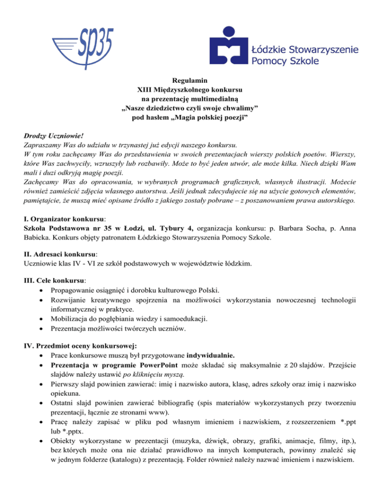 Regulamin XIII Międzyszkolnego konkursu na prezentację multimedialną „Nasze dziedzictwo czyli swoje chwalimy” pod hasłem „Magia polskiej poezji” Drodzy Uczniowie! Zapraszamy Was do udziału w trzynastej już edycji naszego konkursu. W tym roku zachęcamy Was do przedstawienia w swoich prezentacjach wierszy polskich poetów. Wierszy, które Was zachwyciły, wzruszyły lub rozbawiły. Może to być jeden utwór, ale może kilka. Niech dzięki Wam mali i duzi odkryją magię poezji. Zachęcamy Was do opracowania, w wybranych programach graficznych, własnych ilustracji. Możecie również zamieścić zdjęcia własnego autorstwa. Jeśli jednak zdecydujecie się na użycie gotowych elementów, pamiętajcie, że muszą mieć opisane źródło z jakiego zostały pobrane – z poszanowaniem prawa autorskiego. I. Organizator konkursu: Szkoła Podstawowa nr 35 w Łodzi, ul. Tybury 4, organizacja konkursu: p. Barbara Socha, p. Anna Babicka. Konkurs objęty patronatem Łódzkiego Stowarzyszenia Pomocy Szkole. II. Adresaci konkursu: Uczniowie klas IV - VI ze szkół podstawowych w województwie łódzkim. III. Cele konkursu: Propagowanie osiągnięć i dorobku kulturowego Polski. Rozwijanie kreatywnego spojrzenia na możliwości wykorzystania nowoczesnej technologii informatycznej w praktyce. Mobilizacja do pogłębiania wiedzy i samoedukacji. Prezentacja możliwości twórczych uczniów. IV. Przedmiot oceny konkursowej: Prace konkursowe muszą był przygotowane indywidualnie. Prezentacja w programie PowerPoint może składać się maksymalnie z 20 slajdów. Przejście slajdów należy ustawić po kliknięciu myszą. Pierwszy slajd powinien zawierać: imię i nazwisko autora, klasę, adres szkoły oraz imię i nazwisko opiekuna. Ostatni slajd powinien zawierać bibliografię (spis materiałów wykorzystanych przy tworzeniu prezentacji, łącznie ze stronami www). Pracę należy zapisać w pliku pod własnym imieniem i nazwiskiem, z rozszerzeniem *.ppt lub *.pptx. Obiekty wykorzystane w prezentacji (muzyka, dźwięk, obrazy, grafiki, animacje, filmy, itp.), bez których może ona nie działać prawidłowo na innych komputerach, powinny znaleźć się w jednym folderze (katalogu) z prezentacją. Folder również należy nazwać imieniem i nazwiskiem. V. Kryteria oceny prac konkursowych: Oceny prac dokona jury powołane przez organizatorów konkursu, biorąc pod uwagę: Zgodność pracy z tematem konkursu i jego regulaminem. Oryginalność przedstawienia tematu. Przejrzysty i uporządkowany układ prezentacji. Poprawność ortograficzna, stylistyczna i językowa.. Poprawność merytoryczna zamieszczonych w prezentacji informacji. Szata graficzna. Wykorzystanie możliwości programu Power Point. VII. Terminarz i zgłoszenie uczniów do konkursu: Najlepsze prace (maksymalnie 5 ze szkoły) z wypełnioną kartą zgłoszeniową należy dostarczyć do dnia 31 marca 2015 r. do sekretariatu Szkoły Podstawowej nr 35 z dopiskiem KONKURS O POLSCE lub drogą mailową na adres [email protected] Dodatkowych informacji udzielają: Anna Babicka - [email protected] oraz Barbara Socha [email protected] – w tytule maila prosimy wpisać konkurs o Polsce VIII. Sposób i termin ogłoszenia wyników: Rozstrzygnięcie konkursu i wręczenie nagród nastąpi 14 kwietnia o godz. 10.00 w Szkole Podstawowej nr 35. Wyniki zostaną również zamieszczone na stronie internetowej szkoły. IX. Nagrody: Laureaci konkursu otrzymują dyplomy oraz nagrody. Nauczyciele zostaną uhonorowani podziękowaniami. X. Uwagi końcowe: Regulamin, karta zgłoszenia – są również dostępne na stronie internetowej szkoły SP 35: www.sp35lodz.edu.pl Organizatorzy nie zwracają prac konkursowych i zastrzegają sobie prawo do ich wykorzystania dla celów edukacyjnych. KARTA ZGŁOSZENIOWA XIII MIĘDZYSZKOLNY KONKURS „NASZE DZIEDZICTWO CZYLI SWOJE CHWALIMY...” Imię i nazwisko autora; klasa 1. ............................................................................................................................................................ 2. ............................................................................................................................................................ 3. ............................................................................................................................................................ 4. ............................................................................................................................................................ 5. ............................................................................................................................................................ Imię i nazwisko nauczyciela (opiekuna pracy) .................................................................................................................................................................. E-mail nauczyciela .................................................................................................................................................................. Nazwa i adres szkoły, telefon i e-mail .................................................................................................................................................................. .................................................................................................................................................................. .................................................................................................................................................................. Pieczęć szkoły Data przyjęcia zgłoszenia pracy konkursowej ……………………………………………………….