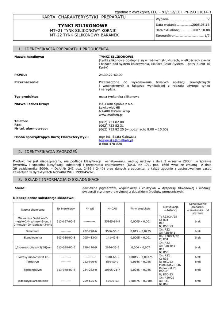 zgodnie z dyrektywą EEC – 93/112/EC i PN-ISO 11014-1 KARTA CHARAKTERYSTYKI PREPARATU Wydanie…………………….………………….V Data wydania……………….2005.05.16 TYNKI SILIKONOWE MT–21 TYNK SILIKONOWY KORNIK MT-22 TYNK SILIKONOWY BARANEK Data aktualizacji….……….2007.10.08 Strona/Stron………………………..……1/7 1. IDENTYFIKACJA PREPARATU I PRODUCENTA Nazwa handlowa: TYNKI SILIKONOWE (tynki silikonowe dostępne są w różnych strukturach, wielkościach ziarna i bazach pod system kolorowania, Malfarb Color System – patrz punkt 16 Karty) PKWiU: 24.30.22-60.00 Przeznaczenie: Przeznaczone do wykonywania trwałych i wewnętrznych o fakturze wynikającej z i narzędzia. Typ produktu: masa tynkarska silikonowa Nazwa i adres firmy: MALFARB Spółka z o.o. Lewkowiec 68 63-400 Ostrów Wlkp www.malfarb.pl Telefon: Fax: Nr tel. alarmowego: (062) 733 82 00 (062) 733 82 31 (062) 733 82 25 (w godzinach: 8.00 – 15.00) Osoba sporządzająca Kartę Charakterystyki: mgr inż. Beata Galewska [email protected] 0-600-478-820 aplikacji zewnętrznych rodzaju użytego tynku 2. IDENTYFIKACJA ZAGROŻEŃ Produkt nie jest niebezpieczny, nie podlega klasyfikacji i oznakowaniu, według ustawy z dnia 2 września 2003r w sprawie kryteriów i sposobu klasyfikacji substancji i preparatów chemicznych (Dz.U. Nr 171, poz. 1666 wraz ze zmianą z dnia 29 października 2004r. - Dz.U.Nr 243 poz. 2439 i 2440) oraz danych producenta, a także zgodnie z zastosowaniem zasad zawartych w dyrektywach 67/548/EWG i 1999/45/WE. 3. SKŁAD I INFORMACJA O SKŁADNIKACH Skład: Zawiesina pigmentów, wypełniaczy i kruszywa w dyspersji silikonowej i wodnej dyspersji styrenowo-akrylowej z dodatkiem środków pomocniczych. Niebezpieczne substancje składowe: Nazwa chemiczna Nr indeksowy Nr WE Nr CAS % w produkcie Mieszanina 5-chloro-2metylo-2H-izotiazol-3-onu i 2-metylo- 2H-izotiazol-3-onu 613-167-00-5 --------- 55965-84-9 0,0005 – 0,001 Dimetanol --------- 222-720-6 3586-55-8 0,015 – 0,0225 Etanoloamina 603-030-00-8 205-483-3 141-43-5 0,0005 – 0,001 1,2-benzoizotiazol-3(2H)-on 613-088-00-6 220-120-9 2634-33-5 0,004 – 0,007 Hydroxy monohydrat litu --------- --------- 1310-66-3 0,0015 – 0,00375 Terbutryn --------- 212-950-5 886-50-0 0,0145 – 0,025 karbendazym 613-048-00-8 234-232-0 10605-21-7 0,0245 – 0,035 jodobutylokarbaminian --------- 259-625-5 55406-53 0,00875 – 0,0105 Klasyfikacja substancji T; R23/24/25 C; R34 R43 N; R50-53 Xn; R22 Xi; R38-R41 Xn; R20/21/22 C; R34 Xn; R22 Xi; R38-R41 R43 N; R50 Xn; R22 C; R35 N; R50/53 Muta.Kat.2; R46 Repro.Kat.2; R60-61 N; R50-53 Xn; R20/22 Xi; R41 N; R50 Oznakowanie preparatu w zależności od stężenia brak brak brak brak brak brak brak brak zgodnie z dyrektywą EEC – 93/112/EC i PN-ISO 11014-1 KARTA CHARAKTERYSTYKI PREPARATU TYNKI SILIKONOWE MT–21 TYNK SILIKONOWY KORNIK MT-22 TYNK SILIKONOWY BARANEK Wydanie…………………….………………….V Data wydania……………….2005.05.16 Data aktualizacji….……….2007.10.08 Strona/Stron………………………..……2/7 4. PIERWSZA POMOC Wskazówki ogólne: Po wdychaniu: Wyprowadzić poszkodowanego z miejsca narażenia, zapewnić spokój. Nigdy nie podawać niczego doustnie osobie nieprzytomnej. W przypadku wystąpienia jakichkolwiek niepokojących objawów należy skontaktować się z lekarzem lub odwieźć poszkodowanego do szpitala, pokazać opakowanie lub etykietę. Osobę poszkodowaną wyprowadzić na świeże powietrze, okryć kocem i obserwować, w razie konieczności wezwać lekarza. Kontakt z okiem: Usunąć szkła kontaktowe. Natychmiast opłukać oko dużą ilością wody, przez przynajmniej 15 minut, podczas płukania trzymać oko szeroko otwarte, konieczna konsultacja okulistyczna. Kontakt ze skórą: Zdjąć zanieczyszczoną odzież i obuwie. Zabrudzone partie skóry spłukać dużą ilością wody z mydłem. Jeżeli wystąpiło podrażnienie skóry skontaktować się z lekarzem. Wypłukać jamę ustną wodą (nie połykać). Nie wywoływać wymiotów – istnieje ryzyko zachłyśnięcia i przedostania się substancji do płuc. Jeżeli poszkodowany jest przytomny można podać 1-2 szklanek wody do wypicia, można podać węgiel aktywny. Natychmiast wezwać lekarza. Po połknięciu: 5. POSTĘPOWANIE W PRZYPADKU POŻARU Sam produkt nie pali się, pożar w otoczeniu gasić środkami odpowiednimi dla przyczyny pożaru. Środki gaśnicze właściwe: dwutlenek węgla, proszki gaśnicze, piany, rozproszone prądy wody Środki gaśnicze zabronione: zwarty, silny strumień wody Produkty spalania i szczególne zagrożenia wynikające z właściwości produktów spalania: tlenki węgla, dwutlenek węgla, drażniące dymy i opary; rozkład termiczny może powodować tworzenie monomerów akrylowych; wyschnięty produkt jest palny Gaszenie pożaru: małe pożary gasić gaśnicą proszkową lub śniegową; duże pożary gasić pianą lub rozproszonymi prądami wody. Środki ochrony indywidualnej dla strażaków: Należy zawiadomić otoczenie o pożarze i usunąć z obszaru zagrożenia osoby niebiorące udziału w akcji ratowniczej, w razie potrzeby zarządzić ewakuację. Wezwać straż pożarną i policję. W akcji ratowniczej mogą brać udział wyłącznie osoby przeszkolone i odpowiednio wyposażone w odzież ochronną powlekaną i sprzęt ochronny: maski ochronne typu A, okulary ochronne w szczelnej obudowie, rękawice ochronne powlekane. 6. POSTĘPOWANIE W PRZYPADKU NIEZAMIERZONEGO UWOLNIENIA DO ŚRODOWISKA Indywidualne środki ostrożności: Uwaga: rozlany produkt może tworzyć śliską powierzchnię. Unikać kontaktu ze skórą i oczami. Zakładać odzież ochronną, okulary. Osoby niezabezpieczone wyprowadzić z miejsca narażenia. Zapewnić odpowiednią wentylację pomieszczeń. Środki ochrony środowiska: Nie dopuścić do przedostania się produktu do systemu kanalizacyjnego, wód gruntowych oraz gleby. Nie dpouścić do powierzchniowego rozprzestrzeniani