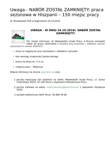 Uwaga - NABÓR ZOSTAŁ ZAMKNIĘTY: praca sezonowa w Hiszpanii – 150 miejsc pracy M. Muzalewska PUP w Wąbrzeźnie 24.10.2016 UWAGA - W DNIU 24.10.2016r. NABÓR ZOSTAŁ ZAMKNIĘTY! Tut. Urząd informuje, że Wojewódzki Urząd Pracy w Toruniu prowadzi nabór do pracy sezonowej w Hiszpanii przy sortowaniu i układaniu owoców cytrusowych w sezonie 2016/2017 • praca w magazynie przy sortowaniu i układaniu cytrusów • bez wymogu znajomości języka obcego • praca na okres ok. 3 m-cy • miejsce pracy – Walencja Więcej informacji na stronie wup.torun.pl oraz 1. pocztą tradycyjną lub osobiście na adres: Wojewódzki Urząd Pracy, ul. Szosa Chełmińska 30/32, 87-100 Toruń z dopiskiem Pośrednictwo Pracy 2. pocztą mailową na adres: [email protected] z dopiskiem Hiszpania 2016; 3. kontakt telefoniczny WUP Toruń: 56 669 39 08