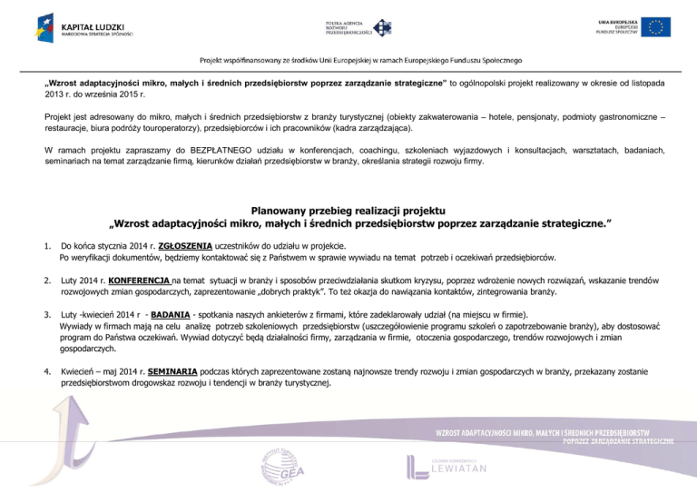 „Wzrost adaptacyjności mikro, małych i średnich przedsiębiorstw poprzez zarządzanie strategiczne” to ogólnopolski projekt realizowany w okresie od listopada 2013 r. do września 2015 r. Projekt jest adresowany do mikro, małych i średnich przedsiębiorstw z branży turystycznej (obiekty zakwaterowania – hotele, pensjonaty, podmioty gastronomiczne – restauracje, biura podróży touroperatorzy), przedsiębiorców i ich pracowników (kadra zarządzająca). W ramach projektu zapraszamy do BEZPŁATNEGO udziału w konferencjach, coachingu, szkoleniach wyjazdowych i konsultacjach, warsztatach, badaniach, seminariach na temat zarządzanie firmą, kierunków działań przedsiębiorstw w branży, określania strategii rozwoju firmy. Planowany przebieg realizacji projektu „Wzrost adaptacyjności mikro, małych i średnich przedsiębiorstw poprzez zarządzanie strategiczne.” 1. Do końca stycznia 2014 r. ZGŁOSZENIA uczestników do udziału w projekcie. Po weryfikacji dokumentów, będziemy kontaktować się z Państwem w sprawie wywiadu na temat potrzeb i oczekiwań przedsiębiorców. 2. Luty 2014 r. KONFERENCJA na temat sytuacji w branży i sposobów przeciwdziałania skutkom kryzysu, poprzez wdrożenie nowych rozwiązań, wskazanie trendów rozwojowych zmian gospodarczych, zaprezentowanie „dobrych praktyk”. To też okazja do nawiązania kontaktów, zintegrowania branży. 3. Luty -kwiecień 2014 r - BADANIA - spotkania naszych ankieterów z firmami, które zadeklarowały udział (na miejscu w firmie). Wywiady w firmach mają na celu analizę potrzeb szkoleniowych przedsiębiorstw (uszczegółowienie programu szkoleń o zapotrzebowanie branży), aby dostosować program do Państwa oczekiwań. Wywiad dotyczyć będą działalności firmy, zarządzania w firmie, otoczenia gospodarczego, trendów rozwojowych i zmian gospodarczych. 4. Kwiecień – maj 2014 r. SEMINARIA podczas których zaprezentowane zostaną najnowsze trendy rozwoju i zmian gospodarczych w branży, przekazany zostanie przedsiębiorstwom drogowskaz rozwoju i tendencji w branży turystycznej. 5. Czerwiec 2014 - kwiecień 2015 r. – SZKOLENIA WYJAZDOWE (22 dni szkoleniowe), średnia częstotliwość spotkań 1 raz w miesiącu – 2 dni (jeden zjazd), organizowane zarówno w dni robocze jak też w weekendy, czas trwania: 8 godz./dzień (9.00 - 10.30, 15 minut przerwa kawowa, 10.45 - 12.15, 45 minut przerwa obiadowa, 13.00 - 14.30, 15 minut przerwa kawowa, 14.30 -16.00) szkolenia organizowane w najlepszych hotelach: 4 i 5* w Polsce, LISTA MIEJSC SZKOLEŃ: http://strategiafirmy.pl/zarzadzanie/miejsca-szkolen/. grupy formowane z regionów poszczególnych województw. Średnia liczebność grup: 15 os/gr. uczestnicy mają zapewniony nocleg, wyżywienie oraz materiały szkoleniowe, certyfikaty potwierdzające udział w szkoleniach Lp Przybliżone terminy szkoleń Tytuł/tematyka szkolenia 1 2014-06-02-2014-06-30 1. Analiza wykonalności strategii zmiany - 1 dzień szkoleniowy 8 godz. 2. Najważniejsze aspekty zarządzania, style zarządzania, zarządzanie ryzykiem - 1 dzień szkoleniowy 8 godz. 2. 2014-07-02-2014-07-31 Zarządzanie zmianą kluczowe etapy wdrażania zmian sprawdzone modele zarządzania zmianą w firmie: 16 h = 2 dni 3 2014-08-02-2014-08-31 Prowadzenie pracowników przez zmiany, zmiana a motywacja pracowników, komunikowanie zmian - jak przełamać opór pracowników przed zmianą, 16 h = 2 dni 4 2014-09-02-2014-09-30 Zarządzanie kosztami i efektywnością 16 h = 2 dni 5 2014-10-02-2014-10-31 Wycena zmiany w kontekście zasobów finansowych, rzeczowych, kadrowych oraz potencjalnych korzyści ekonomicznych organizacyjnych, personalnych, 16 h = 2 dni 6 2014-11-02-2014-11-30 Elastyczne Formy Zatrudnienia 16 h = 2 dni 7 2014-12-02-2014-12-31 Elastyczność Wynagrodzeń, systemy motywacyjne 16 h = 2 dni 8 2015-01-02-2015-01-31 SOP- System Ocen pracowniczych, regulaminy wynagrodzeń, opisy stanowisk, korekta zakresów obowiązków, podnoszenia kwalifikacji pracowników 16 h = 2 dni 9 2015-01-02-2015-01-31 Tworzenie strategii personalnej w firmie–Rekrutacja i selekcja pracowników, profile kandydatów, Zarządzanie zespołem, delegowanie zadań i uprawnień zarządzania kompetencjami personelu 16 h = 2 dni 10 2015-02-01-2015-02-28 11 2015-03-01-2015-03-31 Wykorzystywania dobrych wzorców -nowe trendy, usługi i produkty, rozwiązania IT w branży 16 h= 2 dni Możliwości uzyskania finansowania 16 h = 2 dni KONSULTACJE - po każdym szkoleniu przewidziane są konsultacje mające na celu omówienie nabytej w trakcie szkolenia wiedzy i umiejętności, w kontekście specyfiki konkretnej firmy. Dla 30 % firm przewidziano dodatkowo: 6. 7. październik 2014 r. - marzec 2015 r. WARSZTATY - z zakresu kalkulacji ryzyka, tworzenia strategii firmy, omówienie przykładowych strategii, opracowanie wzorów dokumentów. 3 dni (8 godz./dzień), mają formę wyjazdową, uczestnicy mają zapewniony nocleg, wyżywienie , materiały szkoleniowe, certyfikaty potwierdzające udział. październik 2014 r. - wrzesień 2015 r. COACHING I OPRACOWANIE STRATEGII ROZWOJU PRZEDSIĘBIORSTWA- prowadzony na miejscu w firmie. Polega na przeprowadzeniu kompleksowej analizy przedsiębiorstwa, polegający na określeniu właściwych kierunków rozwoju firmy, kluczowych obszarów do wprowadzania zmian, słabe strony firmy, które warto ulepszyć, a także obszary już dobrze rozwinięte, których dodatkowe usprawnianie może przynieść dodatkowe korzyści, a także konkretne działania, przekładające się na wzrost dochodów firmy. Efektem końcowym coachingu będzie opracowana strategia firmy, będącą rozległą analizą firmy, opartą o wiedzę ekspercką i najnowsze techniki analiz. Eksperci bezpłatnie opracują „szytą na miarę” strategię dla Twojej firmy (opracowanie warte na rynku komercyjnym około 30 tys. PLN). Strategia będzie zawierać wskazówki, w które obszary firmy warto inwestować, obszar do zmian, konkretne rozwiąz