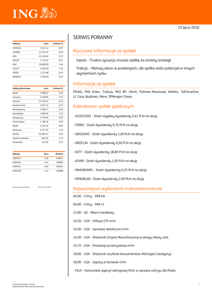 15 lipca 2016 SERWIS PORANNY Indeksy Kurs Zmiana % mWIG40 3 447.42 -0.07 sWIG80 13 234.63 0.18 WIG 45 246.26 0.51 WIG20 1 745.34 0.07 10 068.30 1.40 CAC40 4 385.50 1.16 SP500 2 157.88 0.53 NASDAQ 4 596.50 0.67 Kurs Zmiana % Banki 5 608.23 0.61 Surowce 2 400.86 3.33 Chemia DAX Kluczowe informacje ze spółek Inpost – Trudna sytuacja zmusza spółkę do zmiany strategii Trakcja – Martwy sezon w przetargach, ale spółka widzi potencjał w innych segmentach rynku Informacje ze spółek Indeksy Branżowe 13 310.54 -0.12 Budownictwo 2 631.43 0.37 Deweloperzy 1 638.17 0.26 Energetyka 2 806.66 1.53 Spożywczy 3 749.00 0.07 Informatyka 1 788.76 0.93 Media 4 232.52 -0.02 Paliwowy 4 517.33 -1.32 Polskie 45 994.11 0.52 Telekomunikacja 692.76 -1.25 Ukraińskie 472.94 0.57 Waluty Kurs Zmiana USD/PLN 3.96 -0.0027 EUR/PLN 4.41 -0.0006 CHF/PLN 4.04 -0.0023 EUR/USD 1.11 0.0008 PGNiG, PKN Orlen, Trakcja, PKO BP, Aforti, Polimex-Mostostal, Rafako, TelForceOne, LC Corp, Budimex, Mera, JPMorgan Chase. Kalendarium spółek giełdowych - ASSECOSEE - Dzień wypłaty dywidendy 0,42 PLN na akcję - FERRO - Dzień dywidendy 0,75 PLN na akcję - GRAJEWO - Dzień dywidendy 1,00 PLN na akcję - GROCLIN - Dzień dywidendy 0,50 PLN na akcję - KETY - Dzień dywidendy 18,00 PLN na akcję - KGHM - Dzień dywidendy 1,50 PLN na akcję - MAKARONPL - Dzień dywidendy 0,35 PLN na akcję - PKNORLEN - Dzień dywidendy 2,00 PLN na akcję Aktualizacja notowań: 2016-07-15 8:52 Najważniejsze wydarzenia makroekonomiczne 04:00 - Chiny - PKB k/k 04:00 - Chiny - PKB r/r 11:00 - UE - Bilans handlowy 14:30 - USA - Inflacja CPI m/m 14:30 - USA - Sprzedaż detaliczna m/m 14:30 - USA - Wskaźnik Empire Manufacturing w okręgu Nowy Jork 15:15 - USA - Produkcja przemysłowa m/m 16:00 - USA - Wskaźnik zaufania konsumentów (Michigan) (wstępny) 16:00 - USA - Zapasy w biznesie m/m - Fitch - Komunikat agencji ratingowej Fitch w sprawie ratingu dla Polski. Zespół Doradztwa i Analiz Departament Klientów Detalicznych 1 15 lipca 2016 Kluczowe informacje ze spółek Informacje ze spółek Inpost – Trudna sytuacja zmusza spółkę do zmiany strategii PGNiG oraz Orlen Upstream podpisały list intencyjny o współpracy w zakresie poszukiwania, rozpoznawania i wydobywania węglowodorów na nowych obszarach w Polsce - podał PKN Orlen w komunikacie prasowym. Spółki chcą współpracować w rejonach: Basenu Pomorskiego, Basenu Lubelskiego, Monokliny Przedsudeckiej, Bloku Gorzowa oraz Przedgórza Karpat i w Karpatach. Zarząd Spółki informuje, że w dniu 14 lipca 2016 roku podjął uchwałę, której przedmiotem jest decyzja o zakończeniu przez Spółkę i spółki zależne Spółki działalności w zakresie obsługi przesyłek listowych tradycyjnych, tj. przesyłek innych niż przesyłki e-commerce, przy czym samo zakończenie tej działalności nastąpi w terminie późniejszym, o czym Spółka poinformuje w drodze odrębnego raportu bieżącego. Spółka InPost jest spółką zależną od spółki Integer SA. Ostatni zarówno Integer jak i InPost mają dość duże problemy z osiąganiem zakładanych przychodów i zysków. Spółki mają do spłacenia dość duże kredyty w bankach, na których wiszą kowenanty. Kowenanty zakładają mi. osiąganie pozytywnego wyniku finansowego. Jeżeli Integer nie osiągnie znaczących dodatnich wyników finansowych w II kwartale 2016 rok, kowenanty mogą ulec realizacji, a co za tym idzie banki będą miały prawo do wypowiedzenia umowy kredytu. To może postawić spółkę w bardzo niekorzystnej sytuacji, włącznie z widmem bankructwa. Trakcja – Martwy sezon w przetargach, ale spółka widzi potencjał w innych segmentach rynku Obecna sytuacja na rynku inwestycji kolejowych jest "trudna", w związku z czym Trakcja zamierza skupić się na przetargach drogowych oraz energetycznych, gdzie widzi duży potencjał powiedział w rozmowie z PAP prezes Jarosław Tomaszewski. Przetargi kolejowe miały być w tym roku motorem napędowym dla spółek z sektora budownictwa kolejowego mi. Trakcji i Torpolu. Opóźnienia w rozpisywaniu przetargów, negatywnie wypływają na obie spółki. Torpol próbuje ratować się szukając kontraktów poza granicami naszego kraju mi. w Norwegii. Trakcja natomiast przyjmuje strategię zmiany sektora i angażuje się mocniej w kontrakty budownictwa drogowego, które rozpisywane są na bieżąco. Jeżeli zator związany z przetargami na kolei zostanie rozwiązany, Trakcja powinna dynamicznie zyskiwać na wartości. Półki co spółce pozostaje szukanie kontraktów w budownictwie drogowym. Obecna sytuacja na rynku inwestycji kolejowych jest "trudna", w związku z czym Trakcja zamierza skupić się na przetargach drogowych oraz energetycznych, gdzie widzi duży potencjał powiedział w rozmowie z PAP prezes Jarosław Tomaszewski. Jak dodał, obecny portfel zamówień spółki zapewnia perspektywę stabilnych przychodów. Trakcja planuje zwiększać swoją obecność na rynkach zagranicznych - na Litwie, w Szwecji i Bułgarii. Przygląda się także Ukrainie - poinformował PAP prezes Jarosław Tomaszewski. Jak dodał, na polskim rynku widać ogromną presję na marże i coraz częściej pojawiają się firmy, które chcą wygrać przetarg "za wszelką cenę". Rada nadzorcza PKO BP powołała Jana Emeryka Rościszewskiego na stanowisko wiceprezesa od dnia 18 lipca 2016 r., na bieżącą wspólną kadencję zarządu - podał bank w komunikacie. PGNiG Termika unieważniła przetarg na blok gazowo-parowy w EC Żerań, bo oferta z najniższą ceną przewyższała kwotę, którą spółka zamierzała przeznaczyć na sfinansowanie zamówienia - podała PGNiG termika na stronie internetowej. W celu realizacji zaktualizowanej strategii Aforti planuje przeznaczyć na inwestycje do końca I kwartału 2017 r. ok. 4,4 mln zł, a łącznie w latach 2016-2018 chce wydać na ten cel ok. 12,4 mln zł. Elementem realizacji strategii ma być przejście na rynek główny GPW - podała spółka w 