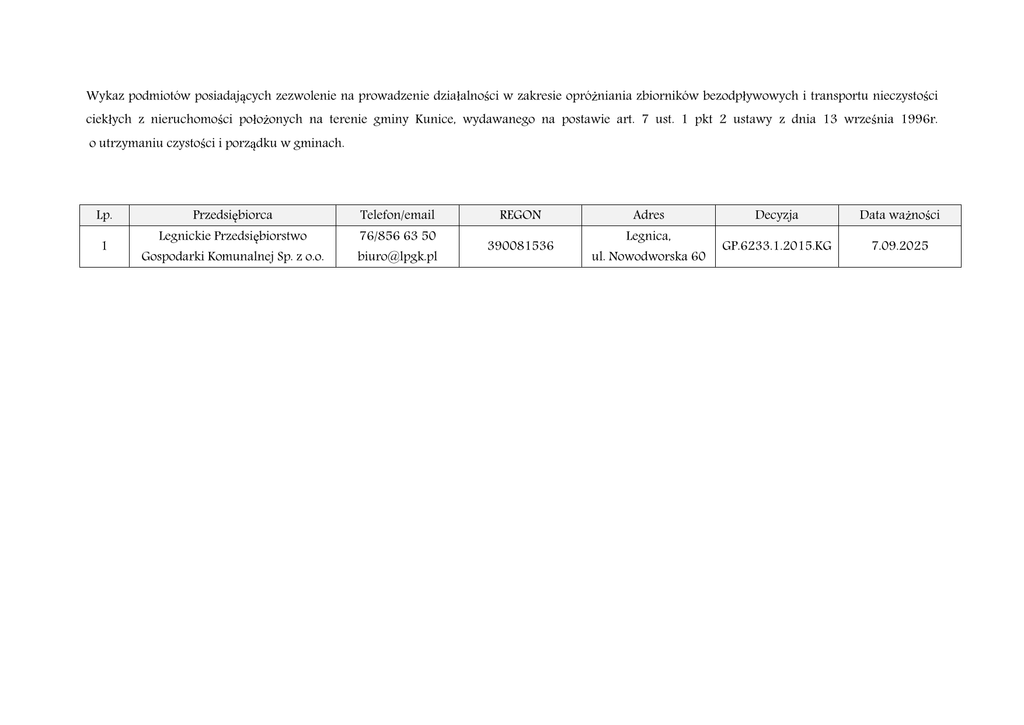 Wykaz podmiotów posiadających zezwolenie na prowadzenie działalności w zakresie opróżniania zbiorników bezodpływowych i transportu nieczystości ciekłych z nieruchomości położonych na terenie gminy Kunice, wydawanego na postawie art. 7 ust. 1 pkt 2 ustawy z dnia 13 września 1996r. o utrzymaniu czystości i porządku w gminach. Lp. 1 Przedsiębiorca Telefon/email Legnickie Przedsiębiorstwo 76/856 63 50 Gospodarki Komunalnej Sp. z o.o. [email protected] REGON 390081536 Adres Legnica, ul. Nowodworska 60 Decyzja Data ważności GP.6233.1.2015.KG 7.09.2025