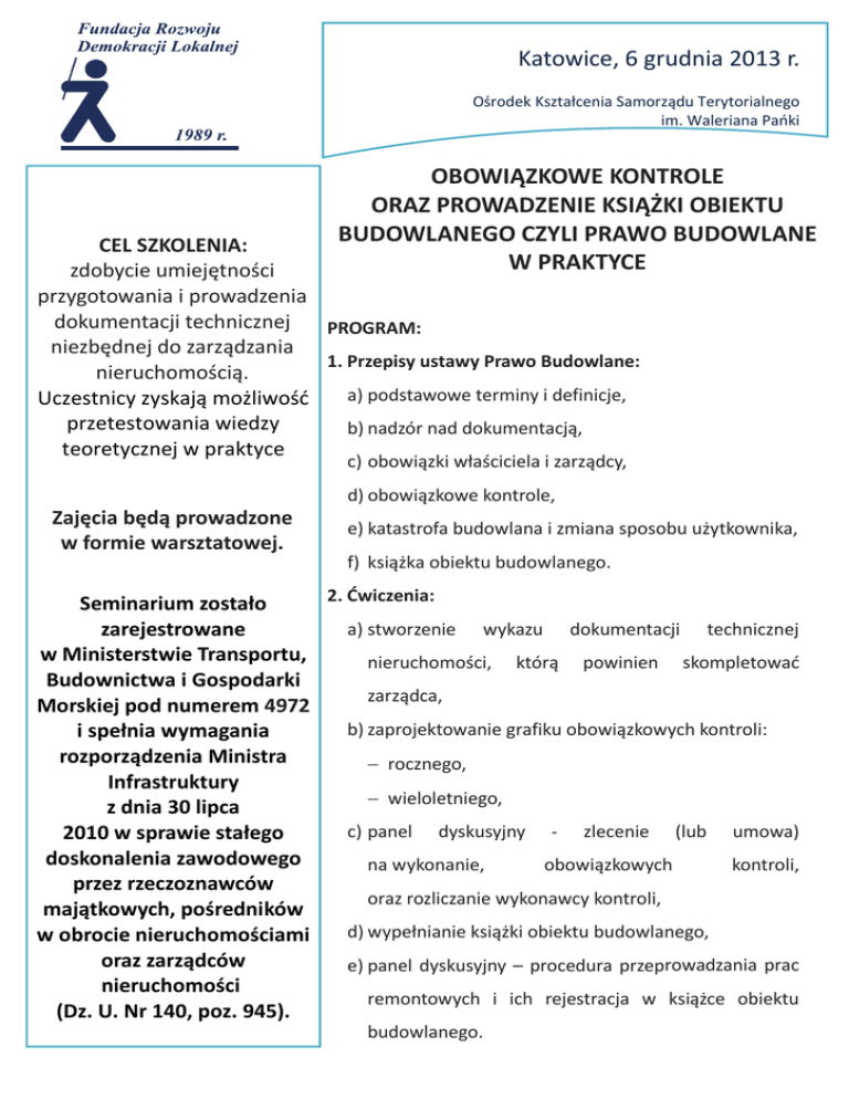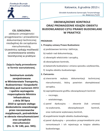RozwiązaniaKatowice, informatyczne 6 grudnia 2013 r. Ośrodek Kształcenia Samorządu Terytorialnego im. Waleriana Pańki OBOWIĄZKOWE KONTROLE ORAZ PROWADZENIE KSIĄŻKI OBIEKTU BUDOWLANEGO CZYLI PRAWO BUDOWLANE W PRAKTYCE CEL SZKOLENIA: zdobycie umiejętności przygotowania i prowadzenia dokumentacji technicznej PROGRAM: niezbędnej do zarządzania 1. Przepisy ustawy Prawo Budowlane: nieruchomością. a) podstawowe terminy i definicje, Uczestnicy zyskają możliwość przetestowania wiedzy b) nadzór nad dokumentacją, teoretycznej w praktyce c) obowiązki właściciela i zarządcy, d) obowiązkowe kontrole, Zajęcia będą prowadzone w formie warsztatowej. e) katastrofa budowlana i zmiana sposobu użytkownika, f) książka obiektu budowlanego. 2. Ćwiczenia: Seminarium zostało a) stworzenie wykazu dokumentacji technicznej zarejestrowane w Ministerstwie Transportu, nieruchomości, którą powinien skompletować Budownictwa i Gospodarki zarządca, Morskiej pod numerem 4972 b) zaprojektowanie grafiku obowiązkowych kontroli: i spełnia wymagania rozporządzenia Ministra − rocznego, Infrastruktury − wieloletniego, z dnia 30 lipca c) panel dyskusyjny - zlecenie (lub umowa) 2010 w sprawie stałego doskonalenia zawodowego na wykonanie, obowiązkowych kontroli, przez rzeczoznawców oraz rozliczanie wykonawcy kontroli, majątkowych, pośredników d) wypełnianie książki obiektu budowlanego, w obrocie nieruchomościami oraz zarządców e) panel dyskusyjny – procedura przeprowadzania prac nieruchomości remontowych i ich rejestracja w książce obiektu (Dz. U. Nr 140, poz. 945). budowlanego. SZKOLENIE SKIEROWANE DO: właścicieli nieruchomości, zarządców i zarządów wspólnot i spółdzielni mieszkaniowych, ZGN-ów i innych jednostek zajmujących się obsługą nieruchomości, pośredników w obrocie nieruchomościami, rzeczoznawców majątkowych oraz wszystkich osób zobligowanych do prowadzenia książki obiektu budowlanego D A N E D O K O N T A K T U : Ośrodek Kształcenia Samorządu Terytorialnego im. Waleriana Pańki 40-014 Katowice ul. Mariacka 1 tel/fax. 32 259 86 73, 32 253 84 09 e-mail: [email protected] Miejsce szkolenia: Katowice, siedziba Ośrodka, ul. Mariacka 1 (II piętro). Termin i godzina: 6 grudnia 2013 r. godz. 10.00 – 15.00 Cena: 299 zł netto/os. Udział w szkoleniu zwolniony z VAT w przypadku finansowania szkolenia ze środków publicznych, jak również w przypadku zgłoszeń licencjonowanych zarządców nieruchomości, pośredników w obrocie nieruchomościami oraz rzeczoznawców majątkowych. Cena zawiera materiały szkoleniowe, zaświadczenie o ukończeniu szkolenia, poczęstunek i serwis kawowy. RABAT 10% za każdą następną osobę zgłoszoną z tej samej instytucji. Zgłoszenia: Wypełnioną kartę zgłoszenia należy przesłać mailem lub faksem do 3 grudnia 2013 r. Uwaga: Ilość miejsc ograniczona. Brak pisemnej rezygnacji na 3 dni przed szkoleniem będzie równoznaczny z obciążeniem Państwa pełnym kosztem szkolenia. www.okst.pl O SO BA DO KO N T AK T U: Barbara Tekień, tel. 32 206 98 43 w. 31, [email protected] Karta zgłoszenia – kod szkolenia: 1222/13/TCH Nazwa Nabywcy (dane do FVAT):.................................................................................………………………………………… Ulica, nr domu: ........................................... Miejscowość…………………..………………kod pocztowy………….….……….. NIP: ............................................................. Tel......................................…………e-mail………………………..……………… 1. ............................................................................................................................................................................. imię i nazwisko, (wypełnić drukowanymi) nr licencji 2............................................................................................................................................................RABAT 10% imię i nazwisko, (wypełnić drukowanymi) nr licencji Oświadczam, że szkolenie dla ww. pracowników jest kształceniem zawodowym finansowanym w całości lub co najmniej 70% ze środków publicznych (właściwe zaznaczyć) TAK / NIE ......…………………………………. Podpis UWAGA! Ilość miejsc ograniczona. O udziale w szkoleniu decyduje kolejność zgłoszeń. Zgłoszenie na szkolenie musi zostać potwierdzone przesłaniem do Ośrodka karty zgłoszenia. Brak pisemnej rezygnacji ze szkoleń najpóźniej na trzy dni przed terminem jest równoznaczny z obciążeniem Państwa należnością za te szkolenia. Należność należy płacić przelewem 3 dni przed szkoleniem (nie dotyczy Jednostek Samorządu Terytorialnego). Na przelewie prosimy podać nazwę szkolenia lub jego numer. NR RACHUNKU: BPH 68-10600076-0000321000197618