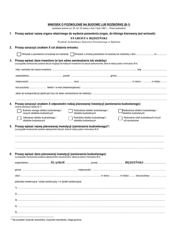 WNIOSEK O POZWOLENIE NA BUDOWĘ LUB ROZBIÓRKĘ (B-1) (podstawa prawna: art. 32 i art. 33 ustawy z dnia 7 lipca 1994 r. – Prawo budowlane) 1. Proszę wpisać nazwę organu właściwego do wydania pozwolenia (organ, do którego kierowany jest wniosek): STAROSTA BĘDZIŃSKI Wydział Architektury Starostwa Powiatowego w Będzinie 2. Proszę oznaczyć znakiem X cel złoŜenia wniosku: Wniosek o pozwolenie na budowę lub rozbiórkę Wniosek o zmianę pozwolenia na budowę lub rozbiórkę z dnia ..............................nr................. 3. Proszę wpisać dane inwestora (w tym adres zamieszkania lub siedziby): (w przypadku konieczności podania danych drugiego lub kolejnych inwestorów lub danych pełnomocnika, dane te naleŜy podać w formularzu B-4) imię i nazwisko lub nazwa inwestora: .......................................................................................................................................... kraj: ........................................ województwo: ...…………………...….….…..…… powiat: ................................................................ gmina: ................................................................................ miejscowość: ........................................................................ ulica: ..................................................................................... nr domu: ............... nr lokalu: ......... kod pocztowy: .......................... telefon / e-mail (nieobowiązkowo): …….................................................................................................................................... adres do korespondencji (jeŜeli jest inny niŜ adres zamieszkania lub siedziby): ......................................................................................................................... …………………………………………………………………………………………………………………………………………………………………………………….. 4. Proszę oznaczyć znakiem X odpowiedni rodzaj planowanej inwestycji (zamierzenia budowlanego): (moŜna zaznaczyć więcej niŜ 1) Budowa nowego obiektu budowlanego / nowych obiektów budowlanych Rozbudowa obiektu budowlanego / obiektów budowlanych Odbudowa obiektu budowlanego / obiektów budowlanych Rozbiórka obiektu budowlanego / obiektów budowlanych Nadbudowa obiektu budowlanego / obiektów budowlanych Wykonanie robót budowlanych innych niŜ wymienione 5. Proszę wpisać nazwę planowanej inwestycji (zamierzenia budowlanego)1): (w przypadku konieczności podania większej ilości danych, dane te naleŜy podać w formularzu B-4) ................................................................................................................................................................................................................................................... ................................................................................................................................................................................................................................................... ................................................................................................................................................................................................................................................... 6. Proszę wpisać dane planowanej inwestycji (zamierzenia budowlanego): (w przypadku konieczności podania większej liczby nieruchomości, naleŜy je podać w formularzu B-4) województwo: .................................. ŚLĄSKIE ........................................ powiat: .......................................... BĘDZIŃSKI .................................... gmina: ……………………………………………….………..………. miejscowość: …………....................……………………………………………………………… ulica: …………………………………………………………………………...............………… nr domu: ............... nr lokalu: ......... kod pocztowy: ……...…..……... jednostka ewidencyjna / obręb ewidencyjny / nr działki ewidencyjnej: 1) ……………………………………………………………………………………………………………………………………………………………….……………….. 2) ……………………………………………………………………………………………………………………………………………………………….……………….. 3) ……………………………………………………………………………………………………………………………………………………………….……………….. 4) ……………………………………………………………………………………………………………………………………………………………….……………….. 5) ……………………………………………………………………………………………………………………………………………………………….……………….. 1) Na przykład: budynek mieszkalny, budynek inwentarski, droga gminna. 7. Proszę wskazać załączniki do wniosku: (w przypadku konieczności wskazania większej liczby załączników, dane te naleŜy podać w formularzu B-4) 1) ........................................................................................................................................................................................................................................... 2) …………………………………………………………………………………………………………………………………………………………………………….. 3) ……
