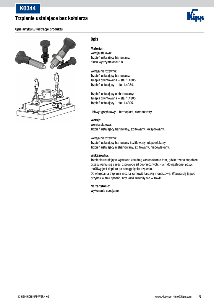 K0344 Trzpienie ustalające bez kołnierza Opis artykułu/ilustracje produktu Opis Materiał: Wersja stalowa: Trzpień ustalający hartowany: Klasa wytrzymałości 5.8. Wersja nierdzewna: Trzpień ustalający hartowany: Tulejka gwintowana – stal 1.4305. Trzpień ustalający – stal 1.4034. Trzpień ustalający niehartowany: Tulejka gwintowana – stal 1.4305. Trzpień ustalający – stal 1.4305. Uchwyt grzybkowy – termoplast, ciemnoszary. Wersja: Wersja stalowa: Trzpień ustalający hartowany, szlifowany i oksydowany. Wersja nierdzewna: Trzpień ustalający hartowany i szlifowany, niepowlekany. Trzpień ustalający niehartowany, szlifowany, niepowlekany. Wskazówka: Trzpienie ustalające wysuwne znajdują zastosowanie tam, gdzie trzeba zapobiec przesuwaniu się części z powodu sił poprzecznych. Ruch do następnej pozycji możliwy jest dopiero po odciągnięciu trzpienia. Do wkręcania trzpienia można zamówić tarczkę montażową. Wsuwa się ją pod grzybek w taki sposób, aby kołki zazębiły się w rowku. Na zapytanie: Wykonania specjalne. © HEINRICH KIPP WERK KG www.kipp.com · [email protected] 1/2 K0344 Trzpienie ustalające bez kołnierza Rysunki Trzpienie ustalające bez kołnierza, stal, trzpień hartowany Nr Zamówienia Forma G Nr Zamówienia Forma H D D1 K0344.1105 K0344.1206 K0344.1308 K0344.1410 K0344.2105 K0344.2206 K0344.2308 K0344.2410 5 6 8 10 M10x1 M12x1,5 M16X1,5 M20x1,5 D2 L L1 L2 H SW 21 25 33 33 47 56 74 80 24 28 36 40 18 22 30 30 5 6 8 10 F x 30° -/17 -/19 -/24 -/30 1,3 1,8 2,3 2,8 Siła sprężyny początek F1 ok. N 5 6 15 15 Siła sprężyny koniec F2 ok. N 12 14 35 34 Nr Zamówienia tarczka montażowa Siła sprężyny początek F1 ok. N 5 6 15 15 Siła sprężyny koniec F2 ok. N 12 14 35 34 Nr Zamówienia tarczka montażowa Siła sprężyny początek F1 ok. N 5 6 15 15 Siła sprężyny koniec F2 ok. N 12 14 35 34 Nr Zamówienia tarczka montażowa K0344.91 K0344.92 K0344.93 K0344.94 Trzpienie ustalające bez kołnierza, stal nierdzewna, trzpień hartowany Nr Zamówienia Forma G Nr Zamówienia Forma H D D1 K0344.01105 K0344.01206 K0344.01308 K0344.01410 K0344.02105 K0344.02206 K0344.02308 K0344.02410 5 6 8 10 M10x1 M12x1,5 M16X1,5 M20x1,5 D2 L L1 L2 H SW 21 25 33 33 47 56 74 80 24 28 36 40 18 22 30 30 5 6 8 10 -/17 -/19 -/24 -/30 F x 30° 1,3 1,8 2,3 2,8 K0344.91 K0344.92 K0344.93 K0344.94 Trzpienie ustalające bez kołnierza, stal nierdzewna, trzpień niehartowany Nr Zamówienia Forma G Nr Zamówienia Forma H D D1 K0344.11105 K0344.11206 K0344.11308 K0344.11410 K0344.12105 K0344.12206 K0344.12308 K0344.12410 5 6 8 10 M10x1 M12x1,5 M16X1,5 M20x1,5 © HEINRICH KIPP WERK KG D2 L L1 L2 H SW 21 25 33 33 47 56 74 80 24 28 36 40 18 22 30 30 5 6 8 10 -/17 -/19 -/24 -/30 F x 30° 1,3 1,8 2,3 2,8 K0344.91 K0344.92 K0344.93 K0344.94 www.kipp.com · [email protected] 2/2