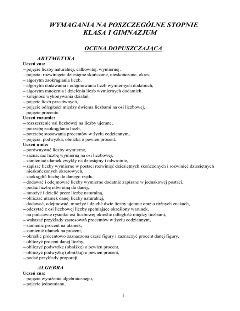 WYMAGANIA NA POSZCZEGÓLNE STOPNIE KLASA I GIMNAZJUM OCENA DOPUSZCZAJĄCA ARYTMETYKA Uczeń zna: pojęcie liczby naturalnej, całkowitej, wymiernej, pojęcia: rozwinięcie dziesiętne skończone, nieskończone, okres, algorytm zaokrąglania liczb, algorytm dodawania i odejmowania liczb wymiernych dodatnich, algorytm mnożenia i dzielenia liczb wymiernych dodatnich, kolejność wykonywania działań, pojęcie liczb przeciwnych, pojęcie odległości między dwiema liczbami na osi liczbowej, pojęcie procentu. Uczeń rozumie: rozszerzenie osi liczbowej na liczby ujemne, potrzebę zaokrąglania liczb, potrzebę stosowania procentów w życiu codziennym, pojęcia: podwyżka, obniżka o pewien procent. Uczeń umie: porównywać liczby wymierne, zaznaczać liczbę wymierną na osi liczbowej, zamieniać ułamek zwykły na dziesiętny i odwrotnie, zapisać liczby wymierne w postaci rozwinięć dziesiętnych skończonych i rozwinięć dziesiętnych nieskończonych okresowych, zaokrąglić liczbę do danego rzędu, dodawać i odejmować liczby wymierne dodatnie zapisane w jednakowej postaci, podać liczbę odwrotną do danej, mnożyć i dzielić przez liczbę naturalną, obliczać ułamek danej liczby naturalnej, dodawać, odejmować, mnożyć i dzielić dwie liczby ujemne oraz o różnych znakach, odczytać z osi liczbowej liczby spełniające określony warunek, na podstawie rysunku osi liczbowej określić odległość między liczbami, wskazać przykłady zastosowań procentów w życiu codziennym, zamienić procent na ułamek, zamienić ułamek na procent, określić procentowo zaznaczoną część figury i zaznaczyć procent danej figury, obliczyć procent danej liczby, obliczyć podwyżkę (obniżkę) o pewien procent, obliczyć podwyżkę (obniżkę) o pewien procent, podać przykłady proporcji. ALGEBRA Uczeń zna: pojęcie wyrażenia algebraicznego, pojęcie jednomianu, 1 pojęcie jednomianów podobnych, pojęcie sumy algebraicznej, pojęcie wyrazów podobnych, pojęcie równania, pojęcie rozwiązania równania, metodę równań równoważnych. Uczeń rozumie: pojęcie rozwiązania równania. Uczeń umie: budować proste wyrażenia algebraiczne, rozróżnić pojęcia: suma, różnica, iloczyn, iloraz, budować i odczytywać wyrażenia algebraiczne, obliczyć wartość liczbową wyrażenia algebraicznego bez jego przekształcenia dla zmiennych wymiernych, porządkować jednomiany, określać współczynniki liczbowe jednomianów, rozpoznać jednomiany podobne, odczytać wyrazy sumy algebraicznej, wskazać współczynniki sumy algebraicznej, wyodrębnić i zredukować wyrazy podobne w sumie algebraicznej, przemnożyć każdy wyraz sumy algebraicznej przez liczbę, zapisać zadanie w postaci równania, sprawdzić, czy dana liczba spełnia równanie, stosować metodę równań równoważnych, rozwiązywać równania posiadające jeden pierwiastek, równania sprzeczne i tożsamościowe bez stosowania przekształceń na wyrażeniach algebraicznych , opisać zbiór liczb za pomocą nierówności, zaznaczyć na osi liczbowej liczby spełniające określoną nierówność. GEOMETRIA Uczeń zna: podstawowe pojęcia: punkt, prosta, odcinek, pojęcie prostych prostopadłych i równoległych, pojęcie kąta i miary kąta, rodzaje kątów, nazwy kątów utworzonych przez dwie przecinające się proste oraz kątów utworzonych pomiędzy dwiema prostymi równoległymi przeciętymi trzecia prostą i związki pomiędzy nimi, pojęcie wielokąta, sumę miar kątów wewnętrznych trójkąta, definicję figur przystających, definicję prostokąta i kwadratu, jednostki miary pola, wzór na pole prostokąta i pole kwadratu, wzory na obliczanie pól powierzchni wielokątów, pojęcie układu współrzędnych, pojęcia punktów i figur symetrycznych względem prostej, pojęcie osi symetrii figury, pojęcie symetralnej odcinka, pojęcie dwusiecznej kąta, pojęcie punktów symetrycznych względem punktu. 2 Uczeń umie: konstruować odcinek przystający do danego, konstruować kąt przystający do danego, kreślić poszczególne rodzaje trójkątów, rozróżniać poszczególne rodzaje czworokątów, wskazać figury przystające, rysować przekątne w wielokątach, rysować wysokości czworokątów, obliczać pole prostokąta, którego boki są wyrażone w tych samych jednostkach, obliczać pola wielokątów, narysować układ współrzędnych, odczytać współrzędne punktów zaznaczonych w układzie współrzędnych, zaznaczyć punkty o danych współrzędnych, rysować odcinki w układzie współrzędnych, rozpoznawać figury symetryczne względem prostej, wykreślić punkt symetryczny do danego, rysować figury w symetrii osiowej, gdy figura i oś nie mają punktów wspólnych, podać przykłady figur, które mają oś symetrii, konstruować symetralną odcinka i dwusieczną kąta, konstrukcyjnie znajdować środek odcinka, rozpoznawać figury symetryczne względem punktu, wykreślić punkt symetryczny do danego, rysować figury w symetrii środkowej, gdy środek symetrii nie należy do figury, odnaleźć punkty symetryczne względem osi oraz początku układu współrzędnych. STATYSTYKA Uczeń zna: pojęcie diagramu procentowego. Uczeń umie: odczytać z diagramów potrzebne informacje. OCENA DOSTATECZNA *wymagania na ocenę dopuszczającą, a ponadto: ARYTMETYKA Uczeń zna: warunek konieczny zamiany ułamka zwykłego na ułamek dziesiętny skończony, sposób obliczania jakim procentem jednej liczby jest druga liczba, określenie: punkty procentowe, pojęcie proporcji i jej własności, pojęcie proporcjonalności odwrotnej. Uczeń rozumie: pojęcie zbioru liczb wymiernych, określenie punkty procentowe, pojęcie proporcjonalności prostej, różnice pomiędzy wielkościami wprost- i odwrotnie proporcjonalnymi. Uczeń umie: znajdować liczbę wymierną leżącą pomiędzy dwiema danymi na osi liczbowej, 3 porównywać liczby wymierne, szacować wyniki działań, określić na podstawie rozwinięcia dzies