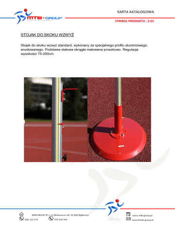 KARTA KATALOGOWA SYMBOL PRODUKTU : 2-01 STOJAK DO SKOKU WZWYŻ Stojak do skoku wzwyż standard, wykonany ze specjalnego profilu aluminiowego, anodowanego. Podstawa stalowa okrągła malowana proszkowo. Regulacja wysokości 75-200cm. MTB-GROUP SP.J. ul. Mickiewicza 40, 32-400 Myślenice 506 162 274 793 444 393 www.mtb-group.pl [email protected]