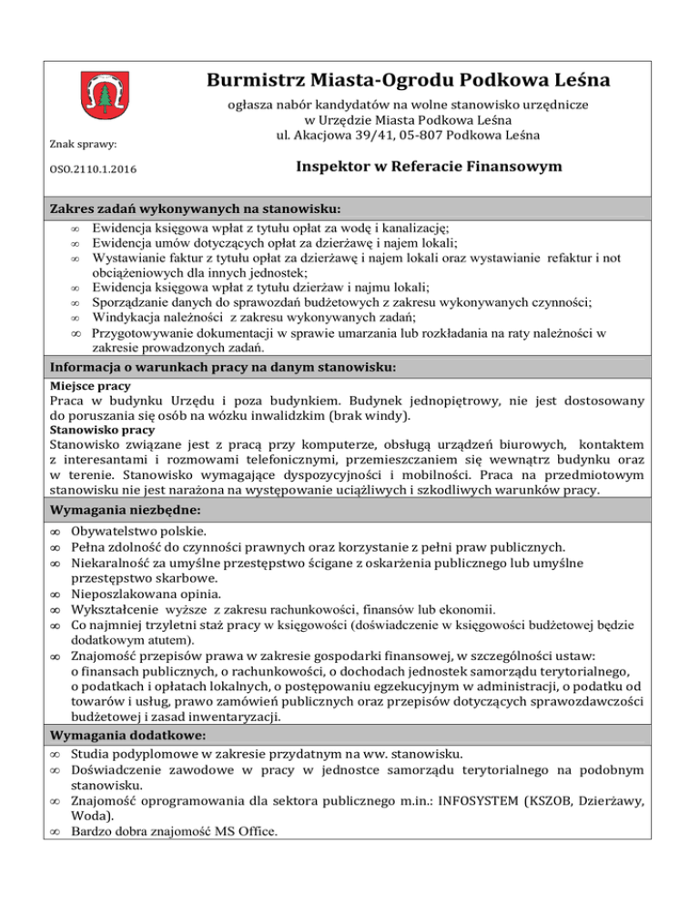 Burmistrz Miasta-Ogrodu Podkowa Leśna Znak sprawy: OSO.2110.1.2016 ogłasza nabór kandydatów na wolne stanowisko urzędnicze w Urzędzie Miasta Podkowa Leśna ul. Akacjowa 39/41, 05-807 Podkowa Leśna Inspektor w Referacie Finansowym Zakres zadań wykonywanych na stanowisku: • Ewidencja księgowa wpłat z tytułu opłat za wodę i kanalizację; • Ewidencja umów dotyczących opłat za dzierżawę i najem lokali; • Wystawianie faktur z tytułu opłat za dzierżawę i najem lokali oraz wystawianie refaktur i not obciążeniowych dla innych jednostek; • Ewidencja księgowa wpłat z tytułu dzierżaw i najmu lokali; • Sporządzanie danych do sprawozdań budżetowych z zakresu wykonywanych czynności; • Windykacja należności z zakresu wykonywanych zadań; • Przygotowywanie dokumentacji w sprawie umarzania lub rozkładania na raty należności w zakresie prowadzonych zadań. Informacja o warunkach pracy na danym stanowisku: Miejsce pracy Praca w budynku Urzędu i poza budynkiem. Budynek jednopiętrowy, nie jest dostosowany do poruszania się osób na wózku inwalidzkim (brak windy). Stanowisko pracy Stanowisko związane jest z pracą przy komputerze, obsługą urządzeń biurowych, kontaktem z interesantami i rozmowami telefonicznymi, przemieszczaniem się wewnątrz budynku oraz w terenie. Stanowisko wymagające dyspozycyjności i mobilności. Praca na przedmiotowym stanowisku nie jest narażona na występowanie uciążliwych i szkodliwych warunków pracy. Wymagania niezbędne: • • • Obywatelstwo polskie. Pełna zdolność do czynności prawnych oraz korzystanie z pełni praw publicznych. Niekaralność za umyślne przestępstwo ścigane z oskarżenia publicznego lub umyślne przestępstwo skarbowe. • Nieposzlakowana opinia. • Wykształcenie wyższe z zakresu rachunkowości, finansów lub ekonomii. • Co najmniej trzyletni staż pracy w księgowości (doświadczenie w księgowości budżetowej będzie dodatkowym atutem). • Znajomość przepisów prawa w zakresie gospodarki finansowej, w szczególności ustaw: o finansach publicznych, o rachunkowości, o dochodach jednostek samorządu terytorialnego, o podatkach i opłatach lokalnych, o postępowaniu egzekucyjnym w administracji, o podatku od towarów i usług, prawo zamówień publicznych oraz przepisów dotyczących sprawozdawczości budżetowej i zasad inwentaryzacji. Wymagania dodatkowe: • Studia podyplomowe w zakresie przydatnym na ww. stanowisku. • Doświadczenie zawodowe w pracy w jednostce samorządu terytorialnego na podobnym stanowisku. • Znajomość oprogramowania dla sektora publicznego m.in.: INFOSYSTEM (KSZOB, Dzierżawy, Woda). • Bardzo dobra znajomość MS Office. • • • Komunikatywność i umiejętność pracy w zespole. Samodzielność, dobra organizacja pracy zapewniająca terminową realizację zadań. Pożądane kompetencje: dążenie do rezultatów, rozwiązywanie problemów, umiejętności analityczne, otwartość na zmiany, radzenie sobie ze stresem, współpraca w zespole. Wskaźnik zatrudnienia osób niepełnosprawnych: W miesiącu poprzedzającym datę upublicznienia ogłoszenia wskaźnik zatrudnienia osób niepełnosprawnych w jednostce, w rozumieniu przepisów o rehabilitacji zawodowej i społecznej oraz zatrudnianiu osób niepełnosprawnych, jest niższy niż 6%. Wymagane dokumenty i oświadczenia: • List motywacyjny. • CV z informacjami o wykształceniu i opisem dotychczasowego przebiegu pracy zawodowej. • Oświadczenie o niekaralności za przestępstwo popełnione umyślnie lub przestępstwo skarbowe umyślne. • Oświadczenie o pełnej zdolności do czynności prawnych i korzystaniu z pełni praw publicznych. • Oświadczenie o wyrażeniu zgody na przetwarzanie danych osobowych do celów rekrutacji. • Kopie świadectw pracy z dotychczasowych miejsc pracy. • Kopie dokumentów potwierdzających wykształcenie i dodatkowe kwalifikacje. • Kandydat, który zamierza skorzystać z uprawnienia, o którym mowa w art.13 a ust. 2 ustawy o pracownikach samorządowych jest obowiązany do złożenia wraz z dokumentami kopii dokumentu potwierdzającego niepełnosprawność. Wymagane dokumenty rekrutacyjne mogą być składane wyłącznie w formie pisemnej, osobiście w siedzibie Urzędu lub przesłane pocztą na adres Urzędu z dopiskiem: „Dotyczy naboru na stanowisko urzędnicze Inspektor w Referacie Finansowym” w terminie do 15.02.2016 r. do godz.17.50. Dokumenty składane przez osoby ubiegające się o zatrudnienie po terminie podanym w ogłoszeniu lub nieoznaczone do jakiego naboru zostały złożone nie będą rozpatrywane. W razie przesłania przez kandydata dokumentów droga pocztową, za datę ich doręczenia do Urzędu uważa się datę wpływu do Sekretariatu Urzędu. Wymagane dokumenty rekrutacyjne tj. list motywacyjny i CV muszą być podpisane i opatrzone klauzulą „Wyrażam zgodę na przetwarzanie moich danych osobowych zawartych w ofercie pracy dla potrzeb niezbędnych do realizacji procesu rekrutacji zgodnie z ustawą z dnia 29 sierpnia 1997r. o ochronie danych osobowych (Dz. U. z 2015 r. poz. 2135) oraz ustawą z dnia 21 listopada 2008r. o pracownikach samorządowych (Dz. U. z 2014 r., poz.1202 z późn. zm.)”. Informacja o wyniku naboru będzie umieszczona na stronie internetowej Biuletynu Informacji Publicznej (www.bip.podkowalesna.pl) oraz na tablicy informacyjnej w Urzędzie. Kandydat wyłoniony w drodze naboru, przed zawarciem umowy o pracę zobowiązany jest przedłożyć: zaświadczenie lekarskie stwierdzające zdolność do pracy na stanowisku, którego nabór dotyczy, do wglądu oryginały świadectw pracy, zaświadczeń i innych dokumentów złożonych na konkurs. Podkowa Leśna, 25.01. 2016 r.