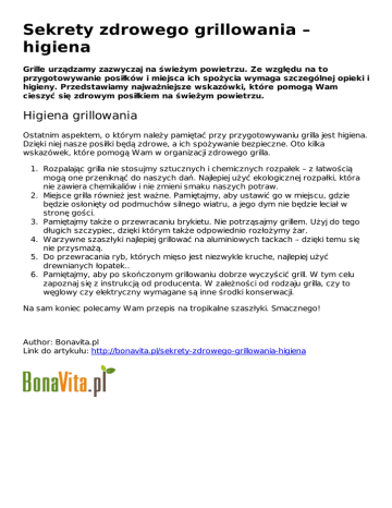 Sekrety zdrowego grillowania – higiena Grille urządzamy zazwyczaj na świeżym powietrzu. Ze względu na to przygotowywanie posiłków i miejsca ich spożycia wymaga szczególnej opieki i higieny. Przedstawiamy najważniejsze wskazówki, które pomogą Wam cieszyć się zdrowym posiłkiem na świeżym powietrzu. Higiena grillowania Ostatnim aspektem, o którym należy pamiętać przy przygotowywaniu grilla jest higiena. Dzięki niej nasze posiłki będą zdrowe, a ich spożywanie bezpieczne. Oto kilka wskazówek, które pomogą Wam w organizacji zdrowego grilla. 1. Rozpalając grilla nie stosujmy sztucznych i chemicznych rozpałek – z łatwością mogą one przeniknąć do naszych dań. Najlepiej użyć ekologicznej rozpałki, która nie zawiera chemikaliów i nie zmieni smaku naszych potraw. 2. Miejsce grilla również jest ważne. Pamiętajmy, aby ustawić go w miejscu, gdzie będzie osłonięty od podmuchów silnego wiatru, a jego dym nie będzie leciał w stronę gości. 3. Pamiętajmy także o przewracaniu brykietu. Nie potrząsajmy grillem. Użyj do tego długich szczypiec, dzięki którym także odpowiednio rozłożymy żar. 4. Warzywne szaszłyki najlepiej grillować na aluminiowych tackach – dzięki temu się nie przysmażą. 5. Do przewracania ryb, których mięso jest niezwykle kruche, najlepiej użyć drewnianych łopatek.. 6. Pamiętajmy, aby po skończonym grillowaniu dobrze wyczyścić grill. W tym celu zapoznaj się z instrukcją od producenta. W zależności od rodzaju grilla, czy to węglowy czy elektryczny wymagane są inne środki konserwacji. Na sam koniec polecamy Wam przepis na tropikalne szaszłyki. Smacznego! Author: Bonavita.pl Link do artykułu: http://bonavita.pl/sekrety-zdrowego-grillowania-higiena