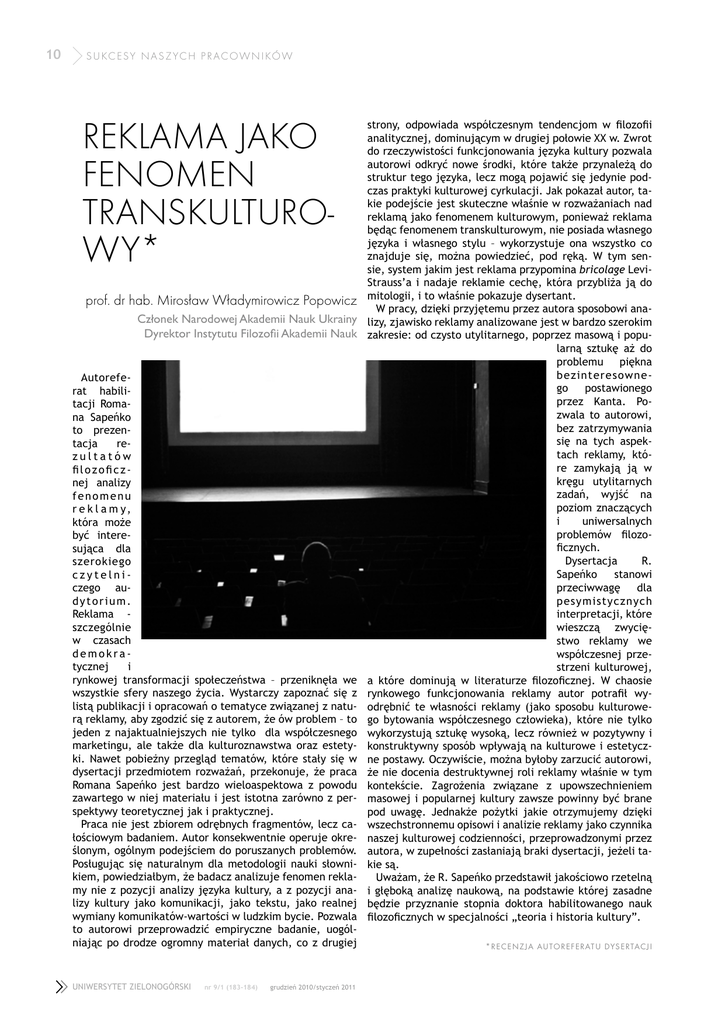 10 s u kc e s y n a s z yc h p r ac o w n i kó w Reklama jako fenomen transkulturowy* prof. dr hab. Mirosław Władymirowicz Popowicz Członek Narodowej Akademii Nauk Ukrainy Dyrektor Instytutu Filozofii Akademii Nauk Autoreferat habilitacji Romana Sapeńko to prezentacja rezultatów fi l o z o fi c z nej analizy fenomenu r e k l a m y, która może być interesująca dla szerokiego czytelniczego audytorium. Reklama szczególnie w czasach demokratycznej i rynkowej transformacji społeczeństwa – przeniknęła we wszystkie sfery naszego życia. Wystarczy zapoznać się z listą publikacji i opracowań o tematyce związanej z naturą reklamy, aby zgodzić się z autorem, że ów problem – to jeden z najaktualniejszych nie tylko dla współczesnego marketingu, ale także dla kulturoznawstwa oraz estetyki. Nawet pobieżny przegląd tematów, które stały się w dysertacji przedmiotem rozważań, przekonuje, że praca Romana Sapeńko jest bardzo wieloaspektowa z powodu zawartego w niej materiału i jest istotna zarówno z perspektywy teoretycznej jak i praktycznej. Praca nie jest zbiorem odrębnych fragmentów, lecz całościowym badaniem. Autor konsekwentnie operuje określonym, ogólnym podejściem do poruszanych problemów. Posługując się naturalnym dla metodologii nauki słownikiem, powiedziałbym, że badacz analizuje fenomen reklamy nie z pozycji analizy języka kultury, a z pozycji analizy kultury jako komunikacji, jako tekstu, jako realnej wymiany komunikatów-wartości w ludzkim bycie. Pozwala to autorowi przeprowadzić empiryczne badanie, uogólniając po drodze ogromny materiał danych, co z drugiej UNIWERSYTET ZIELONOGÓRSKI nr 9/1 (183-184) grudzień 2010/styczeń 2011 strony, odpowiada współczesnym tendencjom w filozofii analitycznej, dominującym w drugiej połowie XX w. Zwrot do rzeczywistości funkcjonowania języka kultury pozwala autorowi odkryć nowe środki, które także przynależą do struktur tego języka, lecz mogą pojawić się jedynie podczas praktyki kulturowej cyrkulacji. Jak pokazał autor, takie podejście jest skuteczne właśnie w rozważaniach nad reklamą jako fenomenem kulturowym, ponieważ reklama będąc fenomenem transkulturowym, nie posiada własnego języka i własnego stylu – wykorzystuje ona wszystko co znajduje się, można powiedzieć, pod ręką. W tym sensie, system jakim jest reklama przypomina bricolage LeviStrauss’a i nadaje reklamie cechę, która przybliża ją do mitologii, i to właśnie pokazuje dysertant. W pracy, dzięki przyjętemu przez autora sposobowi analizy, zjawisko reklamy analizowane jest w bardzo szerokim zakresie: od czysto utylitarnego, poprzez masową i popularną sztukę aż do problemu piękna bezinteresownego postawionego przez Kanta. Pozwala to autorowi, bez zatrzymywania się na tych aspektach reklamy, które zamykają ją w kręgu utylitarnych zadań, wyjść na poziom znaczących i uniwersalnych problemów filozoficznych. Dysertacja R. Sapeńko stanowi przeciwwagę dla pesymistycznych interpretacji, które wieszczą zwycięstwo reklamy we współczesnej przestrzeni kulturowej, a które dominują w literaturze filozoficznej. W chaosie rynkowego funkcjonowania reklamy autor potrafił wyodrębnić te własności reklamy (jako sposobu kulturowego bytowania współczesnego człowieka), które nie tylko wykorzystują sztukę wysoką, lecz również w pozytywny i konstruktywny sposób wpływają na kulturowe i estetyczne postawy. Oczywiście, można byłoby zarzucić autorowi, że nie docenia destruktywnej roli reklamy właśnie w tym kontekście. Zagrożenia związane z upowszechnieniem masowej i popularnej kultury zawsze powinny być brane pod uwagę. Jednakże pożytki jakie otrzymujemy dzięki wszechstronnemu opisowi i analizie reklamy jako czynnika naszej kulturowej codzienności, przeprowadzonymi przez autora, w zupełności zasłaniają braki dysertacji, jeżeli takie są. Uważam, że R. Sapeńko przedstawił jakościowo rzetelną i głęboką analizę naukową, na podstawie której zasadne będzie przyznanie stopnia doktora habilitowanego nauk filozoficznych w specjalności „teoria i historia kultury”. *recenzja autoreferatu dysertacjI