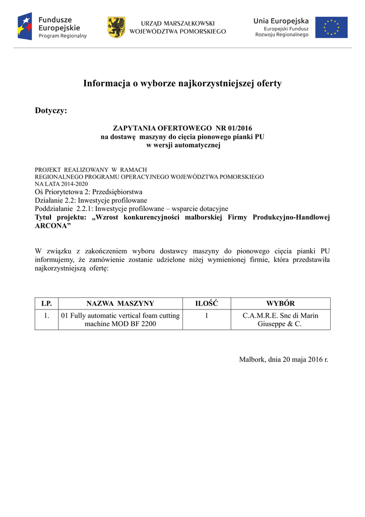 Informacja o wyborze najkorzystniejszej oferty Dotyczy: ZAPYTANIA OFERTOWEGO NR 01/2016 na dostawę maszyny do cięcia pionowego pianki PU w wersji automatycznej PROJEKT REALIZOWANY W RAMACH REGIONALNEGO PROGRAMU OPERACYJNEGO WOJEWÓDZTWA POMORSKIEGO NA LATA 2014-2020 Oś Priorytetowa 2: Przedsiębiorstwa Działanie 2.2: Inwestycje profilowane Poddziałanie 2.2.1: Inwestycje profilowane – wsparcie dotacyjne Tytuł projektu: „Wzrost konkurencyjności malborskiej Firmy Produkcyjno-Handlowej ARCONA” W związku z zakończeniem wyboru dostawcy maszyny do pionowego cięcia pianki PU informujemy, że zamówienie zostanie udzielone niżej wymienionej firmie, która przedstawiła najkorzystniejszą ofertę: LP. NAZWA MASZYNY ILOŚĆ WYBÓR 1. 01 Fully automatic vertical foam cutting machine MOD BF 2200 1 C.A.M.R.E. Snc di Marin Giuseppe & C. Malbork, dnia 20 maja 2016 r. Information about selecting the best bid Concerns: REQUEST FOR PROPOSAL NO. 01/2016 for the delivery of a vertical PU foam cutting machine in the automatic version APPLICABLE TO THE PROJECT IMPLEMENTED UNDER THE REGIONAL OPERATIONAL PROGRAMME OF THE POMORSKIE PROVINCE FOR 2014-2020 Priority axis 2: Enterprises Measure 2.2: Profiled investments Sub-measure 2.2.1: Profiled investments – grant support Project name: "Increase of the competitiveness of Firma Produkcyjno-Handlowa ARCONA, a Malbork production and retail enterprise" In connection with the completion of vendor selection for vertical cutting machine PU foam to announce that the contract will be awarded following the said company, which made the best offer ITEM DESCRIPTION QUANTITY SELECTED 1. 01 Fully automatic vertical foam cutting machine MOD BF 2200 1 C.A.M.R.E. Snc di Marin Giuseppe & C. Malbork, 20 may 2016