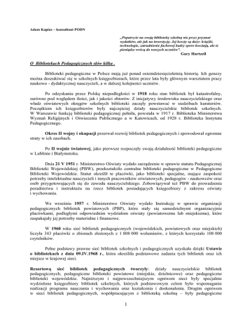 Adam Kapias – konsultant PODN „Popatrzcie na swoją bibliotekę szkolną nie przez pryzmat wydatków, ale jak na inwestycję. Jej koszty są duże: książki, technologie, zatrudnienie fachowej kadry sporo kosztują, ale te pieniądze wrócą do waszych uczniów”. Gary Hartzell O Bibliotekach Pedagogicznych słów kilka . Biblioteki pedagogiczne w Polsce mają już ponad osiemdziesięcioletnią historię. Ich genezy można doszukiwać się w szkolnych księgozbiorach, które przez lata były głównym warsztatem pracy naukowo - dydaktycznej nauczycieli, a w dalszej kolejności uczniów. Po odzyskaniu przez Polskę niepodległości w 1918 roku stan bibliotek był katastrofalny, zarówno pod względem ilości, jak i jakości zbiorów. Z inicjatywy środowiska nauczycielskiego oraz władz oświatowych okręgów szkolnych biblioteki zaczęły powstawać w siedzibach kuratoriów. Początkiem ich księgozbiorów były najczęściej działy nauczycielskie bibliotek szkolnych. W Warszawie funkcję biblioteki pedagogicznej pełniła, powstała w 1917 r. Biblioteka Ministerstwa Wyznań Religijnych i Oświecenia Publicznego a w Katowicach, od 1928 r. Biblioteka Instytutu Pedagogicznego. Okres II wojny i okupacji przerwał rozwój bibliotek pedagogicznych i spowodował ogromne straty w ich zasobach. Po II wojnie światowej, jako pierwsze rozpoczęły swoją działalność biblioteki pedagogiczne w Lublinie i Białymstoku. Dnia 21 V 1951 r. Ministerstwo Oświaty wydało zarządzenie w sprawie statutu Pedagogicznej Biblioteki Wojewódzkiej (PBW), przekształciło centralne biblioteki pedagogiczne w Pedagogiczne Biblioteki Wojewódzkie. Statut określił te placówki, jako biblioteki specjalne, mające zaspokoić potrzeby intelektualne nauczycieli i innych pracowników oświatowych, pedagogów - naukowców oraz osób przygotowujących się do zawodu nauczycielskiego. Zobowiązywał też PBW do prowadzenia poradnictwa i instruktażu na rzecz bibliotek posiadających księgozbiory z zakresu oświaty i wychowania. We wrześniu 1957 r. Ministerstwo Oświaty wydało Instrukcję w sprawie organizacji pedagogicznych bibliotek powiatowych (PBP), które stały się samodzielnymi organizacyjnie placówkami, podległymi odpowiednim wydziałom oświaty (powiatowemu lub miejskiemu), które zaspakajały jej potrzeby materialne i finansowe. W 1960 roku sieć bibliotek pedagogicznych (wojewódzkich, powiatowych oraz miejskich) liczyła 343 placówki o zbiorach złożonych z 1 808 000 woluminów, z których korzystało 108 000 czytelników. Pełne podstawy prawne sieć bibliotek szkolnych i pedagogicznych uzyskała dzięki Ustawie o bibliotekach z dnia 09.IV.1968 r., która określiła podstawowe zadania tych bibliotek oraz ich miejsce w krajowej sieci. Resortową sieć bibliotek pedagogicznych tworzyły: działy nauczycielskie bibliotek pedagogicznych, pedagogiczne biblioteki powiatowe (miejskie, dzielnicowe) oraz pedagogiczne biblioteki wojewódzkie. Najniższym i najpowszechniejszym ogniwem sieci były specjalnie wydzielone księgozbiory bibliotek szkolnych, których podstawowym celem było wspomaganie realizacji programu nauczania i wychowania oraz kształcenia i doskonalenia. Drugim ogniwem w sieci bibliotek pedagogicznych, współpracującym z biblioteką szkolną – były pedagogiczne 1 biblioteki powiatowe (PBP). Zasięgiem swojej działalności obejmowały całe powiaty. Ich zadaniem było prowadzenie bibliotecznej działalności usługowej i dydaktycznej w zakresie kształcenia i doskonalenia pracowników pedagogicznych oraz rozwijanie życia umysłowego i kulturalnego nauczycieli. Działalnością sieci bibliotek pedagogicznych na terenie województwa katowickiego kierowała Pedagogiczna Biblioteka Wojewódzka w Katowicach. Obok zadań związanych |z biblioteczną działalnością usługową, Statut PBW zobowiązywał ją do prowadzenia działalności dydaktycznej i badawczej, wydawania pedagogicznym bibliotekom powiatowym (miejskim i dzielnicowym) wytycznych i udzielania pomocy w zakresie programu pracy, pomocy szkoleniowej, bibliograficznej, a także instruktażu działom nauczycielskim bibliotek szkolnych. W roku 1970 było 349 bibliotek pedagogicznych; posiadały one 4 366 000 woluminów; 206 000 czytelników; średnia wypożyczeń na 1 czytelnika wynosiła 9,6 wol. W 1973 r. zmieniono statuty bibliotek pedagogicznych i podporządkowano ich działalność metodyczną nowo powołanemu Instytutowi Kształcenia Nauczycieli i jego odpowiednikom terenowym. W dwa lata później ponownie zmieniono przepisy dotyczące sieci bibliotek pedagogicznych dostosowując je do nowej organizacji państwa. Sieć tę stanowiły, zgodnie z nowym zarządzeniem: pedagogiczne biblioteki wojewódzkie, ich filie terenowe oraz działy nauczycielskie bibliotek szkolnych. W roku 1981 było 360 bibliotek pedagogicznych; księgozbiory liczyły 9 695 000 wol.; zarejestrowano 307 000 czytelników. Łączna liczba bibliotek pedagogicznych w Polsce w 2001 r. wynosiła 350 zaś ogólna liczba działających w Polsce bibliotek pedagogicznych w roku 2009 wynosiła 331. „Uczeń zapytał Mistrza: Czy długo trzeba oczekiwać zmiany na lepsze? Mistrz odpowiedział: Jeśli chcesz oczekiwać – to długo” Biblioteka Pedagogicza w Wodzisławiu Śląskim - zmiany Pedagogiczna Biblioteka Powiatowa w Wodzisławiu Śl. została powołana do istnienia 8.VII.1955r. Na dzień 31.XII 1955 r. stan księgozbioru wynosił 833 woluminy. Z księgozbioru korzystało 45 czytelników. W 1961 roku księgozbiór Pedagogicznej Biblioteki Powiatowej przeniesiono do gmachu Miejskiej Rady Narodowej. W 1963 roku nawiązano współpracę z Ośrodkiem Metodycznym. Stan Księgozbioru wynosił wówczas 3695 woluminów. W roku 1966 biblioteka otrzymała nowe pomieszczenie przy ulicy Wałowej 39. W 1969 r. z księgozbioru biblioteki korzystało 202 czytelników wypożyczając 916 woluminów. W 1973 przeniesiono księgozbiór PBP do nowego pomieszczenia przy ulicy 
