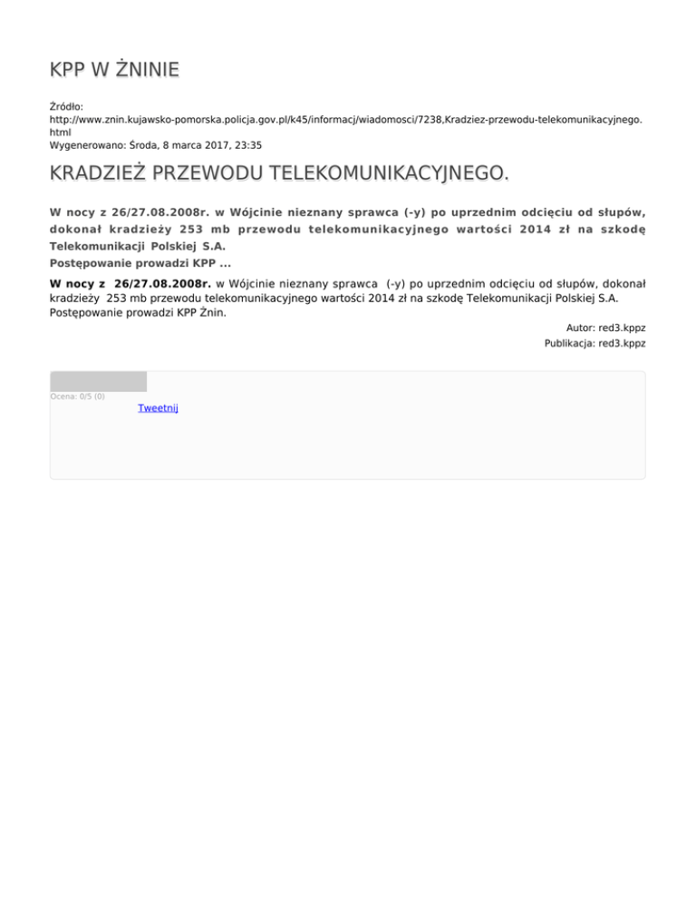 KPP W ŻNINIE Źródło: http://www.znin.kujawsko-pomorska.policja.gov.pl/k45/informacj/wiadomosci/7238,Kradziez-przewodu-telekomunikacyjnego. html Wygenerowano: Środa, 8 marca 2017, 23:35 KRADZIEŻ PRZEWODU TELEKOMUNIKACYJNEGO. W nocy z 26/27.08.2008r. w Wójcinie nieznany sprawca (-y) po uprzednim odcięciu od słupów, dokonał kradzieży 253 mb przewodu telekomunikacyjnego wartości 2014 zł na szkodę Telekomunikacji Polskiej S.A. Postępowanie prowadzi KPP ... W nocy z 26/27.08.2008r. w Wójcinie nieznany sprawca (-y) po uprzednim odcięciu od słupów, dokonał kradzieży 253 mb przewodu telekomunikacyjnego wartości 2014 zł na szkodę Telekomunikacji Polskiej S.A. Postępowanie prowadzi KPP Żnin. Autor: red3.kppz Publikacja: red3.kppz Ocena: 0/5 (0) Tweetnij