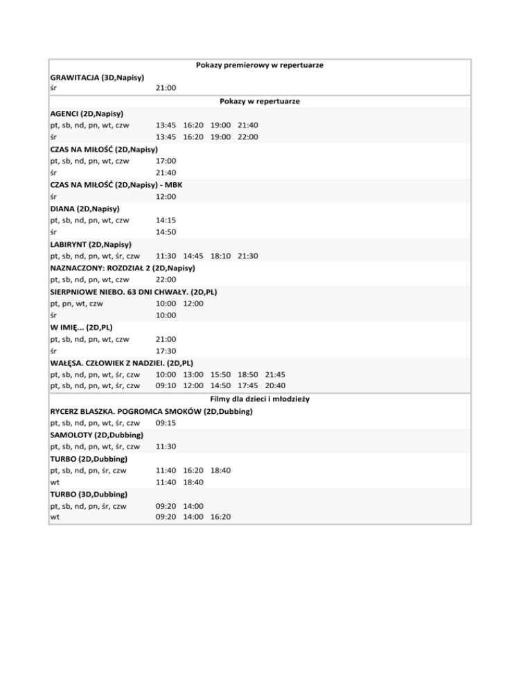 Pokazy premierowy w repertuarze GRAWITACJA (3D,Napisy) śr 21:00 Pokazy w repertuarze AGENCI (2D,Napisy) pt, sb, nd, pn, wt, czw śr 13:45 16:20 19:00 21:40 13:45 16:20 19:00 22:00 CZAS NA MIŁOŚĆ (2D,Napisy) pt, sb, nd, pn, wt, czw 17:00 śr 21:40 CZAS NA MIŁOŚĆ (2D,Napisy) - MBK śr 12:00 DIANA (2D,Napisy) pt, sb, nd, pn, wt, czw śr 14:15 14:50 LABIRYNT (2D,Napisy) pt, sb, nd, pn, wt, śr, czw 11:30 14:45 18:10 21:30 NAZNACZONY: ROZDZIAŁ 2 (2D,Napisy) pt, sb, nd, pn, wt, czw 22:00 SIERPNIOWE NIEBO. 63 DNI CHWAŁY. (2D,PL) pt, pn, wt, czw 10:00 12:00 śr 10:00 W IMIĘ... (2D,PL) pt, sb, nd, pn, wt, czw śr 21:00 17:30 WAŁĘSA. CZŁOWIEK Z NADZIEI. (2D,PL) pt, sb, nd, pn, wt, śr, czw 10:00 13:00 15:50 18:50 21:45 pt, sb, nd, pn, wt, śr, czw 09:10 12:00 14:50 17:45 20:40 Filmy dla dzieci i młodzieży RYCERZ BLASZKA. POGROMCA SMOKÓW (2D,Dubbing) pt, sb, nd, pn, wt, śr, czw 09:15 SAMOLOTY (2D,Dubbing) pt, sb, nd, pn, wt, śr, czw 11:30 TURBO (2D,Dubbing) pt, sb, nd, pn, śr, czw wt 11:40 16:20 18:40 11:40 18:40 TURBO (3D,Dubbing) pt, sb, nd, pn, śr, czw wt 09:20 14:00 09:20 14:00 16:20