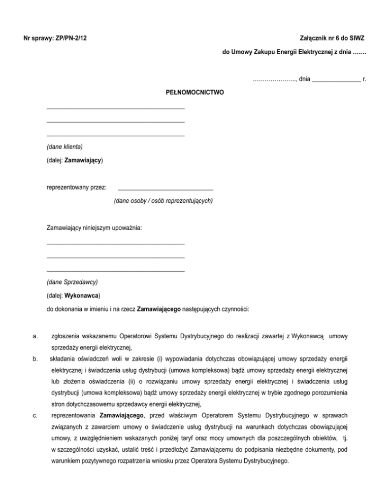Nr sprawy: ZP/PN-2/12 Załącznik nr 6 do SIWZ do Umowy Zakupu Energii Elektrycznej z dnia ……. …………………., dnia _______________ r. PEŁNOMOCNICTWO __________________________________________ __________________________________________ __________________________________________ (dane klienta) (dalej: Zamawiający) reprezentowany przez: _____________________________ (dane osoby / osób reprezentujących) Zamawiający niniejszym upoważnia: __________________________________________ __________________________________________ __________________________________________ (dane Sprzedawcy) (dalej: Wykonawca) do dokonania w imieniu i na rzecz Zamawiającego następujących czynności: a. zgłoszenia wskazanemu Operatorowi Systemu Dystrybucyjnego do realizacji zawartej z Wykonawcą umowy sprzedaży energii elektrycznej, b. składania oświadczeń woli w zakresie (i) wypowiadania dotychczas obowiązującej umowy sprzedaży energii elektrycznej i świadczenia usług dystrybucji (umowa kompleksowa) bądź umowy sprzedaży energii elektrycznej lub złożenia oświadczenia (ii) o rozwiązaniu umowy sprzedaży energii elektrycznej i świadczenia usług dystrybucji (umowa kompleksowa) bądź umowy sprzedaży energii elektrycznej w trybie zgodnego porozumienia stron dotychczasowemu sprzedawcy energii elektrycznej, c. reprezentowania Zamawiającego, przed właściwym Operatorem Systemu Dystrybucyjnego w sprawach związanych z zawarciem umowy o świadczenie usług dystrybucji na warunkach dotychczas obowiązującej umowy, z uwzględnieniem wskazanych poniżej taryf oraz mocy umownych dla poszczególnych obiektów, tj. w szczególności uzyskać, ustalić treść i przedłożyć Zamawiającemu do podpisania niezbędne dokumenty, pod warunkiem pozytywnego rozpatrzenia wniosku przez Operatora Systemu Dystrybucyjnego.
