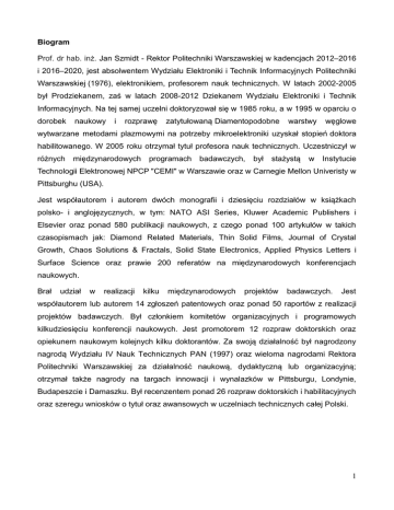 Biogram Prof. dr hab. inż. Jan Szmidt - Rektor Politechniki Warszawskiej w kadencjach 2012–2016 i 2016–2020, jest absolwentem Wydziału Elektroniki i Technik Informacyjnych Politechniki Warszawskiej (1976), elektronikiem, profesorem nauk technicznych. W latach 2002-2005 był Prodziekanem, zaś w latach 2008-2012 Dziekanem Wydziału Elektroniki i Technik Informacyjnych. Na tej samej uczelni doktoryzował się w 1985 roku, a w 1995 w oparciu o dorobek naukowy i rozprawę zatytułowaną Diamentopodobne warstwy węglowe wytwarzane metodami plazmowymi na potrzeby mikroelektroniki uzyskał stopień doktora habilitowanego. W 2005 roku otrzymał tytuł profesora nauk technicznych. Uczestniczył w różnych międzynarodowych programach badawczych, był stażystą w Instytucie Technologii Elektronowej NPCP "CEMI" w Warszawie oraz w Carnegie Mellon Univeristy w Pittsburghu (USA). Jest współautorem i autorem dwóch monografii i dziesięciu rozdziałów w książkach polsko- i anglojęzycznych, w tym: NATO ASI Series, Kluwer Academic Publishers i Elsevier oraz ponad 580 publikacji naukowych, z czego ponad 100 artykułów w takich czasopismach jak: Diamond Related Materials, Thin Solid Films, Journal of Crystal Growth, Chaos Solutions & Fractals, Solid State Electronics, Applied Physics Letters i Surface Science oraz prawie 200 referatów na międzynarodowych konferencjach naukowych. Brał udział w realizacji kilku międzynarodowych projektów badawczych. Jest współautorem lub autorem 14 zgłoszeń patentowych oraz ponad 50 raportów z realizacji projektów badawczych. Był członkiem komitetów organizacyjnych i programowych kilkudziesięciu konferencji naukowych. Jest promotorem 12 rozpraw doktorskich oraz opiekunem naukowym kolejnych kilku doktorantów. Za swoją działalność był nagrodzony nagrodą Wydziału IV Nauk Technicznych PAN (1997) oraz wieloma nagrodami Rektora Politechniki Warszawskiej za działalność naukową, dydaktyczną lub organizacyjną; otrzymał także nagrody na targach innowacji i wynalazków w Pittsburgu, Londynie, Budapeszcie i Damaszku. Był recenzentem ponad 26 rozpraw doktorskich i habilitacyjnych oraz szeregu wniosków o tytuł oraz awansowych w uczelniach technicznych całej Polski. 1
