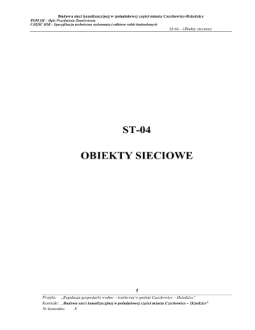 Budowa sieci kanalizacyjnej w południowej części miasta Czechowice-Dziedzice TOM III – Opis Przedmiotu Zamówienia CZĘŚĆ IIIB - Specyfikacja techniczna wykonania i odbioru robót budowlanych ST-04 – Obiekty sieciowe ST-04 OBIEKTY SIECIOWE 1 Projekt: „Regulacja gospodarki wodno – ściekowej w gminie Czechowice – Dziedzice” Kontrakt: „Budowa sieci kanalizacyjnej w południowej części miasta Czechowice – Dziedzice” Nr kontraktu X Budowa sieci kanalizacyjnej w południowej części miasta Czechowice-Dziedzice TOM III – Opis Przedmiotu Zamówienia CZĘŚĆ IIIB - Specyfikacja techniczna wykonania i odbioru robót budowlanych ST-04 – Obiekty sieciowe SPIS TREŚCI 1. WPROWADZENIE ....................................................................................................................................4 1.1. PRZEDMIOT SPECYFIKACJI.....................................................................................................................4 1.2. PRZEDMIOT I ZAKRES ROBÓT BUDOWLANYCH .......................................................................................4 1.3. NAZWY I KODY CPV DLA PRZEWIDZIANYCH ROBÓT BUDOWLANYCH. ..................................................4 1.4. OKREŚLENIA PODSTAWOWE ..................................................................................................................4 2. WYMAGANIA DOTYCZĄCE WŁAŚCIWOŚCI WYROBÓW BUDOWLANYCH..........................5 2.1. WYMAGANIA OGÓLNE ...........................................................................................................................5 2.2. MATERIAŁY ...........................................................................................................................................5 2.2.1. Studnie rewizyjne, komory prefabrykowane z polimerobetonu .................................................5 2.2.2. Studzienki niewłazowe z tworzyw sztucznych ............................................................................6 2.2.3. Wyposażenie Przepompowni .....................................................................................................7 2.2.3.1 Pompy ........................................................................................................................................... 7 2.2.3.2. Układ sterowania ......................................................................................................................... 8 2.2.3.3. Układ monitoringu pracy przepompowni..................................................................................... 8 2.2.4. Beton..........................................................................................................................................9 2.2.5. Materiał na podsypkę, obsypkę i zasypkę wstępną ....................................................................9 3. SPRZĘT I MASZYNY BUDOWLANE ....................................................................................................9 4. TRANSPORT ..............................................................................................................................................9 5. WYMAGANIA DOTYCZĄCE WYKONANIA ROBÓT BUDOWLANYCH ................................... 11 5.1. OGÓLNE WARUNKI WYKONANIA ROBÓT BUDOWLANYCH .................................................................... 11 5.2. SZCZEGÓŁOWE WARUNKI WYKONANIA ROBÓT BUDOWLANYCH.......................................................... 11 5.2.1. Prace przygotowawcze i roboty ziemne ................................................................................... 11 5.2.2. Zabezpieczenie drzew .............................................................................................................. 11 5.2.3. Posadowienie i wznoszenie obiektów sieciowych .................................................................... 11 5.2.4. Studzienki kanalizacyjne polimerobetonowe .......................................................................... 11 Montaż studni polimerobetonowych ................................................................................................... 12 5.2.4.1. STUDNIE DO ODWODNIENIA RUROCIĄGU TŁOCZNEGO ................................................................... 13 5.2.4.2. STUDNIE Z ZAWOREM NAPOWIETRZAJĄCO-ODPOWIETRZAJĄCYM NA RUROCIĄGU TŁOCZNYM ........ 13 5.2.5. Studzienki z tworzyw sztucznych (niewłazowe)........................................................................ 13 5.2.6. Pompownie ścieków z komorami zasuw .................................................................................. 14 5.2.7. Zbiorniki retencyjne ścieków ................................................................................................... 15 5.3. SZCZEGÓŁOWE USTALENIA ZAKRESU WYKONANIA ROBÓT .................................................................. 15 5.3.1. Studnie rewizyjne, połączeniowe, przelotowe i kaskadowe ..................................................... 15 5.3.2. Studzienki przyłączeniowe ....................................................................................................... 15 5.3.3. Kanały retencyjne .................................................................................................................... 16 5.3.4. Przepompownie ....................................................................................................................... 16 5.3.4.1 PRZEPOMPOWNIA P83 PRZY UL. KLONOWEJ/POCZTOWEJ .............................................................. 17 5.3.4.3 PRZEPOMPOWNIA P81 PRZY UL. DROZDÓW ................................................................................... 18 5.3.4.4 PRZEPOMPOWNIA P80 PRZY UL. PASIEKI ....................................................................................... 18 5.3.4.5 PRZEPOMPOWNIA P79 PRZY UL. KOŚCIELNEJ ................................................................................ 19 5.3.4.6 PRZEPOMPOWNIA 