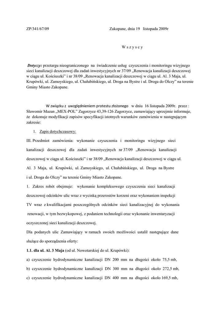 ZP/341/67/09 Zakopane, dnia 19 listopada 2009r Wszyscy Dotyczy: przetargu nieograniczonego na świadczenie usług czyszczenia i monitoringu wizyjnego sieci kanalizacji deszczowej dla zadań inwestycyjnych nr 37/09 „Renowacja kanalizacji deszczowej w ciągu ul. Kościuszki” i nr 38/09 „Renowacja kanalizacji deszczowej w ciągu ul. Al. 3 Maja, ul. Krupówki, ul. Zamoyskiego, ul. Chałubińskiego, ul. Droga na Bystre i ul. Droga do Olczy” na terenie Gminy Miasto Zakopane. W związku z uwzględnieniem protestu złożonego w dniu 16 listopada 2009r. przez : Sławomir Mazan „MEX-POL” Zagorzyce 43,39-126 Zagorzyce, zamawiający uprzejmie informuje, Ŝe dokonuje modyfikacji zapisów specyfikacji istotnych warunków zamówienia w następującym zakresie: 1. Zapis dotychczasowy: III. Przedmiot zamówienia: wykonanie czyszczenia i monitoringu wizyjnego sieci kanalizacji deszczowej dla zadań inwestycyjnych nr 37/09 „Renowacja kanalizacji deszczowej w ciągu ul. Kościuszki” i nr 38/09 „Renowacja kanalizacji deszczowej w ciągu ul. Al. 3 Maja, ul. Krupówki, ul. Zamoyskiego, ul. Chałubińskiego, ul. Droga na Bystre i ul. Droga do Olczy” na terenie Gminy Miasto Zakopane. 1. Zakres robót obejmuje: wykonanie kompleksowego czyszczenia sieci kanalizacji deszczowej odcinków ulic wraz z wycinką przerostów korzeni oraz wykonaniem inspekcji TV wraz z kwalifikacjami poszczególnych odcinków sieci kanalizacyjnej do wykonania renowacji, w tym bezwykopowej, z podaniem technologii oraz wykonanie inwentaryzacji oczyszczonej sieci kanalizacji deszczowej. Dla podanych ulic Zamawiający w ramach swoich moŜliwości ustalił następujące dane słuŜące do sporządzenia oferty: 1.1. dla ul. Al. 3 Maja (od ul. Nowotarskiej do ul. Krupówki): a) czyszczenie hydrodynamiczne kanalizacji DN 200 mm na długości około 75,5 mb, b) czyszczenie hydrodynamiczne kanalizacji DN 300 mm na długości około 272,5 mb, c) czyszczenie hydrodynamiczne kanalizacji DN 400 mm na długości około 169,5 mb, d) czyszczenie hydrodynamiczne kanalizacji DN 500 mm na długości około 319,5 mb, e) czyszczenie hydrodynamiczne kanalizacji DN 600 mm na długości około 73,7 mb, f) wycinanie przerostów korzeni załoŜona ilość na długości około 275 mb, g) inspekcja TV/ monitoring wizyjny / wyczyszczonej sieci kanalizacji deszczowej na długości około 910,7 mb. 2.2. dla ul. Kościuszki (od. Al. 3 Maja do ul. Krupówki): a) czyszczenie hydrodynamiczne kanalizacji o nieznanej średnicy długości około 161,0 mb, b) wycinanie przerostów korzeni załoŜona ilość na długości około 10,0 mb, c) inspekcja TV/monitoring wizyjny/wyczyszczonej około 161,0 mb. sieci kanalizacji deszczowej na długości 2.3. dla ul. Zamoyskiego (od ul. Witkiewicza do ul. Chałubińskiego): a) czyszczenie hydrodynamiczne kanalizacji DN 500 mm na długości około 92,0 mb, b) czyszczenie hydrodynamiczne kanalizacji DN 350 mm na długości około 31,0 mb, c) czyszczenie hydrodynamiczne kanalizacji o nieznanej średnicy długości około 693,0 mb, d) wycinanie przerostów korzeni załoŜona ilość na długości około 245,0 mb, e) inspekcja TV/ monitoring wizyjny / wyczyszczonej sieci kanalizacji deszczowej na długości około 816,0 mb. 2.4. dla ul. Droga na Bystre (od ronda Jana Pawła II do ul. Droga na Olczę): a) czyszczenie hydrodynamiczne kanalizacji DN 500 mm na długości około 80,0 mb, b) czyszczenie hydrodynamiczne kanalizacji DN 600 mm na długości około 245,0 mb, c) czyszczenie hydrodynamiczne kanalizacji o nieznanej średnicy długości około 92,0 mb, d) wycinanie przerostów korzeni załoŜona ilość na długości około 97,5 mb, e) inspekcja TV/ monitoring wizyjny / wyczyszczonej sieci kanalizacjideszczowej na długości około 417,0 mb. Wykonawca musi liczyć się z sytuacją, Ŝe rodzaje czynności i ilości wymienione powyŜej są ilościami szacunkowymi i mogą ulec zmianie po wizji w terenie, warunki zwiększenia ich zakresu stanowią ryzyko Wykonawcy i nie będą traktowane jako roboty dodatkowe. W celu oszacowania i wyceny zakresu usług dla potrzeb sporządzenia oferty Wykonawca winien dokonać wizji terenowych i inwentaryzacji własnych, w terminie uzgodnionym z zarządcą drogi. Wykonawca winien dostarczyć zamawiającemu po 1 egz. filmu na nośniku DVD i po 2 egz. opracowania pisemnego wraz z inwentaryzacją sieci kanalizacji deszczowej dla kaŜdego oczyszczonego i monitorowanego odcinka. Nomenklatura Wspólnego Słownika Zamówień Publicznych (CPV) 90.64.10.00-2 usługa oczyszczania kanałów ściekowych. W wyniku modyfikacji punkt III siwz otrzymuje następujące brzmienie: III. Przedmiot zamówienia: wykonanie czyszczenia i monitoringu wizyjnego sieci kanalizacji deszczowej dla zadań inwestycyjnych nr 37/09 „Renowacja kanalizacji deszczowej w ciągu ul. Kościuszki” i nr 38/09 „Renowacja kanalizacji deszczowej w ciągu ul. Al. 3 Maja, ul. Krupówki, ul. Zamoyskiego, ul. Chałubińskiego, ul. Droga na Bystre i ul. Droga do Olczy” na terenie Gminy Miasto Zakopane. Zakres zamówienia obejmuje wykonanie czynności w szczególności: 1) 2) wykonanie kompleksowego czyszczenia sieci kanalizacji deszczowej odcinków ulic, wraz z wycinką przerostów korzeniowych, wykonanie inspekcji TV/ monitoringu wizyjnego / wyczyszczonej sieci kanalizacji deszczowej i dostarczenie na nośniku DVD w ilości 1 egz. dla kaŜdego monitorowanego odcinka. 3) wykonanie kwalifikacji poszczególnych odcinków sieci kanalizacyjnej do wykonania bezwykopowej renowacji z podaniem technologii dla poszczególnych odcinków, 4) wykonanie opracowania pisemnego wraz z inwentaryzacją wyczyszczonej sieci kanalizacji deszczowej i dostarczenie w ilości 2 egz. dla kaŜdego monitorowanego odcinka w tym: a) zestawienie zinwentaryzowanych oczyszczonych odcinków sieci kanalizacji deszczowej, b) obliczenia hydrauliczne niezbędne do uzasadnienia wyboru technologii renowacji kanalizacji, c) kwalifikacja odcinków kanalizacji do renowacji, d