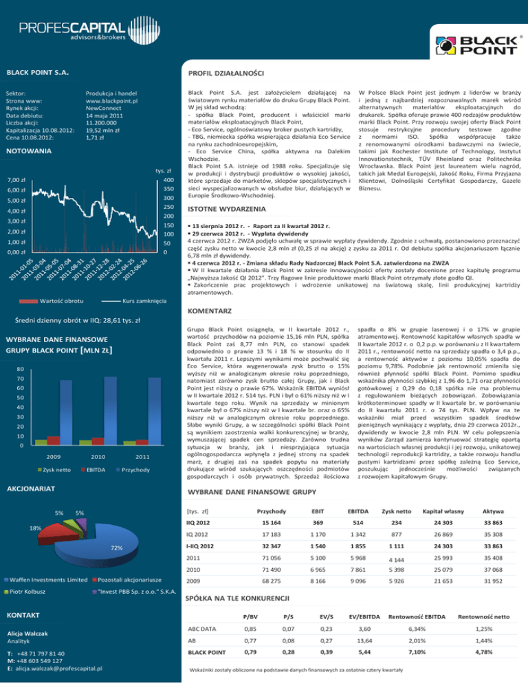 BLACK POINT S.A. PROFIL DZIAŁALNOŚCI Sektor: Strona www: Rynek akcji: Data debiutu: Liczba akcji: Kapitalizacja 10.08.2012: Cena 10.08.2012: Produkcja i handel www.blackpoint.pl NewConnect 14 maja 2011 11.200.000 19,52 mln zł 1,71 zł NOTOWANIA tys. zł 400 350 300 250 200 150 100 50 0 7,00 zł 6,00 zł 5,00 zł 4,00 zł 3,00 zł 2,00 zł 1,00 zł 0,00 zł Wartość obrotu Black Point S.A. jest założycielem działającej na światowym rynku materiałów do druku Grupy Black Point. W jej skład wchodzą: - spółka Black Point, producent i właściciel marki materiałów eksploatacyjnych Black Point, - Eco Service, ogólnoświatowy broker pustych kartridży, - TBG, niemiecka spółka wspierająca działania Eco Service na rynku zachodnioeuropejskim, - Eco Service China, spółka aktywna na Dalekim Wschodzie. Black Point S.A. istnieje od 1988 roku. Specjalizuje się w produkcji i dystrybucji produktów o wysokiej jakości, które sprzedaje do marketów, sklepów specjalistycznych i sieci wyspecjalizowanych w obsłudze biur, działających w Europie Środkowo-Wschodniej. W Polsce Black Point jest jednym z liderów w branży i jedną z najbardziej rozpoznawalnych marek wśród alternatywnych materiałów eksploatacyjnych do drukarek. Spółka oferuje prawie 400 rodzajów produktów marki Black Point. Przy rozwoju swojej oferty Black Point stosuje restrykcyjne procedury testowe zgodne z normami ISO. Spółka współpracuje także z renomowanymi ośrodkami badawczymi na świecie, takimi jak Rochester Institute of Technology, Instytut Innovationstechnik, TÜV Rheinland oraz Politechnika Wrocławska. Black Point jest laureatem wielu nagród, takich jak Medal Europejski, Jakość Roku, Firma Przyjazna Klientowi, Dolnośląski Certyfikat Gospodarczy, Gazele Biznesu. ISTOTNE WYDARZENIA 13 sierpnia 2012 r. - Raport za II kwartał 2012 r. 29 czerwca 2012 r. - Wypłata dywidendy 4 czerwca 2012 r. ZWZA podjęło uchwałę w sprawie wypłaty dywidendy. Zgodnie z uchwałą, postanowiono przeznaczyć część zysku netto w kwocie 2,8 mln zł (0,25 zł na akcję) z zysku za 2011 r. Od debiutu spółka akcjonariuszom łącznie 6,78 mln zł dywidendy. 4 czerwca 2012 r. - Zmiana składu Rady Nadzorczej Black Point S.A. zatwierdzona na ZWZA W II kwartale działania Black Point w zakresie innowacyjności oferty zostały docenione przez kapitułę programu „Najwyższa Jakość QI 2012”. Trzy flagowe linie produktowe marki Black Point otrzymały złote godło QI. Zakończenie prac projektowych i wdrożenie unikatowej na światową skalę, linii produkcyjnej kartridży atramentowych. Kurs zamknięcia KOMENTARZ Średni dzienny obrót w IIQ: 28,61 tys. zł WYBRANE DANE FINANSOWE GRUPY BLACK POINT [MLN ZŁ] 80 70 60 50 40 30 20 10 0 2009 Zysk netto 2010 2011 EBITDA Przychody AKCJONARIAT 5% Grupa Black Point osiągnęła, w II kwartale 2012 r., wartość przychodów na poziomie 15,16 mln PLN, spółka Black Point zaś 8,77 mln PLN, co stanowi spadek odpowiednio o prawie 13 % i 18 % w stosunku do II kwartału 2011 r. Lepszymi wynikami może pochwalić się Eco Service, która wygenerowała zysk brutto o 15% wyższy niż w analogicznym okresie roku poprzedniego, natomiast zarówno zysk brutto całej Grupy, jak i Black Point jest niższy o prawie 67%. Wskaźnik EBITDA wyniósł w II kwartale 2012 r. 514 tys. PLN i był o 61% niższy niż w I kwartale tego roku. Wynik na sprzedaży w minionym kwartale był o 67% niższy niż w I kwartale br. oraz o 65% niższy niż w analogicznym okresie roku poprzedniego. Słabe wyniki Grupy, a w szczególności spółki Black Point są wynikiem zaostrzenia walki konkurencyjnej w branży, wymuszającej spadek cen sprzedaży. Zarówno trudna sytuacja w branży, jak i niesprzyjająca sytuacja ogólnogospodarcza wpłynęła z jednej strony na spadek marż, z drugiej zaś na spadek popytu na materiały drukujące wśród szukających oszczędności podmiotów gospodarczych i osób prywatnych. Sprzedaż ilościowa spadła o 8% w grupie laserowej i o 17% w grupie atramentowej. Rentowność kapitałów własnych spadła w II kwartale 2012 r. o 0,2 p.p. w porównaniu z II kwartałem 2011 r., rentowność netto na sprzedaży spadła o 3,4 p.p., a rentowność aktywów z poziomu 10,05% spadła do poziomu 9,78%. Podobnie jak rentowność zmieniła się również płynność spółki Black Point. Pomimo spadku wskaźnika płynności szybkiej z 1,96 do 1,71 oraz płynności gotówkowej z 0,29 do 0,18 spółka nie ma problemu z regulowaniem bieżących zobowiązań. Zobowiązania krótkoterminowe spadły w II kwartale br. w porównaniu do II kwartału 2011 r. o 74 tys. PLN. Wpływ na te wskaźniki miał przed wszystkim spadek środków pieniężnych wynikający z wypłaty, dnia 29 czerwca 2012r., dywidendy w kwocie 2,8 mln PLN. W celu polepszenia wyników Zarząd zamierza kontynuować strategię opartą na wartościach własnej produkcji i jej rozwoju, unikatowej technologii reprodukcji kartridży, a także rozwoju handlu pustymi kartridżami przez spółkę zależną Eco Service, poszukując jednocześnie możliwości związanych z rozwojem kapitałowym Grupy. WYBRANE DANE FINANSOWE GRUPY 5% 18% 72% Waffen Investments Limited Pozostali akcjonariusze Piotr Kolbusz "Invest PBB Sp. z o.o." S.K.A. [tys. zł] Przychody EBIT EBITDA Zysk netto Kapitał własny Aktywa IIQ 2012 15 164 369 514 234 24 303 33 863 IQ 2012 17 183 1 170 1 342 877 26 869 35 308 I-IIQ 2012 32 347 1 540 1 855 1 111 24 303 33 863 2011 71 056 5 100 5 968 4 144 25 993 35 408 2010 71 490 6 965 7 861 5 398 25 079 37 068 2009 68 275 8 166 9 096 5 926 21 653 31 952 EV/EBITDA Rentowność EBITDA Rentowność netto 1,25% SPÓŁKA NA TLE KONKURENCJI KONTAKT Alicja Walczak Analityk T: +48 71 797 81 40 M: +48 603 549 127 E: [email protected] P/BV P/S EV/S ABC DATA 0,85 0,07 0,23 3,60 6,34% AB 0,77 0,08 0,27 13,64 2,01% 1,44% BLACK POINT 0,79 0,28 0,39 5,44 7,10% 4,78% Wskaźniki zostały obliczone na podstawie danych finansowych za ostat