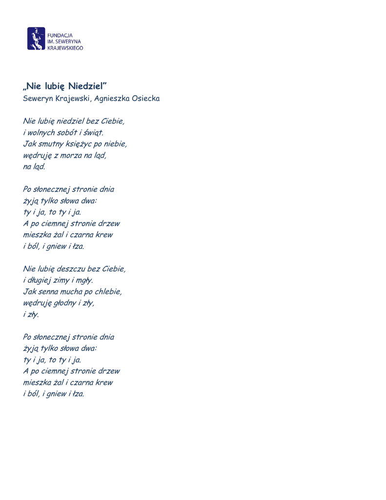 „Nie lubię Niedziel” Seweryn Krajewski, Agnieszka Osiecka Nie lubię niedziel bez Ciebie, i wolnych sobót i świąt. Jak smutny księżyc po niebie, wędruję z morza na ląd, na ląd. Po słonecznej stronie dnia żyją tylko słowa dwa: ty i ja, to ty i ja. A po ciemnej stronie drzew mieszka żal i czarna krew i ból, i gniew i łza. Nie lubię deszczu bez Ciebie, i długiej zimy i mgły. Jak senna mucha po chlebie, wędruję głodny i zły, i zły. Po słonecznej stronie dnia żyją tylko słowa dwa: ty i ja, to ty i ja. A po ciemnej stronie drzew mieszka żal i czarna krew i ból, i gniew i łza.