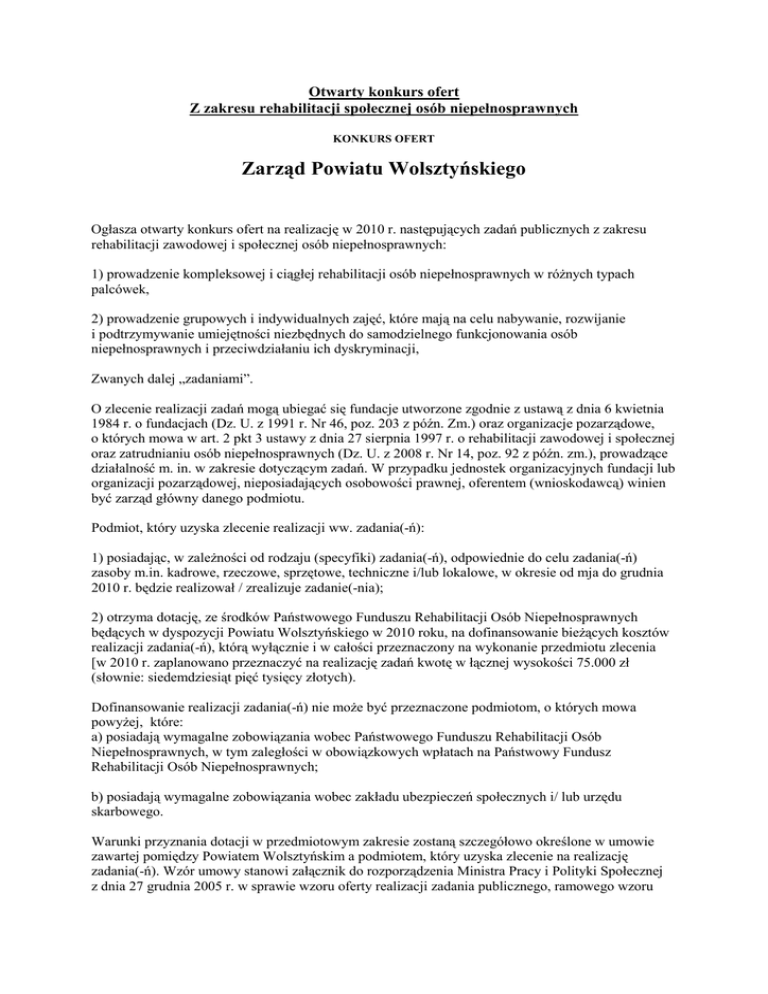Otwarty konkurs ofert Z zakresu rehabilitacji społecznej osób niepełnosprawnych KONKURS OFERT Zarząd Powiatu Wolsztyńskiego Ogłasza otwarty konkurs ofert na realizację w 2010 r. następujących zadań publicznych z zakresu rehabilitacji zawodowej i społecznej osób niepełnosprawnych: 1) prowadzenie kompleksowej i ciągłej rehabilitacji osób niepełnosprawnych w róŜnych typach palcówek, 2) prowadzenie grupowych i indywidualnych zajęć, które mają na celu nabywanie, rozwijanie i podtrzymywanie umiejętności niezbędnych do samodzielnego funkcjonowania osób niepełnosprawnych i przeciwdziałaniu ich dyskryminacji, Zwanych dalej „zadaniami”. O zlecenie realizacji zadań mogą ubiegać się fundacje utworzone zgodnie z ustawą z dnia 6 kwietnia 1984 r. o fundacjach (Dz. U. z 1991 r. Nr 46, poz. 203 z późn. Zm.) oraz organizacje pozarządowe, o których mowa w art. 2 pkt 3 ustawy z dnia 27 sierpnia 1997 r. o rehabilitacji zawodowej i społecznej oraz zatrudnianiu osób niepełnosprawnych (Dz. U. z 2008 r. Nr 14, poz. 92 z późn. zm.), prowadzące działalność m. in. w zakresie dotyczącym zadań. W przypadku jednostek organizacyjnych fundacji lub organizacji pozarządowej, nieposiadających osobowości prawnej, oferentem (wnioskodawcą) winien być zarząd główny danego podmiotu. Podmiot, który uzyska zlecenie realizacji ww. zadania(-ń): 1) posiadając, w zaleŜności od rodzaju (specyfiki) zadania(-ń), odpowiednie do celu zadania(-ń) zasoby m.in. kadrowe, rzeczowe, sprzętowe, techniczne i/lub lokalowe, w okresie od mja do grudnia 2010 r. będzie realizował / zrealizuje zadanie(-nia); 2) otrzyma dotację, ze środków Państwowego Funduszu Rehabilitacji Osób Niepełnosprawnych będących w dyspozycji Powiatu Wolsztyńskiego w 2010 roku, na dofinansowanie bieŜących kosztów realizacji zadania(-ń), którą wyłącznie i w całości przeznaczony na wykonanie przedmiotu zlecenia [w 2010 r. zaplanowano przeznaczyć na realizację zadań kwotę w łącznej wysokości 75.000 zł (słownie: siedemdziesiąt pięć tysięcy złotych). Dofinansowanie realizacji zadania(-ń) nie moŜe być przeznaczone podmiotom, o których mowa powyŜej, które: a) posiadają wymagalne zobowiązania wobec Państwowego Funduszu Rehabilitacji Osób Niepełnosprawnych, w tym zaległości w obowiązkowych wpłatach na Państwowy Fundusz Rehabilitacji Osób Niepełnosprawnych; b) posiadają wymagalne zobowiązania wobec zakładu ubezpieczeń społecznych i/ lub urzędu skarbowego. Warunki przyznania dotacji w przedmiotowym zakresie zostaną szczegółowo określone w umowie zawartej pomiędzy Powiatem Wolsztyńskim a podmiotem, który uzyska zlecenie na realizację zadania(-ń). Wzór umowy stanowi załącznik do rozporządzenia Ministra Pracy i Polityki Społecznej z dnia 27 grudnia 2005 r. w sprawie wzoru oferty realizacji zadania publicznego, ramowego wzoru umowy o wykonanie zadania publicznego i wzoru sprawozdania z wykonania tego zadania (Dz.U. Nr 264, poz.2207), zwanego dalej „rozporządzeniem”. Część merytoryczna oferty podmiotu ubiegającego się o zlecenie realizacji zadania(-ń) powinna być sporządzona na formularzu, którego wzór stanowi załącznik do rozporządzenia. Do oferty powinny być dołączone załączniki, o których mowa we wzorze oferty realizacji zadania publicznego oraz dodatkowo zaświadczenia potwierdzające, Ŝe podmiot nie zalega z opłacaniem składek ubezpieczeniowych i podatków, wystawione w terminie do trzech miesięcy przed terminem składania ofert. Kryteria oceny złoŜonych ofert: 1) uzasadnienie znaczenia zadania(-ń) dla stopnia zaspokojenia zidentyfikowanych potrzeb w zakresie rehabilitacji zawodowej i społecznej osób niepełnosprawnych (waga kryterium 0-10 punktów); 2) adekwatny ze względu na cel zadania(-ń) dobór instrumentów słuŜących realizacji zadania(-ń) oraz wybór rodzaju udzielonego wsparcia, w tym sposób zapewniania udziału beneficjentów ostatecznych w realizacji zadania(-ń) (waga kryterium 0-10 punktów); 3) ocena przewidywanych rezultatów zadania(-ń), w tym adekwatność zakładanych rezultatów zadania(-ń) do celu zadania(-ń) (waga kryterium 0-10 punktów; 4) moŜliwość realizacji zadania(-ń) przez podmiot, w tym dotychczasowe doświadczenia i osiągnięcia podmiotu w realizacji przedmiotu zadania(-ń) (waga kryterium 0-15 punktów); 5) zasoby kadrowe, rzeczowe, sprzętowe, techniczne i/lub lokalowe podmiotu umoŜliwiające realizację zadania(-ń) (waga kryterium 0-10 punktów); 6) kalkulacja kosztów realizacji zadania(-ń), w tym realizacja do zakresu rzeczowego zadania(-ń) oraz wysokości dotacji przeznaczonej na realizację zadania(-ń) (waga kryterium 0-35 punktów); 7) udział środków finansowych własnych albo pozyskanych z innych źródeł na realizację zadania(-ń) (waga kryterium 0-15 punktów). Oferty konkursowe naleŜy składać osobiście lub pocztą na adres: Starostwo Powiatowe w Wolsztynie 64-200 Wolsztyn; ul. 5 Stycznia 5 w terminie do dnia 30 kwietnia 2010 do godziny 9.00 w zaklejonych kopertach z dopiskiem „ Realizacja zadań z zakresu rehabilitacji społecznej i zawodowej osób niepełnosprawnych”, opatrzonych pieczęcią firmową podmiotu. W przypadku ofert składanych pocztą decydować będzie data wpływu. Dodatkowe informacje moŜna uzyskać pod numerem telefonu 068 384 56 13 (KIEROWNIK PCPR). Oferty sporządzone wadliwie albo niekompletne, co do wymaganego zestawu dokumentów lub informacji pozostaną bez rozpoznania. Konkurs ofert będzie waŜny równieŜ w przypadku złoŜenia tylko jednej oferty. Rozpatrzenia zgłoszonych ofert dokona Zarząd Powiatu w Wolsztynie. Wyniki konkursu ofert oraz warunki zlecenia zadania(-ń) zostaną podane do publicznej wiadomości na tablicach ogłoszeń Starostwa Powiatowego w Wolsztynie na stronie internetowej i w Biuletynie Informacji Publicznej Powiatu Wolsztyńskiego. Konkurs obejmuje zadanie, którego realizacja rozpoczyna się