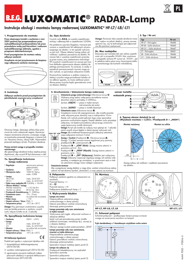 PL B.E.G. LUXOMATIC ® RADAR-Lamp Instrukcja obsługi i montażu lampy radarowej LUXOMATIC® HF-L7/-L8/-L11 1. Przygotowanie do montażu 2a. Opis działania Prace obejmujące kontakt z zasilaniem z sieci 230 V powinny być przeprowadzone przez wykwalifikowanych profesjonalistów lub przez przeszkolone osoby pod kierunkiem i nadzorem wykwalifikowanego elektryka, zgodnie z przepisami elektrotechnicznymi. Czujniki ruchu B.E.G. na wysokie częstotliwości emitują i odbierają fale o częstotliwości 5,8 GHz. Urządzenie nie jest przystosowane do bezpiecznego odłączania zasilania sieciowego. Typ 2b. Moc nadajnika L7 – Poliwęglan 94451 L8 – Szkło akrylowe 94446 L11 – Szkło akrylowe 94448 Stosowany jest niemalże taki sam zakres częstotliwości jak w przypadku W-LAN. Moc wyjściowa w przypadku sensora HF wynosi ok. 10 mW – jest to zaledwie jedna setna mocy transmisyjnej telefonu komórkowego lub kuchenki mikrofalowej. Powierzchnie metalowe w pobliżu miejsca instalacji czujnika mogą powodować bardzo silne odbicia sygnału, co może zakłócać prawidłową pracę czujnika bądź spowodować zmianę obszaru detekcji. 4. Instalacja Odłączyć zasilanie przed przystąpieniem do jakichkolwiek czynności przy urządzeniu! Otworzyć lampę, obracając szklany klosz przeciwnie do ruchu wskazówek zegara. Zaznaczyć miejsca nawiercenia otworów, zwracając uwagę na ewentualne przewody biegnące w ścianie/suficie. Nawiercić otwory, włożyć kołki. Wprowadzić przewód zasilający od tyłu. Przykręcić obudowę. Proszę zwrócić uwagę w przypadku montażu naściennego: dla optymalnego działania funkcji cieplnej proszę dopilnować, aby czujnik RF był skierowany w dół. 7a. S pecyfikacja techniczna lampy radarowej • Regulacja: ręczna przy pomocy potencjometru • Zasilanie: 230 V~ ±10 % • Obciążenie styku: 1200 W, Styk μ, maks. 5 EKG • Lampy: HF-L7/L8: maks. 23 W E27 HF-L11: maks. 2x 23 W E27 • Pobór mocy nadajnika HF:5,8 GHz, < 10 mW • Obszar detekcji / zasięg: Montaż naścienny: r = 0,2 do 8 m Montaż na suficie: Ø 0,4 do 16 m • Przełącznik fotoelektryczny: 2 - 2000 Lux • Ustawienia czasu:15 s - 15 min. • Montaż: na suficie lub na ścianie • Pobór mocy: < 1W • Stopień ochrony / klasa: IP40 / I • Temperatura pracy: -15°C do +30°C Uwaga: Przy pierwszym uruchomieniu czujnika oraz po każdej przerwie w zasilaniu, czujnik ruchu włącza światło na ok. 3 sekundy. 7b. Specyfikacja techniczna lampy • Zasilanie: 230 V~ ±10 % • Lampy: L7/L8: maks. 23 W E27 L11: maks. 2x 23 W E27 • Montaż:na suficie lub na ścianie • Stopień ochrony / klasa: IP40 / I • Temperatura pracy: -15°C do +30°C UE Deklaracja Zgodności: Produkt jest zgodny z wytycznymi dyrektyw dot 1. kompatybilności elektromagnetycznej (2014/30/UE) 2. wyrobów niskonapięciowych (2014/35/UE) 3. ograniczenia używania niektórych niebezpiecznych substancji w sprzęcie elektrycznym i elektronicznym (2011/65/UE) < 10 mW Nr art. HF-L7 – Poliwęglan 94450 HF-L8 – Szkło akrylowe 94445 HF-L11 – Szkło akrylowe 94447 ca. 1000 mW sensor światła 5. Uruchomienie / Ustawienia lampy radarowej Ustawienie progu zmierzchowego (Obrotowa tarcza C) wskaźnik pracy Wybrany próg reakcji załączania oświetlenia można A dowolnie ustawić pomiędzy 2-2000 Lux. B Symbol „KSIĘŻYC“= praca w trybie nocnym C (od zmierzchu do świtu) D Symbol „SŁOŃCE“= praca w świetle dziennym Ustawianie czasu (Obrotowa tarcza B) Urządzenie można tak zaprogramować, aby światło pozostawało włączone przez dowolny czas a maksymalnie 15 min. 6. Typowy obszar detekcji [w m] Każdy ruch wykryty przed upływem tego czasu spowoduje (Wysokość montażu = 2,50 m / Przełącznik D = „HIGH”) ponowne uruchomienie zegara. Dopóki detektor ruchu pozostaje załączony, nie będzie prowadzony odczyt progu zmierzchoMontaż naścienny Montaż na suficie wego (praca przy świetle dziennym). Uwaga: Po tym jak światło się wyłączy musi upłynąć ok. 1 sekunda zanim czujnik znowu będzie w stanie zacząć wykrywać ruch. HIGH OFF LOW Uwaga: dla świetlówek fluorescencyjnych zalecamy ustawienie czasu załączenia minimum 5 minut. Zasięg / Czułość (Przełącznik D, Obrotowa tarcza A) ��16 �� Zasięg / Czułość sensora można regulować przy pomocy 0,4 przełącznika D i potencjometru A. Przełącznik D = „LOW“ (Niski): Zasięg można ustawić w promieniu od 0,4 - 8 m. Przełącznik D = „HIGH“ (Wysoki): Zasięg można ustawić w promieniu od 6 - 16 m. 0,2 Przełącznik D = „OFF“ (Wyłączony): Detektor jest wyłączony. Uwaga: Zalecamy rozpocząć regulację zasięgu od wartości mak8 symalnej, a następnie go zmniejszać, w przeciwnym razie w trakcie ustawiania zasięgu może nastąpić wyłączenie. Zasięg zależy od wielkości i szybkości poruszania się obiektu. Ustawienia testowe Aby wyregulować zasięg detekcji w ciągu dnia, wartość zmierzchową należy ustawić na tryb dzienny (symbol „słoneczka”), a czas ustawić na minimum. 8. Połączenia Podłączyć zasilanie zgodnie ze wskazaniami na zaciskach: Przewód fazowy = L PE = Przewód zerowy = N Podłączenie dodatkowych lamp = L' 10. Wymiary 9. Wykrywanie błędów Lampa nie świeci Nieprawidłowe ustawienie progu zmierzchowego w danej sytuacji Ustawić prawidłowo wartość zmierzchową obracając potencjometrem Lampa pozostaje cały czas zaświecona w trybie nocnym Wykrywana jest ciągła aktywność ruchowa w obszarze detekcji Jeżeli ruch jest powodowany przez źródła zakłóceń (zwierzęta, wentylację itp.), usunąć je z obszaru detekcji. Obniżyć zasięg/czułość potencjometrem „SENS” Lampa pozostaje cały czas zaświecona, również w trybie dziennym Nieprawidłowe ustawienie progu zmierzchowego w danej sytuacji Ustawić prawidłowo wartość zmierzchową obracając potencjometrem. Sprawdzić miejsce instalacji (patrz punkt 2) Lampa nie załącza się Przełącznik fotoelektryczny nie za