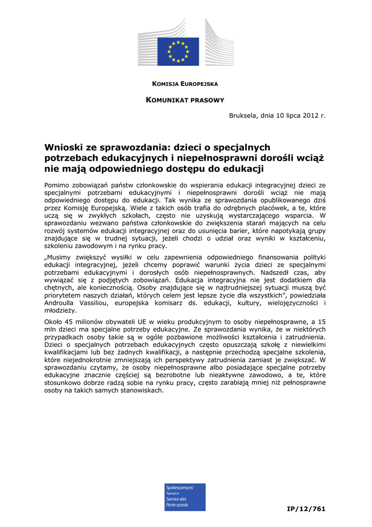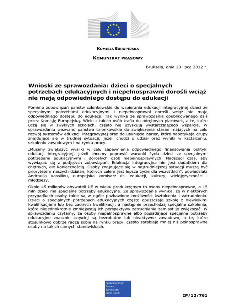 KOMISJA EUROPEJSKA KOMUNIKAT PRASOWY Bruksela, dnia 10 lipca 2012 r. Wnioski ze sprawozdania: dzieci o specjalnych potrzebach edukacyjnych i niepełnosprawni dorośli wciąż nie mają odpowiedniego dostępu do edukacji Pomimo zobowiązań państw członkowskie do wspierania edukacji integracyjnej dzieci ze specjalnymi potrzebami edukacyjnymi i niepełnosprawni dorośli wciąż nie mają odpowiedniego dostępu do edukacji. Tak wynika ze sprawozdania opublikowanego dziś przez Komisję Europejską. Wiele z takich osób trafia do odrębnych placówek, a te, które uczą się w zwykłych szkołach, często nie uzyskują wystarczającego wsparcia. W sprawozdaniu wezwano państwa członkowskie do zwiększenia starań mających na celu rozwój systemów edukacji integracyjnej oraz do usunięcia barier, które napotykają grupy znajdujące się w trudnej sytuacji, jeżeli chodzi o udział oraz wyniki w kształceniu, szkoleniu zawodowym i na rynku pracy. „Musimy zwiększyć wysiłki w celu zapewnienia odpowiedniego finansowania polityki edukacji integracyjnej, jeżeli chcemy poprawić warunki życia dzieci ze specjalnymi potrzebami edukacyjnymi i dorosłych osób niepełnosprawnych. Nadszedł czas, aby wywiązać się z podjętych zobowiązań. Edukacja integracyjna nie jest dodatkiem dla chętnych, ale koniecznością. Osoby znajdujące się w najtrudniejszej sytuacji muszą być priorytetem naszych działań, których celem jest lepsze życie dla wszystkich”, powiedziała Androulla Vassiliou, europejska komisarz ds. edukacji, kultury, wielojęzyczności i młodzieży. Około 45 milionów obywateli UE w wieku produkcyjnym to osoby niepełnosprawne, a 15 mln dzieci ma specjalne potrzeby edukacyjne. Ze sprawozdania wynika, że w niektórych przypadkach osoby takie są w ogóle pozbawione możliwości kształcenia i zatrudnienia. Dzieci o specjalnych potrzebach edukacyjnych często opuszczają szkołę z niewielkimi kwalifikacjami lub bez żadnych kwalifikacji, a następnie przechodzą specjalne szkolenia, które niejednokrotnie zmniejszają ich perspektywy zatrudnienia zamiast je zwiększać. W sprawozdaniu czytamy, że osoby niepełnosprawne albo posiadające specjalne potrzeby edukacyjne znacznie częściej są bezrobotne lub nieaktywne zawodowo, a te, które stosunkowo dobrze radzą sobie na rynku pracy, często zarabiają mniej niż pełnosprawne osoby na takich samych stanowiskach. IP/12/761 We wszystkich państwach członkowskich w szkołach specjalnych nieproporcjonalnie dużo jest dzieci będących w trudnej sytuacji (zwłaszcza chłopców), pochodzenia romskiego i wywodzące się z innych mniejszości etnicznych oraz ze środowisk w niekorzystnej sytuacji społecznej i ekonomicznej. W sprawozdaniu podniesiono kwestię tego, czy systemy edukacji specjalnej nie zwiększają izolacji uczniów, którzy i tak są już społecznie zmarginalizowani i czy nie ograniczają ich szans w życiu zamiast je zwiększać. Badania sugerują, że takie dzieci mogłyby uczyć się w zwykłych szkołach, gdyby bardziej inwestowano w rozwijanie ich umiejętności językowych i wykazywano większą wrażliwość na różnice kulturowe. W sprawozdaniu podkreślono również duże zróżnicowanie między państwami członkowskimi co do sposobu identyfikowania dzieci o specjalnych potrzebach, a także umieszczania ich w zwykłych szkołach lub szkołach specjalnych. Na przykład we Flandrii (Belgia) 5,2 proc. uczniów o specjalnych potrzebach uczy się w szkołach specjalnych, podczas gdy we Włoszech odsetek ten wynosi jedynie 0,01 proc. Ze sprawozdania wynika, że należy zrobić więcej w celu zharmonizowania definicji i poprawy gromadzenia danych, aby państwa mogły bardziej skutecznie porównywać swoje podejścia i uczyć się ze swoich doświadczeń. Kontekst Sprawozdanie pt. „Edukacja a niepełnosprawność/specjalne potrzeby – polityka i praktyki w UE w dziedzinie kształcenia, szkolenia i zatrudnienia uczniów niepełnosprawnych i mających specjalne potrzeby edukacyjne”, zostało opracowane dla Komisji Europejskiej przez niezależną sieć ekspertów w dziedzinie nauk społecznych w zakresie kształcenia i szkolenia (NESSE). Inne ważne wnioski ze sprawozdania • • • • • • • • Podczas gdy nauka osób głęboko upośledzonych w zwykłych szkołach może być utrudniona, a ich potrzebom lepiej może służyć odrębne otoczenie, istnieje coraz więcej dowodów na to, że bardzo duża liczba uczniów niepełnosprawnych lub o specjalnych potrzebach edukacyjnych może uczyć się w zwykłych szkołach oraz że wysokiej jakości edukacja integracyjna przynosi korzyści wszystkim uczniom. Chociaż dążenie do coraz bardziej integracyjnych systemów edukacji ma kluczowe znaczenie, kształcenie nauczycieli i ich doskonalenie zawodowe nie zawsze jest ukierunkowane na wymiar integracyjny. Aby integracja działała w praktyce, kluczową rolę oprócz nauczycieli odgrywają nauczyciele wspomagający i asystenci nauczycieli. W niektórych państwach europejskich programy nauczania są ustandaryzowane i nieelastyczne, co utrudnia integrację dzieci niepełnosprawnych. Zasady powtarzania klas również utrudniają realizację zasad integracji. Osoby niepełnosprawne podejmują studia wyższe rzadziej niż osoby w pełni sprawne. Osoby niepełnosprawne, które posiadają wyższe wykształcenie, wciąż doświadczają trudności na rynku pracy, ale i tak mają znacznie większe szanse na zatrudnienie niż osoby niepełnosprawne o niższych kwalifikacjach. Brakuje ogólnoeuropejskich danych porównawczych na temat liczby niepełnosprawnych studentów wyższych uczelni, rodzaju niepełnosprawności oraz wyników tych osób w nauce. Nie ma też aktualnych i wiarygodnych danych dotyczących liczby osób niepełnosprawnych zatrudnionych w poszczególnych państwach UE. 2 • • • Renty inwalidzkie zmniejszają ryzyko ubóstwa i wykluczenia społecznego, ale prawdopodobnie będą ograniczane z u