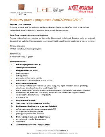 Podstawy pracy z programem AutoCAD/AutoCAD LT PRZEZNACZENIE SZKOLENIA Szkolenie przeznaczone dla projektantów i konstruktorów, chcących dołączyć do grupy użytkowników najpopularniejszego programu do tworzenia dokumentacji dwuwymiarowej. KORZYŚCI WYNIKAJĄCE Z UKOŃCZENIA SZKOLENIA Poznasz najpopularniejszy program do tworzenia dokumentacji technicznej. Będziesz umiał przygotować dokumenty do wydruku. Unikniesz często popełnianych błędów, dzięki czemu zrealizujesz projekt w terminie. METODA SZKOLENIA Wykład, warsztaty, ćwiczenia praktyczne CZAS TRWANIA 3 dni szkoleniowe / 21 godzin TEMATYKA SZKOLENIA 1. Filozofia programu AutoCAD. 2. Interfejs użytkownika. 3. Przygotowanie do pracy: granice rysunku siatka punktów precyzyjne wskazywanie punktów powiększanie i panoramowanie obrazu (zoom). 4. Grafika dwuwymiarowa rysowanie podstawowych obiektów 2D (linia, okrąg, łuk, elipsa, wielobok, obszar, prostokąt, wielokrotne linie równoległe, linie konstrukcyjne itd.) edycja obiektów 2D (uchwyty, powiększanie/zmniejszanie, przesuwanie, kopiowanie, usuwanie, odbicie lustrzane, obracanie, skalowanie, zmiana kształtu, łączenie linii itd.) kreskowanie wprowadzanie do dokumentu i edycja tekstu wymiarowanie. 5. Zastosowanie warstw. 6. Tworzenie i wykorzystywanie bloków. 7. Podstawowa konfiguracja programu AutoCAD definiowanie parametrów pracy programu AutoCAD odczytywanie parametrów rysunku precyzyjne wymiarowanie obiektów. 8. Drukowanie dokumentacji technicznej przygotowanie rysunku do drukowania drukowanie. 9. Zarządzanie zasobami - DesignCenter. LEGNICKI PARK TECHNOLOGICZNY LETIA S.A. LETIA BUSINESS CENTER, UL. RYCERSKA 24, 59-220 LEGNICA, WWW.LETIA.PL OCZEKIWANE PRZYGOTOWANIE SŁUCHACZY Wiedza z zakresu podstaw obsługi środowiska Windows. POZIOM SZKOLENIA KOD SZKOLENIA: podstawowy CAD20 KONTAKT Malwina Strzelczyk Magdalena Monteiro tel. 76 723 54 54, 697 671 368 tel. 76 723 54 43, 697 890 426 e-mail: [email protected] e-mail: [email protected] LEGNICKI PARK TECHNOLOGICZNY LETIA S.A. LETIA BUSINESS CENTER, UL. RYCERSKA 24, 59-220 LEGNICA, WWW.LETIA.PL