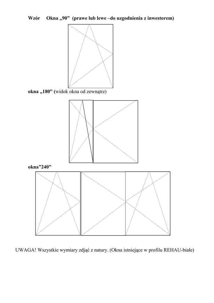 Wzór Okna „90” (prawe lub lewe –do uzgodnienia z inwestorem) okna „180” (widok okna od zewnątrz) okna”240” UWAGA! Wszystkie wymiary zdjąć z natury. (Okna istniejące w profilu REHAU-białe)