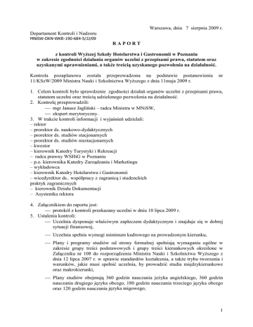 Warszawa, dnia 7 sierpnia 2009 r. Departament Kontroli i Nadzoru MNiSW-DKN-WKR-190-684-5/JJ/09 RAPORT z kontroli WyŜszej Szkoły Hotelarstwa i Gastronomii w Poznaniu w zakresie zgodności działania organów uczelni z przepisami prawa, statutem oraz uzyskanymi uprawnieniami, a takŜe treścią uzyskanego pozwolenia na działalność. Kontrola pozaplanowa została przeprowadzona na podstawie postanowienia 11/KSzW/2009 Ministra Nauki i Szkolnictwa WyŜszego z dnia 11maja 2009 r. nr 1. Celem kontroli było sprawdzenie zgodności działań organów uczelni z przepisami prawa, statutem uczelni oraz treścią udzielonego pozwolenia na działalność. 2. Kontrolę przeprowadzili: mgr Janusz Jagliński – radca Ministra w MNiSW, ekspert merytoryczny. 3. W trakcie kontroli informacji i wyjaśnień udzielali: – rektor – prorektor ds. naukowo-dydaktycznych – prorektor ds. studiów stacjonarnych – prorektor ds. studiów niestacjonarnych – kwestor – kierownik Katedry Turystyki i Rekreacji – radca prawny WSHiG w Poznaniu – p.o. kierownika Katedry Zarządzania i Marketingu – wykładowca – kierownik Katedry Hotelarstwa i Gastronomii – wicedyrektor ds.. współpracy z zagranicą i studenckich praktyk zagranicznych – kierownik Działu Dokumentacji – Asystentka rektora 4. Załącznikiem do raportu jest: protokół z kontroli przekazany uczelni w dniu 10 lipca 2009 r. 5. Ustalenia kontroli: Uczelnia dysponuje właściwym zapleczem dydaktycznym i znajduje się w dobrej sytuacji finansowej, Uczelnia spełnia wymogi minimum kadrowego na prowadzonym kierunku, Plany i programy studiów od strony formalnej spełniają wymagania ogólne w zakresie grupy treści podstawowych i grupy treści kierunkowych określone w Załączniku nr 108 do rozporządzenia Ministra Nauki i Szkolnictwa WyŜszego z dnia 12 lipca 2007 r. w sprawie standardów kształcenia, a takŜe trybu tworzenia i warunków, jakie musi spełnić uczelnia, by prowadzić studia międzykierunkowe oraz makrokierunki, Plany studiów obejmują 360 godzin nauczania jeŜyka angielskiego, 360 godzin nauczania drugiego języka obcego, 180 godzin nauczania trzeciego języka obcego oraz 120 godzin nauczania języka migowego, 1 Wybory do Rady Naukowo-Dydaktycznej w dniu 7 marca 2007 r. zostały przeprowadzone niezgodnie z obowiązującymi zasadami: brak komisji skrutacyjnej, wybrano członków Rady mimo braku wymaganej liczby głosów, Liczba studentów w Radzie Naukowo-Dydaktycznej nie spełnia wymogów art. 61 ust. 3 ustawy – Prawo o szkolnictwie wyŜszym, Większość nauczycieli akademickich nie przeszła obowiązkowego szkolenia z zakresu BHP, Występują liczne przypadki stosowania faksymile organów jednoosobowych uczelni zamiast podpisów oryginalnych, Korekty w księdze dyplomów nie są zgodne z § 15 ust. 2 Rozporządzenia Ministra Nauki i Szkolnictwa WyŜszego z dnia 2 listopada 2006 r. w sprawie dokumentacji przebiegu studiów, W badanych teczkach osobowych studentów stwierdzono jeden przypadek przyjęcia na studia osoby bez wymaganych dokumentów dotyczących przebiegu studiów w innej uczelni, Studenci cudzoziemcy zdawali egzaminy potwierdzające przygotowanie oraz znajomość języka polskiego w stopniu pozwalającym na podjęcie studiów w WyŜszej Szkole Hotelarstwa i Gastronomii w Poznaniu zgodnie z rozporządzeniem Ministra Nauki i Szkolnictwa WyŜszego z dnia 12 października 2006 r. w sprawie podejmowania i odbywania przez cudzoziemców studiów i szkoleń oraz ich uczestniczenia w badaniach naukowych i pracach rozwojowych, Uczelnia posiada autorskie programy praktyk zawodowych dla studentów specjalności: hotelarstwo i gastronomia, obsługa ruchu turystycznego, zarządzanie i marketing w hotelarstwie, gastronomii, turystyce i rekreacji, Umowy zawierane ze studentami dotyczące praktyk zagranicznych spełniają warunki określone w uczelnianym Regulaminie Praktyk Zawodowych obowiązującym od 1 października 2008 r., opracowanym m.in. na podstawie rozporządzenia Rady Ministrów z dnia 12 sierpnia 1991 r. w sprawie studenckich praktyk zawodowych, Umowy zawierane z firmami prowadzącymi praktyki studenckie zagraniczne (hotele) określają prawa i obowiązki uczelni, hotelu i praktykanta, w tym obowiązkiem wystawienia certyfikatu z opinią kaŜdemu praktykantowi, wyjazdy studentów na praktyki zagraniczne odbywały się z zachowaniem formalności związanych ze zmianą terminu sesji egzaminacyjnej, uczelnia stosuje „Karty wyjeŜdŜającego na praktyki zagraniczne”, w której do uzyskania zgody rektora na wyjazd na praktykę zagraniczną konieczne jest uzyskanie co najmniej sześciu podpisów pracowników słuŜb uczelni, w tym potwierdzających znajomość języka kraju odbywania praktyki zagranicznej. 6. W wyniku kontroli wnioskuję o wystosowanie w trybie art. 37 ust. 1 ustawy - Prawo o szkolnictwie wyŜszym, pisma pokontrolnego do WyŜszej Szkoły Hotelarstwa i Gastronomii w Poznaniu z uwagami dotyczącymi konieczności: Przeprowadzenia wyborów wymogami Statutu, do Rady Naukowo-Dydaktycznej zgodnie z 2 Powołania do Rady Naukowo-Dydaktycznej studentów w liczbieco najmniej 20 % składu Rady, Przeprowadzenia szkolenia BHP dla pracowników uczelni, Zwiększenia nadzoru nad dokumentacją przebiegu studiów i zlikwidowania praktyki stosowania faksymile organów jednoosobowych uczelni, Zaniechania praktyki przyjmowania na studia osób bez wymaganej dokumentacji, Poinformowania Departamentu Kontroli i Nadzoru MNiSW o stanie realizacji powyŜszych wniosków do dnia 30 września 2009 r. Raport został zatwierdzony przez Ministra Nauki i Szkolnictwa WyŜszego 10 sierpnia 2009r. 3