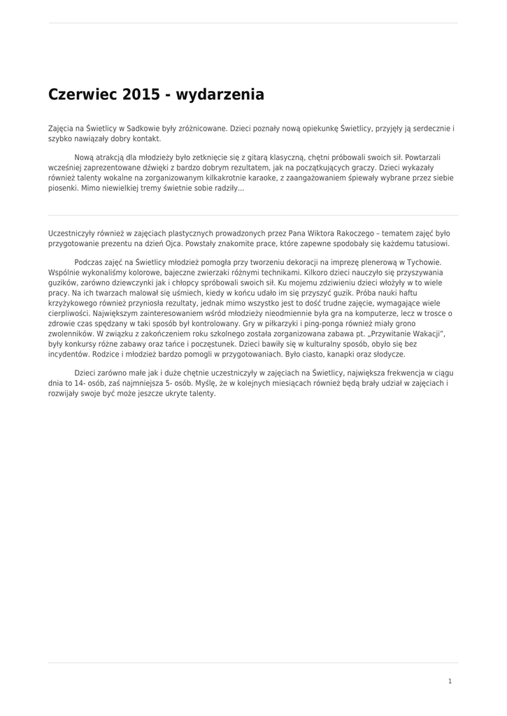 Czerwiec 2015 - wydarzenia Zajęcia na Świetlicy w Sadkowie były zróżnicowane. Dzieci poznały nową opiekunkę Świetlicy, przyjęły ją serdecznie i szybko nawiązały dobry kontakt. Nową atrakcją dla młodzieży było zetknięcie się z gitarą klasyczną, chętni próbowali swoich sił. Powtarzali wcześniej zaprezentowane dźwięki z bardzo dobrym rezultatem, jak na początkujących graczy. Dzieci wykazały również talenty wokalne na zorganizowanym kilkakrotnie karaoke, z zaangażowaniem śpiewały wybrane przez siebie piosenki. Mimo niewielkiej tremy świetnie sobie radziły... Uczestniczyły również w zajęciach plastycznych prowadzonych przez Pana Wiktora Rakoczego – tematem zajęć było przygotowanie prezentu na dzień Ojca. Powstały znakomite prace, które zapewne spodobały się każdemu tatusiowi. Podczas zajęć na Świetlicy młodzież pomogła przy tworzeniu dekoracji na imprezę plenerową w Tychowie. Wspólnie wykonaliśmy kolorowe, bajeczne zwierzaki różnymi technikami. Kilkoro dzieci nauczyło się przyszywania guzików, zarówno dziewczynki jak i chłopcy spróbowali swoich sił. Ku mojemu zdziwieniu dzieci włożyły w to wiele pracy. Na ich twarzach malował się uśmiech, kiedy w końcu udało im się przyszyć guzik. Próba nauki haftu krzyżykowego również przyniosła rezultaty, jednak mimo wszystko jest to dość trudne zajęcie, wymagające wiele cierpliwości. Największym zainteresowaniem wśród młodzieży nieodmiennie była gra na komputerze, lecz w trosce o zdrowie czas spędzany w taki sposób był kontrolowany. Gry w piłkarzyki i ping-ponga również miały grono zwolenników. W związku z zakończeniem roku szkolnego została zorganizowana zabawa pt. „Przywitanie Wakacji”, były konkursy różne zabawy oraz tańce i poczęstunek. Dzieci bawiły się w kulturalny sposób, obyło się bez incydentów. Rodzice i młodzież bardzo pomogli w przygotowaniach. Było ciasto, kanapki oraz słodycze. Dzieci zarówno małe jak i duże chętnie uczestniczyły w zajęciach na Świetlicy, największa frekwencja w ciągu dnia to 14- osób, zaś najmniejsza 5- osób. Myślę, że w kolejnych miesiącach również będą brały udział w zajęciach i rozwijały swoje być może jeszcze ukryte talenty. 1