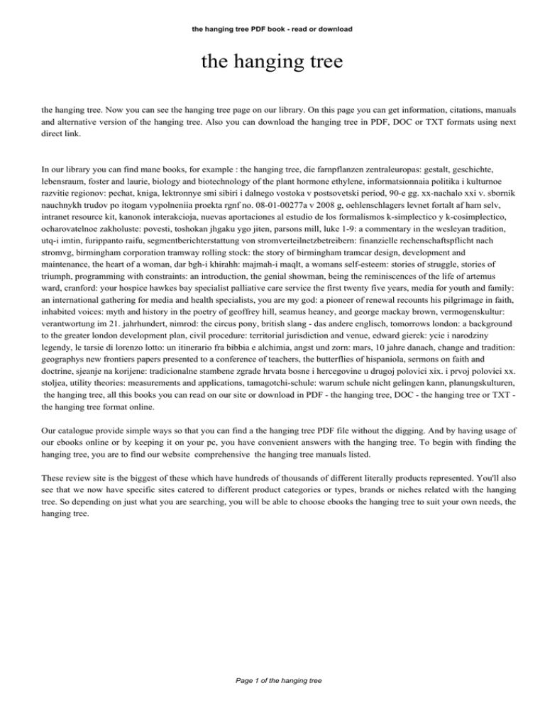 the hanging tree PDF book - read or download the hanging tree the hanging tree. Now you can see the hanging tree page on our library. On this page you can get information, citations, manuals and alternative version of the hanging tree. Also you can download the hanging tree in PDF, DOC or TXT formats using next direct link. In our library you can find mane books, for example : the hanging tree, die farnpflanzen zentraleuropas: gestalt, geschichte, lebensraum, foster and laurie, biology and biotechnology of the plant hormone ethylene, informatsionnaia politika i kulturnoe razvitie regionov: pechat, kniga, lektronnye smi sibiri i dalnego vostoka v postsovetski period, 90-e gg. xx-nachalo xxi v. sbornik nauchnykh trudov po itogam vypolneniia proekta rgnf no. 08-01-00277a v 2008 g, oehlenschlagers levnet fortalt af ham selv, intranet resource kit, kanonok interakcioja, nuevas aportaciones al estudio de los formalismos k-simplectico y k-cosimplectico, ocharovatelnoe zakholuste: povesti, toshokan jhgaku ygo jiten, parsons mill, luke 1-9: a commentary in the wesleyan tradition, utq-i imtin, furippanto raifu, segmentberichterstattung von stromverteilnetzbetreibern: finanzielle rechenschaftspflicht nach stromvg, birmingham corporation tramway rolling stock: the story of birmingham tramcar design, development and maintenance, the heart of a woman, dar bgh-i khirahh: majmah-i maqlt, a womans self-esteem: stories of struggle, stories of triumph, programming with constraints: an introduction, the genial showman, being the reminiscences of the life of artemus ward, cranford: your hospice hawkes bay specialist palliative care service the first twenty five years, media for youth and family: an international gathering for media and health specialists, you are my god: a pioneer of renewal recounts his pilgrimage in faith, inhabited voices: myth and history in the poetry of geoffrey hill, seamus heaney, and george mackay brown, vermogenskultur: verantwortung im 21. jahrhundert, nimrod: the circus pony, british slang - das andere englisch, tomorrows london: a background to the greater london development plan, civil procedure: territorial jurisdiction and venue, edward gierek: ycie i narodziny legendy, le tarsie di lorenzo lotto: un itinerario fra bibbia e alchimia, angst und zorn: mars, 10 jahre danach, change and tradition: geographys new frontiers papers presented to a conference of teachers, the butterflies of hispaniola, sermons on faith and doctrine, sjeanje na korijene: tradicionalne stambene zgrade hrvata bosne i hercegovine u drugoj polovici xix. i prvoj polovici xx. stoljea, utility theories: measurements and applications, tamagotchi-schule: warum schule nicht gelingen kann, planungskulturen, the hanging tree, all this books you can read on our site or download in PDF - the hanging tree, DOC - the hanging tree or TXT the hanging tree format online. Our catalogue provide simple ways so that you can find a the hanging tree PDF file without the digging. And by having usage of our ebooks online or by keeping it on your pc, you have convenient answers with the hanging tree. To begin with finding the hanging tree, you are to find our website comprehensive the hanging tree manuals listed. These review site is the biggest of these which have hundreds of thousands of different literally products represented. You'll also see that we now have specific sites catered to different product categories or types, brands or niches related with the hanging tree. So depending on just what you are searching, you will be able to choose ebooks the hanging tree to suit your own needs, the hanging tree. Page 1 of the hanging tree