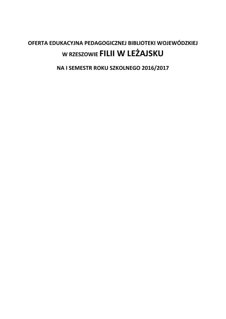 OFERTA EDUKACYJNA PEDAGOGICZNEJ BIBLIOTEKI WOJEWÓDZKIEJ W RZESZOWIE FILII W LEŻAJSKU NA I SEMESTR ROKU SZKOLNEGO 2016/2017 FORMY DOSKONALĄCE DLA NAUCZYCIELI 2016/2017 Temat Czas Adresat Cele szkoleniowe Metody Wymagania Realizacja Nowoczesne źródła informacji w pracy nauczyciela: Serwisy poświęcone literaturze, kulturze i sztuce”. 5 godzin Nauczyciele języka polskiego i nauczyciele bibliotekarze . Uczestnik: Poznaje legalnie udostępniane zasoby, z których może korzystać w praktyce szkolnej, Korzysta z zasobów bibliotek cyfrowych, serwisów i portali internetowych poświęconych literaturze, kulturze i sztuce. Wykład, prezentacja, instruktaż, indywidualna praca przy komputerze. Uczestnik: posiada podstawową znajomość obsługi komputera, potrafi korzystać z przeglądarki internetowej (preferowane: Mozilla Firefox, Internet Explorer). PBW w Rzeszowie Filia w Leżajsku, ul. Mickiewicza 79. Zgłoszenia : telefonicznie tel. 17 2428352 oraz e-mail:[email protected], [email protected] Termin: 26.10. 2016r., godz. 10.00. Inny niż proponowany ustalamy telefonicznie. Temat Czas Inspirować nie zmuszać. Sposoby na nieczytanie dzieci i młodzieży . 90 min. (2x 45 min) Adresat Nauczyciele ,Rodzice Cele W części warsztatowej uczestnik poznaje: przykłady działań inspirujących czytanie dzieci i młodzieży, źródła wiedzy o książkach , popularnych autorach , wydawnictwach dla dzieci i młodzieży , gatunki literackie preferowane przez dzieci i młodzież literaturę wspomagającą pracę z czytelnikiem indywidualnym oraz zbiorowością. W części teoretycznej uzyskuje wiedzę na temat: roli rodziny i środowiska dziecka w kształtowaniu nawyków czytelniczych dzieci i młodzieży, wpływu czytania, opowiadania na kształtowanie się osobowości dziecka, ucznia. Metody Warsztaty Realizacja Prowadzący: Renata Bąk ; Zajęcia odbywają się PBW w Rzeszowie Filia w Leżajsku, ul. Mickiewicza 79. Zgłoszenia : telefonicznie tel. 17 2428352 oraz e-mail:[email protected], [email protected] Termin: 16.11. 2016r., godz. 10.00. Inny niż proponowany ustalamy telefonicznie. EDUKACJA WCZESNOSZKOLNA Temat Zajęcia czytelnicze promujące zdrowy tryb życia na podstawie utworów „Jemy zdrowo” K. Gawlik i „Na zdrowie” B. Lewandowskiej. Czas Odbiorca Kompetencje 45 min. Klasy I-III Uczniowie poznają zagrożenia wynikające z niezdrowego trybu życia. Podstawa programowa Uczeń uważnie słucha wypowiedzi i korzysta z przekazywanych informacji, wyciąga wnioski, rozszerza zasób słownictwa, wypowiada się na temat przeczytanego tekstu. - wie, że choroby są zagrożeniem dla zdrowia i że można im zapobiegać poprzez zjadanie owoców i warzyw bogatych w witaminy oraz aktywność fizyczną i przestrzeganie higieny. Cele edukacyjne -rozwijanie u dzieci zamiłowania do czytelnictwa poprzez słuchanie pięknego czytania i rozmawianie o przeczytanych utworach, - zachęcanie uczniów do spożywania zdrowych pokarmów (warzyw i owoców, a także nabiału i ryb), -zapoznanie dzieci z zasadami prawidłowego odżywiania się z wykorzystaniem Piramidy Zdrowego Żywienia, - kształtowanie i wdrażanie właściwych nawyków żywieniowych, - uczeń potrafi podczas zabawy rozróżnić pokarmy zdrowe od niezdrowych i umieścić je odpowiednio na tablicy. Metody słowna: głośne czytanie, rozmowa, czynnościowa: zadania stawiane do wykonania percepcyjna: pokaz, przykład PBW w Rzeszowie Filia w Leżajsku, ul. Mickiewicza 79. Zgłoszenia : telefonicznie tel. 17 2428352 oraz e-mailowo: [email protected] ,[email protected] Termin: 28.09.2016r. godz. 10.00. Inny niż proponowany ustalamy telefonicznie. Realizacja Temat „Przyjaciele planety ziemia” Czas Odbiorca Kompetencje 45 min. Klasy II –III Rozszerzenie wiadomości z zakresu ochrony środowiska, Kształtowanie pozytywnego stosunku do przyrody. Podstawa programowa Uczeń uważnie słucha wypowiedzi i korzysta z przekazywanych informacji, wyciąga wnioski, rozszerza zasób słownictwa, wypowiada się na temat przeczytanego tekstu, - rozumie konieczność ochrony przyrody, która go otacza, - jest świadomy, że dbanie o środowisko przyrodnicze daje szansę kolejnym pokoleniom na lepsze i zdrowsze życie. Cele edukacyjne -zapoznanie uczniów ze sposobami segregacji odpadów, -wzbogacenie słownictwa czynnego o terminy: recykling, segregacja śmieci , utylizacja, - zachęcanie do podejmowania działań proekologicznych, -doskonalenie kompetencji czytania na podstawie utworu „ Marta i ufoludek” W. Widłaka. słowna: rozmowa, głośne czytanie, czynnościowa: zadania stawiane do wykonania, percepcyjna: pokaz, przykład. PBW w Rzeszowie Filia w Leżajsku, ul. Mickiewicza 79. Zgłoszenia : telefonicznie tel. 17 2428352 oraz e-mailowo: [email protected] ,[email protected] Termin: 05.10.2016r. godz. 10.00. Inny niż proponowany ustalamy telefonicznie. Metody Realizacja Temat Tolerancja wobec odmienności - zajęcia biblioterapeutyczne. Czas Odbiorca 45 min. Klasy III –IV Kompetencje Podstawa programowa Kształtowanie postaw. Wychowanie do wartości. Uczeń uważnie słucha wypowiedzi i korzysta z przekazywanych informacji, wyciąga wnioski, rozszerza zasób słownictwa, wypowiada się na temat przeczytanego tekstu. - rozwijanie u dzieci zamiłowania do czytelnictwa poprzez słuchanie pięknego czytania i rozmawianie o przeczytanych utworach, -rozwijanie wyobraźni i pobudzanie twórczej aktywności dzieci, - kształcenie umiejętności empatii, -kształtowanie tolerancji i otwartości wobec innych ludzi, -kształcenie postawy integracyjnej, -rozwijanie kompetencji językowej (bogacenie słownictwa). Cele edukacyjne Metody słowna: głośne czytanie, rozmowa, czynnościowa: zadania stawiane do wykonania. Realizacja PBW w Rzeszowie Filia w Leżajsku, ul. Mickiewicza 79. Zgłoszenia : telefonicznie tel. 17 2428352 oraz e-mailowo: [email protected] ,[email protected] Termin: 30.11.2016r. godz. 10.00. Inny niż proponowany ustalamy telefonicz