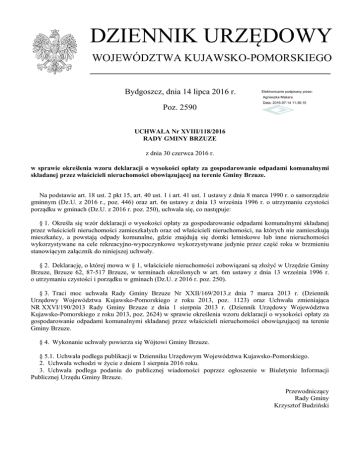 DZIENNIK URZĘDOWY WOJEWÓDZTWA KUJAWSKO-POMORSKIEGO Bydgoszcz, dnia 14 lipca 2016 r. Elektronicznie podpisany przez: Agnieszka Makara Poz. 2590 Data: 2016-07-14 11:36:15 UCHWAŁA Nr XVIII/118/2016 RADY GMINY BRZUZE z dnia 30 czerwca 2016 r. w sprawie określenia wzoru deklaracji o wysokości opłaty za gospodarowanie odpadami komunalnymi składanej przez właścicieli nieruchomości obowiązującej na terenie Gminy Brzuze. Na podstawie art. 18 ust. 2 pkt 15, art. 40 ust. 1 i art. 41 ust. 1 ustawy z dnia 8 marca 1990 r. o samorządzie gminnym (Dz.U. z 2016 r., poz. 446) oraz art. 6n ustawy z dnia 13 września 1996 r. o utrzymaniu czystości porządku w gminach (Dz.U. z 2016 r. poz. 250), uchwala się, co następuje: § 1. Określa się wzór deklaracji o wysokości opłaty za gospodarowanie odpadami komunalnymi składanej przez właścicieli nieruchomości zamieszkałych oraz od właścicieli nieruchomości, na których nie zamieszkują mieszkańcy, a powstają odpady komunalne, gdzie znajdują się domki letniskowe lub inne nieruchomości wykorzystywane na cele rekreacyjno-wypoczynkowe wykorzystywane jedynie przez część roku w brzmieniu stanowiącym załącznik do niniejszej uchwały. § 2. Deklarację, o której mowa w § 1, właściciele nieruchomości zobowiązani są złożyć w Urzędzie Gminy Brzuze, Brzuze 62, 87-517 Brzuze, w terminach określonych w art. 6m ustawy z dnia 13 września 1996 r. o utrzymaniu czystości i porządku w gminach (Dz.U. z 2016 r. poz. 250). § 3. Traci moc uchwała Rady Gminy Brzuze Nr XXII/169/2013.z dnia 7 marca 2013 r. (Dziennik Urzędowy Województwa Kujawsko-Pomorskiego z roku 2013, poz. 1123) oraz Uchwała zmieniająca NR XXVI/190/2013 Rady Gminy Brzuze z dnia 1 sierpnia 2013 r. (Dziennik Urzędowy Województwa Kujawsko-Pomorskiego z roku 2013, poz. 2624) w sprawie określenia wzoru deklaracji o wysokości opłaty za gospodarowanie odpadami komunalnymi składanej przez właścicieli nieruchomości obowiązującej na terenie Gminy Brzuze. § 4. Wykonanie uchwały powierza się Wójtowi Gminy Brzuze. § 5.1. Uchwała podlega publikacji w Dzienniku Urzędowym Województwa Kujawsko-Pomorskiego. 2. Uchwała wchodzi w życie z dniem 1 sierpnia 2016 roku. 3. Uchwała podlega podaniu do publicznej wiadomości poprzez ogłoszenie w Biuletynie Informacji Publicznej Urzędu Gminy Brzuze. Przewodniczący Rady Gminy Krzysztof Budziński Dziennik Urzędowy Województwa Kujawsko-Pomorskiego –2– Poz. 2590 załącznik do uchwały nr XVIII/118/2016 Rady Gminy Brzuze z dnia 30 czerwca 2016 r. Dziennik Urzędowy Województwa Kujawsko-Pomorskiego –3– Poz. 2590 Dziennik Urzędowy Województwa Kujawsko-Pomorskiego –4– Poz. 2590