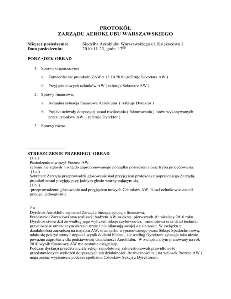 PROTOKÓŁ ZARZĄDU AEROKLUBU WARSZAWSKIEGO Miejsce posiedzenia: Data posiedzenia: Siedziba Aeroklubu Warszawskiego ul. Księżycowa 1 2010-11-23, godz. 1700 PORZĄDEK OBRAD 1. Sprawy organizacyjne a. Zatwierdzenie protokołu ZAW z 13.10.2010 (referuje Sekretarz AW ) b. Przyjęcie nowych członków AW ( referuje Sekretarz AW ) 2. Sprawy finansowe. a. Aktualna sytuacja finansowa Aeroklubu ( referuje Dyrektor ) b. Projekt uchwały dotyczącej zasad rozliczania ( fakturowania ) lotów wykonywanych przez członków AW. ( referuje Dyrektor ) 3. Sprawy różne. ––––––––––––––––– STRESZCZENIE PRZEBIEGU OBRAD (1.a.) Posiedzenie otworzył Prezesa AW, zebrani nie zgłosili uwag do zaproponowanego porządku posiedzenia oraz trybu procedowania. (1.a.) Sekretarz Zarządu przeprowadził głosowanie nad przyjęciem protokołu z poprzedniego Zarządu, protokół został przyjęty przy jednym głosie wstrzymującym się, (1.b. ) przeprowadzono głosowanie nad przyjęciem nowych Członków AW. Nowi członkowie zostali przyjęci jednogłośnie. 2.a. Dyrektor Aeroklubu zapoznał Zarząd z bieżącą sytuacja finansową. Przedstawił Zarządowi stan realizacji budżetu AW za okres pierwszych 10 miesięcy 2010 roku. Dyrektor stwierdził że według jego wyliczeń sekcje szybowcowa, samolotowa oraz dział techniki przyniosły w omawianym okresie straty i nie bilansują swojej działalności. W związku z działalnością zarządczą na majątku AW, oraz zysku wypracowanego przez Sekcje Spadochronową, udało się pokryć straty i uzyskać wynik dodatni bilansu, ale według Dyrektora sytuacja taka niesie poważne zagrożenie dla podstawowej działalności Aeroklubu. W związku z tym planowany na rok 2010 wynik finansowy AW nie zostanie osiągnięty. Podczas dyskusji przedstawiciele sekcji samolotowej zakwestionowali prawidłowość przedstawionych wyliczeń dotyczących ich działalności. Rozbieżności te ( na wniosek Prezesa AW ) mają zostać wyjaśnione podczas spotkania Członków Sekcji z Dyrektorem. 2.b. Dyrektor zaproponował wprowadzenie możliwości wystawiania faktur za loty nie komercyjne wykonywane przez Członków Aeroklubu. Zarząd upoważnił Dyrektora do wprowadzenie w życie złożonej propozycji z zastrzeżeniem jej zgodności z ustawą o rachunkowość, oraz posiadanymi certyfikatami przez AW. 3.a. Na wniosek sekcji szybowcowej Zarząd podjął uchwałę o sprzedaży 7 szybowców, środki uzyskane ze sprzedaży szybowców mają być wykorzystane na zakup nowych szybowców laminatowych dla sekcji. ( za uchwałą głosowało (5), przeciw głosowało ( 3) ( W. Siatkowski, M. Izydorczak, L. Przybylski ) wstrzymało się (2). Z proponowanych do sprzedaży 8 szybowców został wycofany 1 szybowiec Cobra 17. ( głosami za (4) przeciw (3) wstrzymało się (4) ). b. Sekretarz AW został zobowiązany do rozesłania Członkom Zarządu projekt umowy na wynajem hangaru na byłym lotnisku Gocław. Omówienie umowy i ewentualne głosowanie odbędzie się na następnym spotkaniu Zarządu. c. Zarząd ustalił termin następnego spotkania na dzień 14 grudnia. Spotkanie to będzie miało charakter uroczysty ze względu na zbliżające się Święta. Na tym posiedzenia zakończono. Nr uchwały 021/2010 023/2010 Tytuł uchwały W sprawie przyjęcia nowych członków AW w sprawie sprzedaży szybowców W załączeniu: a) Lista obecności b) Protokół z zebrania Sekcji Szybowcowej c) Uchwała Sekcji Szybowcowej (-) ___________________________ Adam Paska Sekretarz Zarządu Aeroklubu Warszawskiego Załącznik nr 2 3 zał. nr 1. zał. nr.4. zał. nr.5. (-) ___________________________ Gromosław Czempiński Prezes Zarządu Aeroklubu Warszawskiego Załącznik 2. Uchwała 022/2010 z dnia 23.11.2010 roku Zarządu Aeroklubu Warszawskiego. w sprawie przyjęcia nowych członków zwyczajnych Aeroklubu Warszawskiego Art. 1 Na podstawie §7 ust. 1 Statutu Aeroklubu Polskiego Zarząd AW przyjmuje się w poczet członków zwyczajnych następujące osoby: Sekcja Szybowcowa 1. Antoni Rola Sekcja Samolotowa 1. Robert Raczyński Uchwała wchodzi w życie z dniem podjęcia. (-) ___________________________ Adam Paska Sekretarz Zarządu Aeroklubu Warszawskiego (-) ___________________________ Gromosław Czempiński Prezes Zarządu Aeroklubu Warszawskiego Załącznik 3. Uchwała 023/2010 z dnia 23.11.2010 roku Zarządu Aeroklubu Warszawskiego. Art. 1 Na wniosek Sekcji Szybowcowej, na podstawie §32 ust. 2 pkt 8 Statutu Aeroklubu Polskiego Zarząd Aeroklubu Warszawskiego upoważnia Dyrektora AW do zawarcia umów sprzedaży następujących szybowców: 2 szybowców Jantar 1 o znakach rejestracyjnych Jantar 1 SP-2793 Jantar 1 SP-2891 Przeznaczeniu pozyskanych środków ze sprzedaży na zakup szybowców:Jantar Standard oraz Astir CS Jeans. 8 szybowców drewnianych: FOKA C FOKA 4A FOKA C PIRAT PIRAT PIRAT COBRA 15 SP-2375 SP-2524 SP-2512 SP-2565 SP-2680 SP-2882 SP-2924 Przeznaczeniu pozyskanych środków na zakup szybowców typu Astir CS Jeans. Art. 2 Wykonanie uchwały powierza się Dyrektorowi AW z uwzglednieniem prawa pierwokupu dla Członków AW. Uchwała wchodzi w życie z dniem podjęcia. (-) ___________________________ Adam Paska Sekretarz Zarządu Aeroklubu Warszawskiego (-) ___________________________ Gromosław Czempiński Prezes Zarządu Aeroklubu Warszawskiego Załącznik 4. Warszawa, 16.11.2010 r. Protokół z Zebrania Członków Sekcji Szybowcowej Aeroklubu Warszawskiego w dniu 16.11.2010 r. W dniu 16.11.2010 r. odbyło się Zebranie Członków Sekcji Szybowcowej Aeroklubu Warszawskiego. Obrady rozpoczęto o godzinie 18:300. W zebraniu wzięło udział 44 członków Sekcji Szybowcowej. Obrady otworzył i poprowadził Witold Walecki. Przedstawiono porządek obrad. 1. Decyzja w sprawie sprzedaży szybowców drewnianych oraz typu Jantar 1 oraz przeznaczeniu pozyskanych środków na zakupu szybowców typu Jantar Std oraz Astir CS Jeans 2. Omówienie zasad wykonywania prac przygotowawczych do sezonu