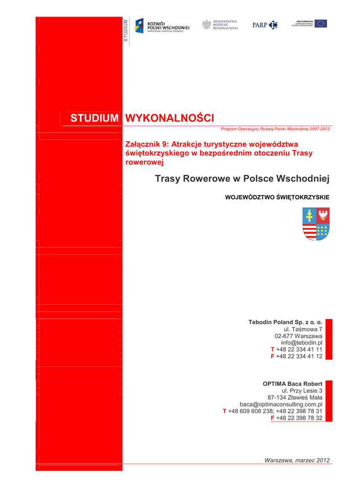 STUDIUM STUDIUM WYKONALNOŚCI Program Operacyjny Rozwój Polski Wschodniej 2007-2013 Załącznik 9: Atrakcje turystyczne województwa świętokrzyskiego w bezpośrednim otoczeniu Trasy rowerowej Trasy Rowerowe w Polsce Wschodniej WOJEWÓDZTWO ŚWIĘTOKRZYSKIE Tebodin Poland Sp. z o. o. ul. Taśmowa 7 02-677 Warszawa [email protected] T +48 22 334 41 11 F +48 22 334 41 12 OPTIMA Baca Robert ul. Przy Lesie 3 87-134 Zławieś Mała [email protected] T +48 609 608 238; +48 22 398 78 31 F +48 22 398 78 32 Warszawa, marzec 2012 Projekt i wykonanie ©2007 OPTIMA Baca Robert Ministerstwo Rozwoju Regionalnego ul. Wspólna 2/4, 00-926 Warszawa T +48 22 461 30 00; F +48 22 461 33 62 Województwo świętokrzyskie Studium Wykonawca przeprowadził w 2010 r. badania ankietowe na etapie IIa Studium Wykonalności, wśród rowerzystów1, z których wynika, że turysta rowerowy wskazał atrakcyjność krajobrazową oraz ilość zabytków kulturowych jako dwa najważniejsze czynniki wpływające na atrakcyjność trasy rowerowej. Aktywna forma spędzania wolnego czasu, jaką jest turystyka rowerowa, idzie w parze z chęcią nawiązania kontaktu z naturą oraz chęcią poznania bogatej historii regionu. O znacznej atrakcyjności krajobrazowej obszaru objętego projektem świadczy ilość parków krajobrazowych oraz obszarów chronionych NATURA 2000, które przecina projektowana trasa rowerowa. Przebieg trasy przez takie miasta jak Kielce czy Sandomierz pozwolą turyście poznać historię regionu, skorzystać z bogatej oferty kulturalnej oraz odpocząć od uciążliwości długiej jazdy na rowerze. Atrakcje województwa świętokrzyskiego zlokalizowane w otoczeniu trasy rowerowej Poniższa tabela poniżej przedstawia atrakcje turystyczne oraz zabytki zlokalizowane bezpośrednio przy Trasie rowerowej lub w jej otoczeniu. Lp. Nazwa Miejscowość Ulica X Y km Trasy 1 Gotycka Katedra p.w. NMP Sandomierz Katedralna 315781 694198 4 2 Zamek z Muzeum Okręgowym Sandomierz Zamkowa 315711 694038 4 3 Spichlerz Sandomierz Jana Pawła II 315671 694165 4 Synagoga z XVIII w Sandomierz Żydowska 316137 694084 5 Brama Opatowska z XIV w Sandomierz Opatowska 316351 694173 Sandomierz Długosza 315877 694351 Sandomierz Długosza 315853 694330 Sandomierz Zamkowa 315957 694098 6 7 8 Collegium Gostomianum z 1602 r. gotycki dom Długosza z XV w., pozostałości klasztoru dominikanów z I połowy XIII w 4 1 km na północ od 5 km Trasy 1 km na północ od 5 km Trasy ok. 0,5 km na północ od 5 kmTrasy ok. 0,2km na północ od 5 kmTrasy ok. 0,3 km na północ od 5 km Trasy ok. 0,2 km na północ od 5 km Trasy ok. 0,2 km na północ od Trasy ok. 0,3km na północ od 5 km Trasy ok. 0,3km na północ od 5 km Trasy ok. 0,3km na północ od 5 km Trasy ok. 0,3km na północ od 5 km Trasy ok. 0,3km na północ od 5 km Trasy ok. 0,2km na północ od 5 km Trasy ok. 0,2km na północ od 5 kmTrasy ok. 2,5 km na północ od 5 km Trasy ok. 0,5 km na północ od 5 km Trasy 9 ratusz z XIV w Sandomierz Rynek 316097 694175 10 Wąwóz Królowej Jadwigi Sandomierz Świętej Królowej Jadwigi 315708 693734 11 podziemna trasa turystyczna Sandomierz Oleśnicka 315708 693734 12 kościół p.w. św. Józefa Sandomierz Pl. Św. Wojciecha 316451 693981 13 zespół szpitala św. Ducha Sandomierz Opatowska 316166 694175 14 kamienica Oleśnickich Sandomierz Rynek 316113 694124 15 kamienice mieszczańskie Sandomierz Rynek 316063 694125 16 pałac Biskupi Sandomierz Mariacka 315918 694227 17 dzwonnica Sandomierz Mariacka 315830 694176 18 Góry Pieprzowe Sandomierz 317443 696962 19 Kościół św. Pawła Sandomierz Staromiejska 315953 693564 20 Kościół parafialny p.w. św. Jana Chrzciciela Skotniki Skotniki 49 308330 686735 21 Zespół pałacowo-parkowy Skotniki 308290 686743 16 km 22 Opactwo pocysterskie w Koprzywnicy 683059 ok. 2 km na południe od S07 Koprzywnica Krakowska 306952 16 km 1 Badania zostały przeprowadzone w dniu 30.04.2010r. w Warszawie przed wyruszeniem rowerzystów na zorganizowaną imprezę rowerową po ulicach Warszawy („Warszawska Masa Krytyczna”) oraz w dniach 1-3 maja 2010 roku w Sandomierzu, SkarżyskuKamiennej, Nowej Słupi, Świętym Krzyżu, Kielcach, Sielpi, Końskim i Włoszczowej, a także podczas badań w pociągach (na relacji łączonej Warszawa – Skarżysko Kamienna – Kielce – Włoszczowa – Warszawa), ze względu na wzmożony ruch rowerowy oraz turystyczny (weekend majowy). 2 Copyright 2012 © Tebodin Poland Sp. z o. o., OPTIMA Baca Robert Ministerstwo Rozwoju Regionalnego ul. Wspólna 2/4, 00-926 Warszawa T +48 22 461 30 00; F +48 22 461 33 62 Województwo świętokrzyskie 23 24 25 26 27 28 kościół p.w. Matki Boskiej Różańcowej z XVII w Kościół parafialny p.w. św. Józefa z połowy XVII w zespół dawnego klasztoru Dominikanów Kościół p.w. Przemienienia Pańskiego z 1843 r. kościół z XIII wieku w Goźlicach pozostałości zamku Ossolińskich Studium Koprzywnica Rynek 306154 682857 ok. 2 km na południe od S07 Klimontów Krakowska 314101 672987 32,5km Klimontów 312710 673216 Przybysławice 312762 676106 Goźlice 317432 674903 Ossolin 314982 676891 Ujazd 314982 676891 47 km Iwaniska 322756 660729 50 km 314885 644616 77 km 315797 639940 81,5 km ok. 0,5 km na południe od S11 ok. 0,5 km na północ od Trasy na wysokości 30 km ok. 3 km na północ od Trasy ok. 2 km na północ od Trasy 29 Ruiny zamku Krzyżtopór 30 kościół p.w. Katarzyny Aleksandryjskiej 31 Kościół p.w. Świętej Trójcy Raków 32 kościół p.w. św. Andrzeja z około 1620-1630r. Drogowole 33 Domy ariańskie z XVII w. Raków Kościelna/Sienieńskiego 315797 639940 77km 34 Kościół parafialny pod wezwaniem św. Małgorzaty Męczenniczki Pierzchnica Kościelna 17 315797 639940 ok. 3 km od 96 km Trasy 35 Pałac Biskupów Krakowskich Podzamcze 337219 604738 135,5 km ok. 2 km na zachód od S40 36 37 38 Sanktuarium w Piekoszowie Pałac i Muzeum Henryka Sienkiewicza w Oblęgorku Zakłady wielkopiecowe w Bobrzy 39 mur oporowy 40 Kośc
