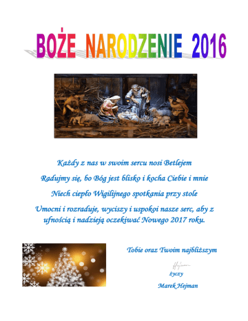 Każdy z nas w swoim sercu nosi Betlejem Radujmy się, bo Bóg jest blisko i kocha Ciebie i mnie Niech ciepło Wigilijnego spotkania przy stole Umocni i rozraduje, wyciszy i uspokoi nasze serc, aby z ufnością i nadzieją oczekiwać Nowego 2017 roku. Tobie oraz Twoim najbliższym życzy Marek Hejman