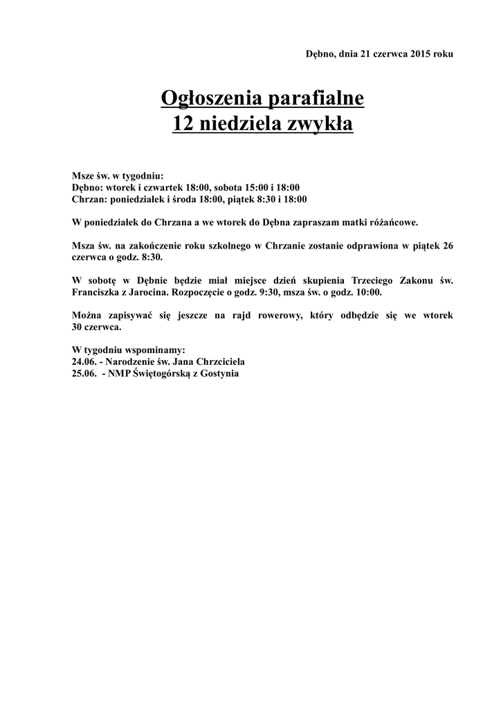 Dębno, dnia 21 czerwca 2015 roku Ogłoszenia parafialne 12 niedziela zwykła Msze św. w tygodniu: Dębno: wtorek i czwartek 18:00, sobota 15:00 i 18:00 Chrzan: poniedziałek i środa 18:00, piątek 8:30 i 18:00 W poniedziałek do Chrzana a we wtorek do Dębna zapraszam matki różańcowe. Msza św. na zakończenie roku szkolnego w Chrzanie zostanie odprawiona w piątek 26 czerwca o godz. 8:30. W sobotę w Dębnie będzie miał miejsce dzień skupienia Trzeciego Zakonu św. Franciszka z Jarocina. Rozpoczęcie o godz. 9:30, msza św. o godz. 10:00. Można zapisywać się jeszcze na rajd rowerowy, który odbędzie się we wtorek 30 czerwca. W tygodniu wspominamy: 24.06. - Narodzenie św. Jana Chrzciciela 25.06. - NMP Świętogórską z Gostynia Intencje mszalne 22.06. - 28.06.2015 Poniedziałek 22.06. 18:00 (msza zbiorowa za zmarłych) Wtorek 23.06. 18:00 (msza zbiorowa za zmarłych) Środa 24.06. 18:00 + Henryk Kierzkowski (10. r. śm.) i zm. z rodz. Nowaków i Kierzkowskich Czwartek 25.06. 18:00 + Stanisław Pietrzak – od Cichoniów z Klęki, Sobczaków z Witowa Piątek 26.06. 8:30 (Chrzan) + Marian Urbaniak – od nauczycieli i pracowników Szkoły Podstawowej w Chrzanie 18:00 + Alina i Feliks Majchrzak, Maria i Lucjan Bożejewicz, Zenon Krakowski, Franciszek Piętka Sobota 27.06. 15:00 (msza ślubna) Kira Kowalska i Michał Kempiński 18:00 + Władysław Grzeszczyk (15. r. śm.) i zm. z rodz. Grzeszczyków i Marczaków Niedziela 28.06. 8:00 + Zdzisław Kubiak (5. r. śm.) i zm. z rodz. Wasielewskich i Kubiaków 10:00 + Joanna, Jadwiga, Andrzej, Feliks Bandyk, Agata Kałuża, Teresa, Kazimierz Adamczak 12:00 + Danuta Domagała i zm. z rodz. Polaczyków Msza zbiorowa za zmarłych – Chrzan 22.06.2015, godz. 18:00 +Edmund Kluga – od Tomczaków, Sobowcewów, Pilarczyków, Tomaszewskich + Joanna Bandyk – od Bandyków ze Strzyżewka, Roberta Gościniaka z rodz., Mirosława Mareckiego z rodz. z Raszew + Damian Kardasz – od Leszka Kmiecia z rodz., Bogumiła Kmiecia z rodz. z Poznania + Edward Durczak – od Józefa Wiśniewskiego z rodz., Sołtysiakowej + Józef Rybka – od Pochów i Michalskich z Chociczy, Telegów ze Stęgoszy i Łuszczanowa, Majdeckich z Goliny + Stefan Główka – od Pawła Bandyka z rodz., Filipiaków z Chrzana i Wowrów z Dobrzycy, Warzywodów z Chrzana, Wiśniewskich, p. Sołtysiak, Paterków, Wandy Stojek + Stefan Grzebyszak – od Andraszaków i Koleckich + Marek Przybyła – od chrzestnego Zbigniewa i całej rodz. Majchrzaków, Eugeniusza i Roberta Majchrzaków z rodzinami, Grobelnych + Krystyna Szwajcak – od zespołu K.G.W. Chrzan + Kazimiera, Zdzisław, Franciszek Przybylscy + Władysław i Teresa Starosta + ks. Józef Kromski Msza zbiorowa za zmarłych – Dębno, 23.06.2015, godz. 18:00 +Kazimiera i Marian Różewscy - od Stefana i Teresy Krawczyków, Nowaków z Chwalęcina, Barbary i Stanisława Wolskich z rodz. i mieszkańców Dębna + Barbara Budzik – od Stamierowskich z Dębna + Joanna Misiak – od siostry Marii i chrześniaka Jacka