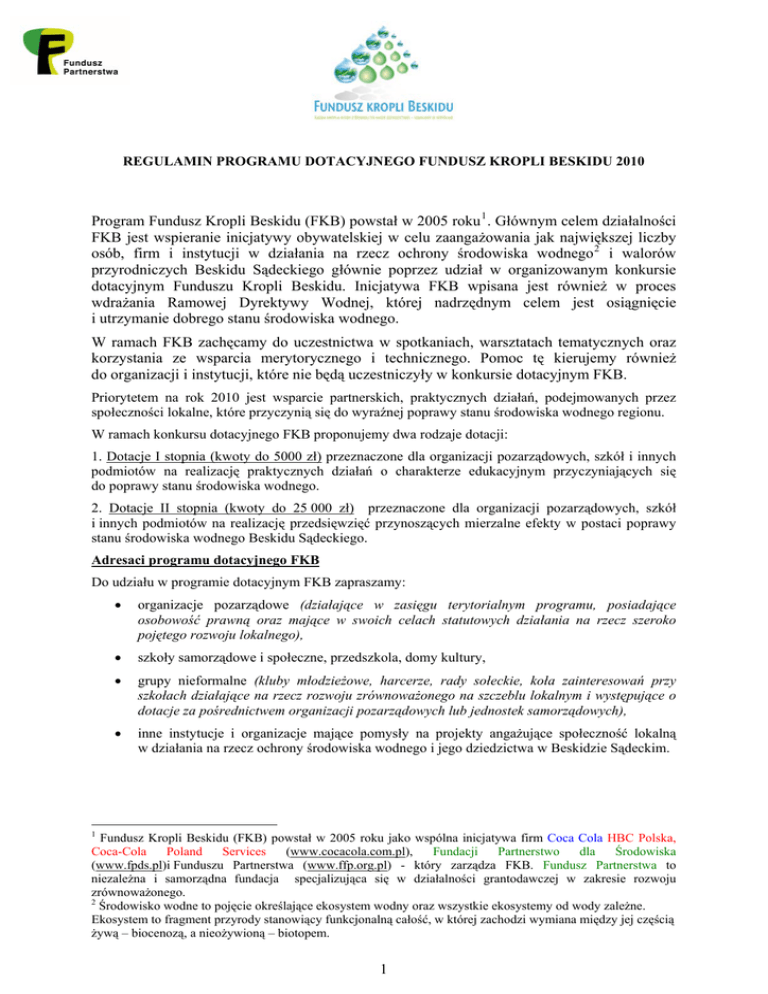 REGULAMIN PROGRAMU DOTACYJNEGO FUNDUSZ KROPLI BESKIDU 2010 Program Fundusz Kropli Beskidu (FKB) powstał w 2005 roku 1 . Głównym celem działalności FKB jest wspieranie inicjatywy obywatelskiej w celu zaangażowania jak największej liczby osób, firm i instytucji w działania na rzecz ochrony środowiska wodnego 2 i walorów przyrodniczych Beskidu Sądeckiego głównie poprzez udział w organizowanym konkursie dotacyjnym Funduszu Kropli Beskidu. Inicjatywa FKB wpisana jest również w proces wdrażania Ramowej Dyrektywy Wodnej, której nadrzędnym celem jest osiągnięcie i utrzymanie dobrego stanu środowiska wodnego. W ramach FKB zachęcamy do uczestnictwa w spotkaniach, warsztatach tematycznych oraz korzystania ze wsparcia merytorycznego i technicznego. Pomoc tę kierujemy również do organizacji i instytucji, które nie będą uczestniczyły w konkursie dotacyjnym FKB. Priorytetem na rok 2010 jest wsparcie partnerskich, praktycznych działań, podejmowanych przez społeczności lokalne, które przyczynią się do wyraźnej poprawy stanu środowiska wodnego regionu. W ramach konkursu dotacyjnego FKB proponujemy dwa rodzaje dotacji: 1. Dotacje I stopnia (kwoty do 5000 zł) przeznaczone dla organizacji pozarządowych, szkół i innych podmiotów na realizację praktycznych działań o charakterze edukacyjnym przyczyniających się do poprawy stanu środowiska wodnego. 2. Dotacje II stopnia (kwoty do 25 000 zł) przeznaczone dla organizacji pozarządowych, szkół i innych podmiotów na realizację przedsięwzięć przynoszących mierzalne efekty w postaci poprawy stanu środowiska wodnego Beskidu Sądeckiego. Adresaci programu dotacyjnego FKB Do udziału w programie dotacyjnym FKB zapraszamy: organizacje pozarządowe (działające w zasięgu terytorialnym programu, posiadające osobowość prawną oraz mające w swoich celach statutowych działania na rzecz szeroko pojętego rozwoju lokalnego), szkoły samorządowe i społeczne, przedszkola, domy kultury, grupy nieformalne (kluby młodzieżowe, harcerze, rady sołeckie, koła zainteresowań przy szkołach działające na rzecz rozwoju zrównoważonego na szczeblu lokalnym i występujące o dotacje za pośrednictwem organizacji pozarządowych lub jednostek samorządowych), inne instytucje i organizacje mające pomysły na projekty angażujące społeczność lokalną w działania na rzecz ochrony środowiska wodnego i jego dziedzictwa w Beskidzie Sądeckim. 1 Fundusz Kropli Beskidu (FKB) powstał w 2005 roku jako wspólna inicjatywa firm Coca Cola HBC Polska, Fundacji Partnerstwo dla Środowiska Coca-Cola Poland Services (www.cocacola.com.pl), (www.fpds.pl)i Funduszu Partnerstwa (www.ffp.org.pl) - który zarządza FKB. Fundusz Partnerstwa to niezależna i samorządna fundacja specjalizująca się w działalności grantodawczej w zakresie rozwoju zrównoważonego. 2 Środowisko wodne to pojęcie określające ekosystem wodny oraz wszystkie ekosystemy od wody zależne. Ekosystem to fragment przyrody stanowiący funkcjonalną całość, w której zachodzi wymiana między jej częścią żywą – biocenozą, a nieożywioną – biotopem. 1 Zasięg terytorialny Program FKB obejmuje cztery gminy w Beskidzie Sądeckim położone na terenie Popradzkiego Parku Krajobrazowego: Krynica Zdrój, Muszyna, Piwniczna Zdrój i Rytro. Dopuszcza się możliwość partnerskich projektów z udziałem organizacji z terenu innych gmin w granicach hydrograficznych zlewni Popradu. Jednak partnerem wiodącym (wnioskodawcą) powinna być organizacja z terenu gmin: Krynica Zdrój, Muszyna, Rytro lub Piwniczna Zdrój. Przedmiot programu dotacyjnego Funduszu Kropli Beskidu 1. Dotacje I stopnia (kwoty do 5000 zł) przeznaczone w szczególności do szkół Przedmiotem dotacji I stopnia będą praktyczne inicjatywy obywatelskie realizowane w przestrzeni publicznej, które przyczynią się do poprawy stanu środowiska wodnego i ochrony jego dziedzictwa. Może to być np.: a. udostępnienie turystom miejsc ciekawych pod względem ekologicznym, związanych ze środowiskiem wodnym i z jego szeroko pojętym dziedzictwem przyrodniczo-kulturowym źródła, potoki, wodospady, mofety itp. b. tworzenie ścieżek dydaktycznych wraz z programami dydaktycznymi dotyczącymi ochrony środowiska wodnego c. poprawa naturalnych miejsc życia i rozrodu fauny i flory wodnej (np. odtwarzanie i/lub ochrona organizmów wodnych i zależnych od wody, działania na rzecz mikroretencji, w tym oczka wodne) d. spisanie i upowszechnienie historii oraz miejsc związanych z wykorzystaniem wód naturalnych (np. muzeum wody, powrót do starych zawodów związanych z dziedzictwem wodnym, spisanie historii miejsc związanych z dziedzictwem wodnym) e. organizacja i prowadzenie wydarzeń, konkursów, programów edukacyjnych mających na celu uwrażliwienie na konieczność poszanowania i ochrony środowiska wodnego f. działania edukacyjne w zakresie oszczędzania i monitorowania zużycia wody (promowanie zachowań ograniczających zużycie wody, np. gromadzenie i wykorzystanie w gospodarstwie domowym wody deszczowej, stosowanie urządzeń oszczędzających wodę, itp.) oraz oczyszczanie konkretnych zbiorników wodnych i ich okolic (oczka wodne, strumyki, rzeki) itp. 2. Dotacje II stopnia (kwoty do 25 000 zł) przeznaczone dla organizacji pozarządowych, szkół i innych podmiotów na realizację przedsięwzięć podejmowanych w przestrzeni publicznej, bezpośrednio przyczyniających się do ochrony i poprawy stanu środowiska wodnego terenu objętego konkursem dotacyjnym FKB. Planowane działania muszą być zgodne z wymogami ochrony środowiska i Ramową Dyrektywą Wodną oraz zmierzać do poprawy stanu środowiska wodnego. Może to być np.: a. przywracanie i zwiększanie naturalnej retencji dolinowej (np. zalesianie obszarów, odtwarzanie połączeń istniejącego koryta ze starorzeczami, odtwarzanie korytarzy ekologicznych w dolinie rzek ) b. zagospodarowanie i ochrona naturalnych wypływów wód