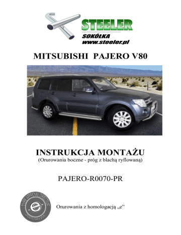 MITSUBISHI PAJERO V80 INSTRUKCJA MONTAŻU (Orurowania boczne - próg z blachą ryflowaną) PAJERO-R0070-PR Orurowania z homologacją „e” Wykaz elementów orurowania: 1. Stopień boczny (szt. 2) Lewy + Prawy 2. Zamocowanie dolne (szt. 6) 3 Lewe + 3 Prawe Wykaz elementów łącznych: Śruby: M6x25- szt.12 (krzyżak) M10x25- szt.12 Nakrętki: M6- szt.12 M10- szt.12 Podkładki: Ø6,5- szt.12 Ø 11- szt.24 (powiększona) Czas montażu UWAGA: Folię usunąć dopiero po montażu! Montaż orurowania : PAJERO-R0070-PR PRAWA STRONA AUTA: (Lewą stronę należy wykonać w odbiciu lustrzanym) Prawa strona orurowania: