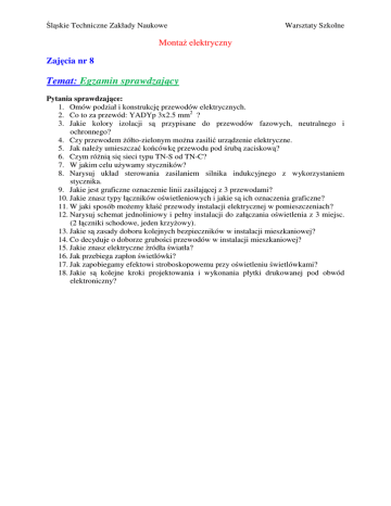 Śląskie Techniczne Zakłady Naukowe Opracował mgr inŜ. Maciej Czakański Warsztaty Szkolne MontaŜ elektryczny Zajęcia nr 8 Temat: Egzamin sprawdzający Pytania sprawdzające: 1. Omów podział i konstrukcję przewodów elektrycznych. 2. Co to za przewód: YADYp 3x2.5 mm2 ? 3. Jakie kolory izolacji są przypisane do przewodów fazowych, neutralnego i ochronnego? 4. Czy przewodem Ŝółto-zielonym moŜna zasilić urządzenie elektryczne. 5. Jak naleŜy umieszczać końcówkę przewodu pod śrubą zaciskową? 6. Czym róŜnią się sieci typu TN-S od TN-C? 7. W jakim celu uŜywamy styczników? 8. Narysuj układ sterowania zasilaniem silnika indukcyjnego z wykorzystaniem stycznika. 9. Jakie jest graficzne oznaczenie linii zasilającej z 3 przewodami? 10. Jakie znasz typy łączników oświetleniowych i jakie są ich oznaczenia graficzne? 11. W jaki sposób moŜemy kłaść przewody instalacji elektrycznej w pomieszczeniach? 12. Narysuj schemat jednoliniowy i pełny instalacji do załączania oświetlenia z 3 miejsc. (2 łączniki schodowe, jeden krzyŜowy). 13. Jakie są zasady doboru kolejnych bezpieczników w instalacji mieszkaniowej? 14. Co decyduje o doborze grubości przewodów w instalacji mieszkaniowej? 15. Jakie znasz elektryczne źródła światła? 16. Jak przebiega zapłon świetlówki? 17. Jak zapobiegamy efektowi stroboskopowemu przy oświetleniu świetlówkami? 18. Jakie są kolejne kroki projektowania i wykonania płytki drukowanej pod obwód elektroniczny?