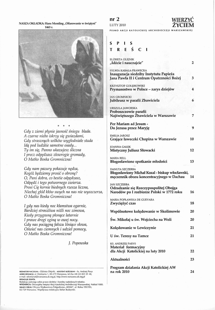 nr 2 NASZA OKLADKk Hans Memling ,Ohmwade w Wi&h" 1463 r, ~IE_]RZ~ ZYCIEM LUTY 2010 E ~ B I E T AOLEJMIK ,,Idicie i nauczajcie" SYL.WIA KABAtA-FRAWECKA Inauguracja aiedziby Instytutu Papieia Jana Pawla I1 i Centrum OpabznoSci Boiej 3 WIZYSrnOF GOtFBIOWSKI Pryrnasostwo w Polsce - zarys dziej6w 4 JAN GROMNICKI Jubileusz w parafii Zbawiciela URSZuLa JAWORSKA 1 I * Y Y Gdy z ziemi ptynie jasnos'c' Sniegu blada. A czarne niebo iskuzy sif gwiazdami, Gdy strnsznych wilk6w wygjodniate stadu Idq pod ludzkie samofne osndy... Ty im sig, Panno ukazujesz s'liczna I yrecz odpedzasz ztowrogie gromady, 0 Matko Boska Gromniczna! " Bardziej straszliwa niili noc zimowa, Kiedy paygusnq pjonqce latarnie I prawe drogi z g i q w owej nocy. Gdy nas pociqgnq fulszu ls'niqce sIowa, OSwiec' nas ciernnych i udziel pomocy, 7 Per Mariam ad Jesvm Do Jezusa p m Ma@$ 9 EMILIA JAROSZ Grajqce laweczki Chopina w Warszawie Mistymy Juliusz Slowacki MARIA E L L BlogoJ a w h e spotkanie d o d oki DANUTA SZCZERBA ~~ - JAN SZUERBA , I Odradzanie siq Rzeczypospolitej Obojga Narod6w po I rozbiorze Pelski w 1772 roku 16 Zwyciqiyi czas 18 Wsp6lnotowe kolqdowanie w Skolimowie 20 Sw. Mikolaj u gw. Wojciecha na Woli 20 Kolqdowanie w Lewiczynie 21 Materia1 formacyjny dla Akcji KatoIickiej na luty 2010 RFMGUJE ZEI& Redakcla sastnega wrbie p r a m skr6tbw i h h y nadeslanych tekst6w. WnAWC4: D~ecezralnylnrtylut Akcji Yatdickiej Archid~ecezjiWarvamkiq NaMad 1W. 5KtAD I DRUK: Ollcyna Wydawni~o-PollgraticznaADAM', ul Rolna 191/193, 112-72Y Warszawa Wspbf~racaredakqlna Stefan Budq6sk1 13 Blcpslawiony Kozal biskup wldawski, mqczennik obozu koncmtracyjnego w Dachau 14 KS.ANDRZEJ PARYS R E D ~ R N A C Z E M -Elzbieta Olejnk; mmr &ELNYks Andrrej Pa+ AORES REDAuql: ul Dz~ekania1, 00-279 Warszawa, telJfax 148 2 2 ) 831 01 48, e.ma~lsekretariat@waruawa ak.org pl, hnp~/lmnv.warrzawaakorg.pl 10 JOANNA GALEK Gdy nam pazury pokazuje ngdzu, K ~ g 6 zbedziemy prosic* o obronf ? 0, Pani dobra, co best ie odpgdzasz, Odp~dz'i tego pofwornego zwierza. Prosi Cig kornie biednych rzesza Eiczna, Niechtaj glbd k l h swych na nlas nie wyszczerza, 0 Ma tko B o s h Gromniczna! 1gdy nas kiedy noc ktamstwa iprnie, Proboszczowie parafii NajSwiqtszego ZbawicieIa w Warszawie 1 Pmpam dzialania Akcji Katolickiej AW na rok 2010
