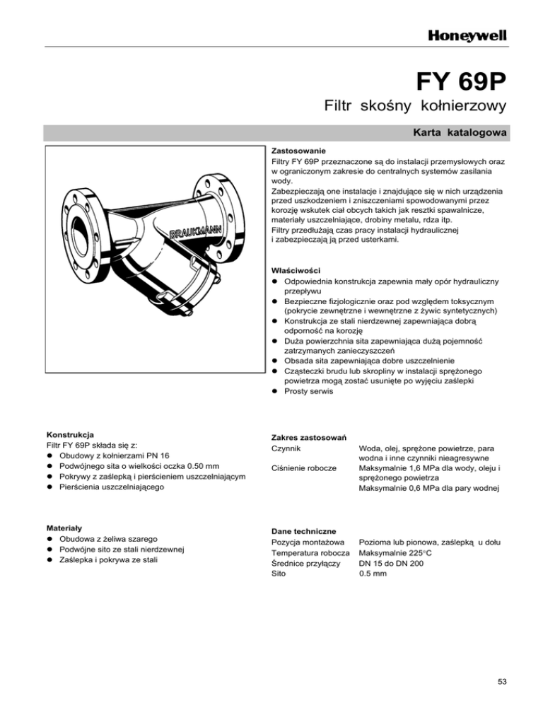 FY 69P Filtr skośny kołnierzowy Karta katalogowa Zastosowanie Filtry FY 69P przeznaczone są do instalacji przemysłowych oraz w ograniczonym zakresie do centralnych systemów zasilania wody. Zabezpieczają one instalacje i znajdujące się w nich urządzenia przed uszkodzeniem i zniszczeniami spowodowanymi przez korozję wskutek ciał obcych takich jak resztki spawalnicze, materiały uszczelniające, drobiny metalu, rdza itp. Filtry przedłużają czas pracy instalacji hydraulicznej i zabezpieczają ją przed usterkami. Właściwości z Odpowiednia konstrukcja zapewnia mały opór hydrauliczny przepływu z Bezpieczne fizjologicznie oraz pod względem toksycznym (pokrycie zewnętrzne i wewnętrzne z żywic syntetycznych) z Konstrukcja ze stali nierdzewnej zapewniająca dobrą odporność na korozję z Duża powierzchnia sita zapewniająca dużą pojemność zatrzymanych zanieczyszczeń z Obsada sita zapewniająca dobre uszczelnienie z Cząsteczki brudu lub skropliny w instalacji sprężonego powietrza mogą zostać usunięte po wyjęciu zaślepki z Prosty serwis Konstrukcja Filtr FY 69P składa się z: z Obudowy z kołnierzami PN 16 z Podwójnego sita o wielkości oczka 0.50 mm z Pokrywy z zaślepką i pierścieniem uszczelniającym z Pierścienia uszczelniającego Zakres zastosowań Czynnik Materiały z Obudowa z żeliwa szarego z Podwójne sito ze stali nierdzewnej z Zaślepka i pokrywa ze stali Dane techniczne Pozycja montażowa Temperatura robocza Średnice przyłączy Sito Ciśnienie robocze Woda, olej, sprężone powietrze, para wodna i inne czynniki nieagresywne Maksymalnie 1,6 MPa dla wody, oleju i sprężonego powietrza Maksymalnie 0,6 MPa dla pary wodnej Pozioma lub pionowa, zaślepką u dołu Maksymalnie 225°C DN 15 do DN 200 0.5 mm 53 Zasada działania Czynnik przepływając przez filtr FY 69P w kierunku oznaczonym strzałką przechodzi przez podwójne sito o dużej powierzchni od wewnątrz na zewnątrz pozostawiając zanieczyszczenia na ściance sita. Zgromadzone zanieczyszczenia mogą być w prosty sposób usunięte podczas czyszczenia sita. W celu ułatwienia odprowadzenia zanieczyszczeń lub skroplin z instalacji sprężonego powietrza - dodatkowo należy zamontować zawór w miejsce zaślepki pokrywy. Oznaczenie: FY 69P - ... A = Z podwójnym sitem, oczek 0.50 mm wielkość Wielkość przyłącza R Nominalna wielkość Przybliżony ciężar Wymiary Wartość Zeta 54 DN (kg) (mm) L H R F 15 2.0 20 2.6 25 3.8 32 6.3 40 7.4 50 10.4 65 15 80 22 100 30 125 45 150 66 200 144 130 64 3 /8 " 95 1.4 150 83 3 /8 " 105 1.4 160 90 3 /8 " 115 1.5 180 108 3 /8 " 140 1.6 200 120 3 /8 " 150 1.6 230 143 3 /8 " 165 1.8 290 179 1 /2 " 185 1.9 310 203 1 /2 " 200 1.7 350 222 1" 220 1.8 400 267 1" 230 1.9 480 320 1" 285 1.7 600 382 1" 340 1.7 Przykład instalacji Zasady instalacji z W miarę możliwości należy instalować poziomo z zaślepką skierowaną ku dołowi Położenie takie zapewnia największą efektywność filtrowania Przy instalacji na wznoszących się przewodach rurowych brud nie będzie zbierał się na sicie z Zamontowanie zaworów odcinających Umożliwia to szybkie czyszczenie filtra z Zapewnienie dostępu do urządzenia Tak by możliwe było łatwe wyjęcie sita Ułatwia konserwację i kontrolę Typowe zastosowania Filtry FY 69P powinny być montowane na wejściach do instalacji i urządzeń. Mogą one być stosowane w przemyśle, gdzie wykorzystywane są w ramach swoich parametrów technicznych. Filtry powinny zostać zainstalowane: z W miejscach, w których obecność zanieczyszczeń może spowodować wcześniejsze zniszczenie urządzeń i instalacji z W miejscach, w których istnieje możliwość zablokowania urządzeń lub instalacji z W miejscach, w których obecność zanieczyszczeń może spowodować korozję Kontrola i konserwacja Norma DIN 1988, Część 8 określa że powyższe operacje powinny być przeprowadzane regularnie. Zalecane jest określenie terminarza konserwacji. Działania Okres Wykonane przez Kontrola Kontrola położenia i szczelności wkładu sita i pierścienia uszczelniającego Zgodnie z warunkami pracy Użytkownik lub specjalista Kontrola i konserwacja Czyszczenie lub wymiana sita Zgodnie z warunkami pracy Użytkownik lub specjalista Czyszczenie lub wymiana pierścienia uszczelniającego 55 Części zamienne dla filtrów FY 69P Honeywell Sp. z o. o. ul. Domaniewska 41, 02-672 WARSZAWA (48)(22) 606 09 00; Fax (48)(22) 606 09 01 56 Opis Wielkość Nr części c Wymienne sito DN 15 DN 20 DN 25 DN 32 DN 40 DN 50 DN 65 DN 80 DN 100 DN 125 DN 150 DN 200 ES 69 Y-15 ES 69 Y-20 ES 69 Y-25 ES 69 Y-32 ES 69 Y-40 ES 69 Y-50 ES 69 Y-65 ES 69 Y-80 ES 69 Y-100 ES 69 Y-125 ES 69 Y-150 ES 69 Y-200 d Uszczelka pokrywy DN 15 DN 20 DN 25 DN 32 DN 40 DN 50 DN 65 DN 80 DN 100 DN 125 DN 150 DN 200 5782400 5782500 5782600 5782700 5782800 5782900 5783000 5783100 5783200 5783300 5783400 5783500 e Uszczelka zaślepki DN 15 DN 20 DN 25 DN 32 DN 40 DN 50 DN 65 DN 80 DN 100 DN 125 DN 150 DN 200 5783600 5783600 5783600 5783600 5783600 5783600 5783400 5783400 5783700 5783700 5783700 5783700 Komfort i oszczêdnoœæ http://www.honeywell.com.pl 57