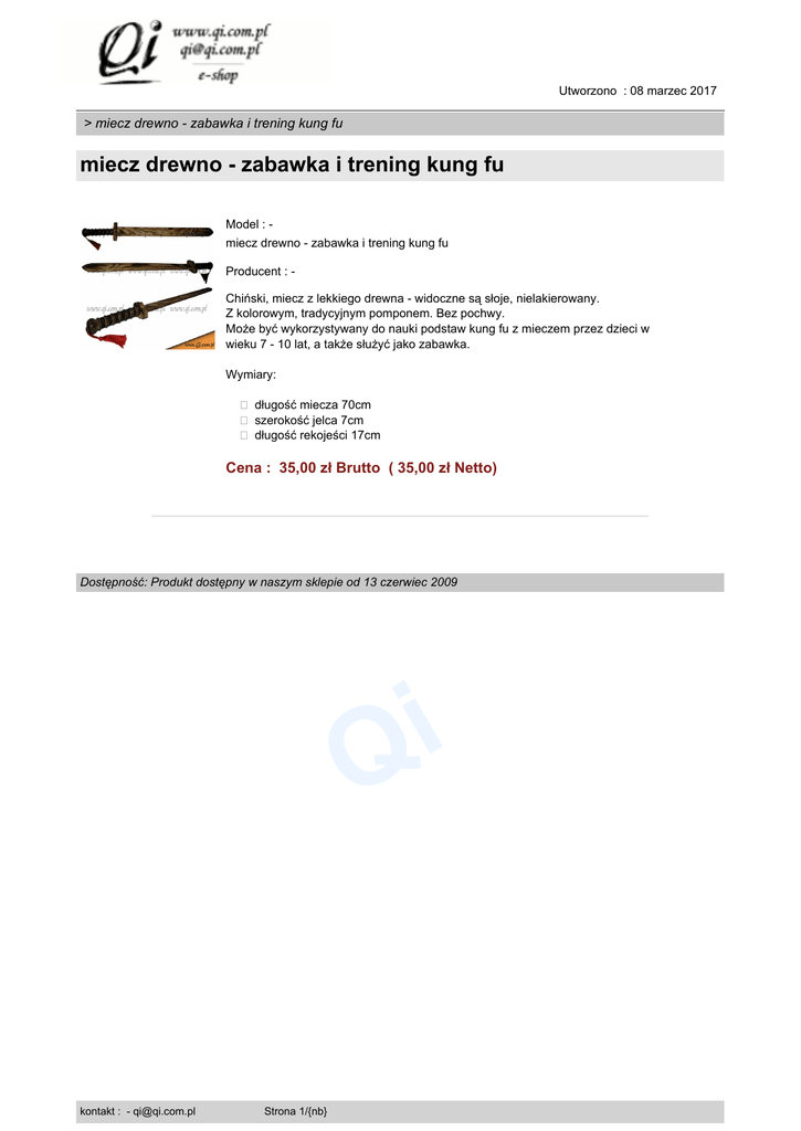 Utworzono : 08 marzec 2017 > miecz drewno - zabawka i trening kung fu miecz drewno - zabawka i trening kung fu Model : miecz drewno - zabawka i trening kung fu Producent : Chiński, miecz z lekkiego drewna - widoczne są słoje, nielakierowany. Z kolorowym, tradycyjnym pomponem. Bez pochwy. Może być wykorzystywany do nauki podstaw kung fu z mieczem przez dzieci w wieku 7 - 10 lat, a także służyć jako zabawka. Wymiary: � długość miecza 70cm � szerokość jelca 7cm � długość rekojeści 17cm Cena : 35,00 zł Brutto ( 35,00 zł Netto) Dostępność: Produkt dostępny w naszym sklepie od 13 czerwiec 2009 i Q kontakt : - [email protected] Strona 1/{nb}